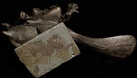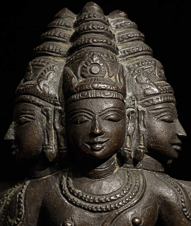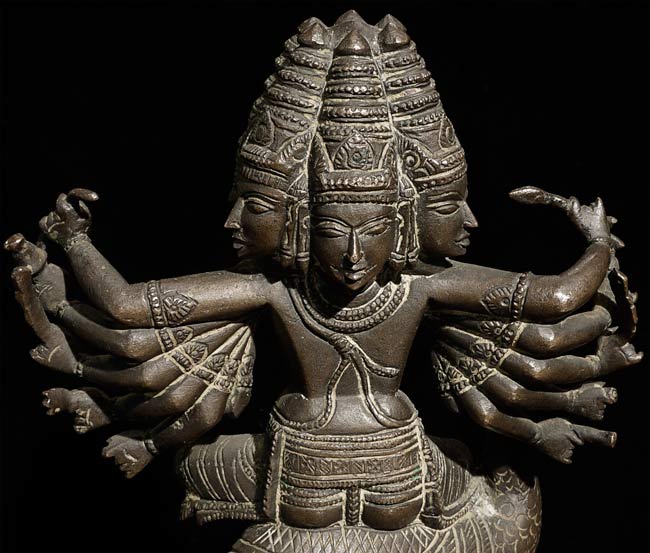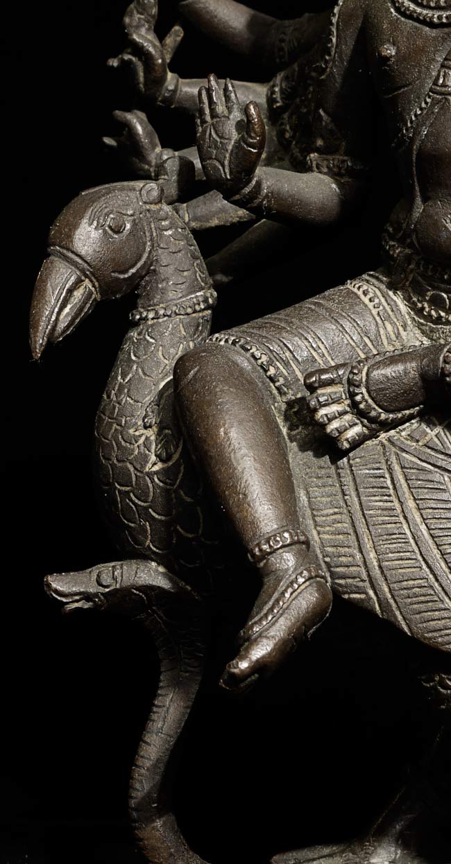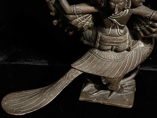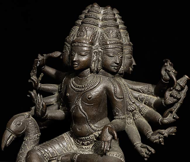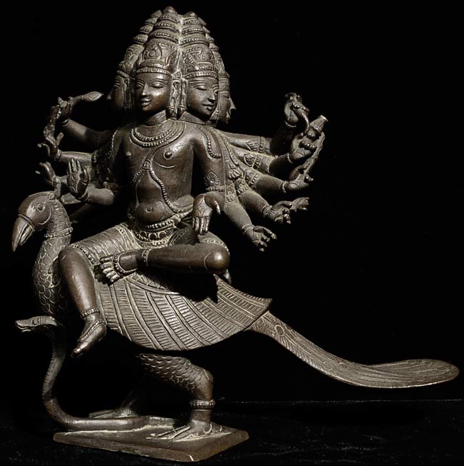 Perhaps the most finely sculpted Indian bronze I have owned. Antique, though I am unsure how to date. Note the detail down to the faces of the bird and snake, hands and feet, pattern on the peacock, etc. Complex, with 6 (each beautiful)heads and 12 arms - powerful! 6.5" tall, 6.5" long, approximately 3" deep. Immaculate condition!