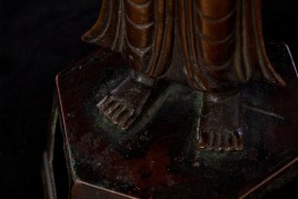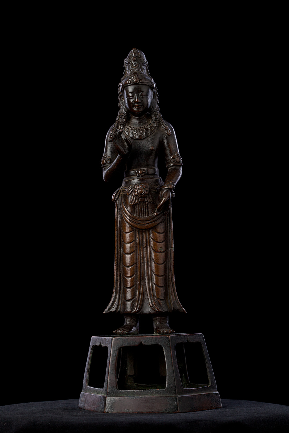 A rare 13th/14thC Acue Quanyin from the Dali Kingdom, which flourished in Southern China (Yunnan) 1,000 years ago. Very few bronzes have survived from this period- especially as nice as this. This piece is from the very end of the period, from when the Mongols invaded, and the faces of the Acue Quanyins became rounder and the bodies less elongated. There is a very closely related example in the Asian Art Museum in San Francisco. Smaller and not as early than the other related piece I have listed, but prettier. The patina is wonderful. This piece measures 11" tall on its integral original base. From my original personal collection, which I have owned 25+ years. This piece has real charisma and is one of my all time favorites.