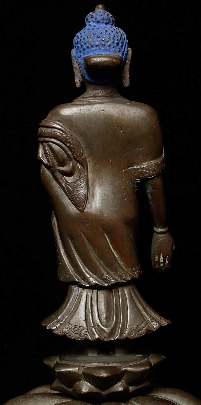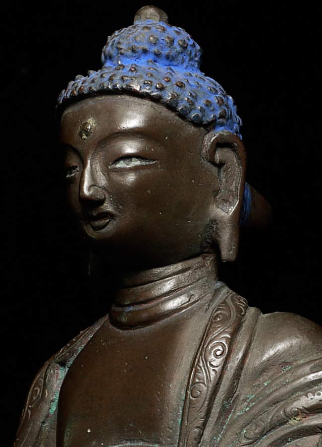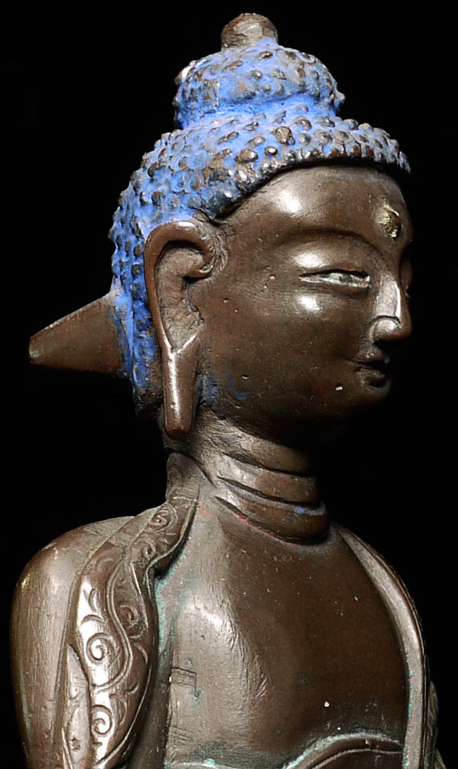 Vintage/Old Nepalese or Tibetan Buddha. Huge base- at first I thought it was a marriage, but now believe it is probably original to the piece. 6.5" tall, sitting on a base that is 2.75" tall with a diameter of 5.25".