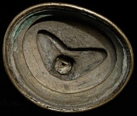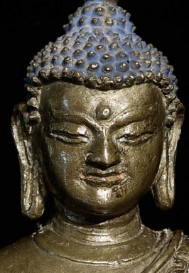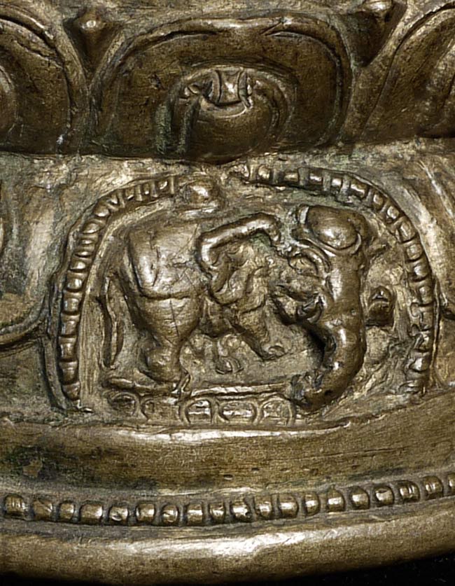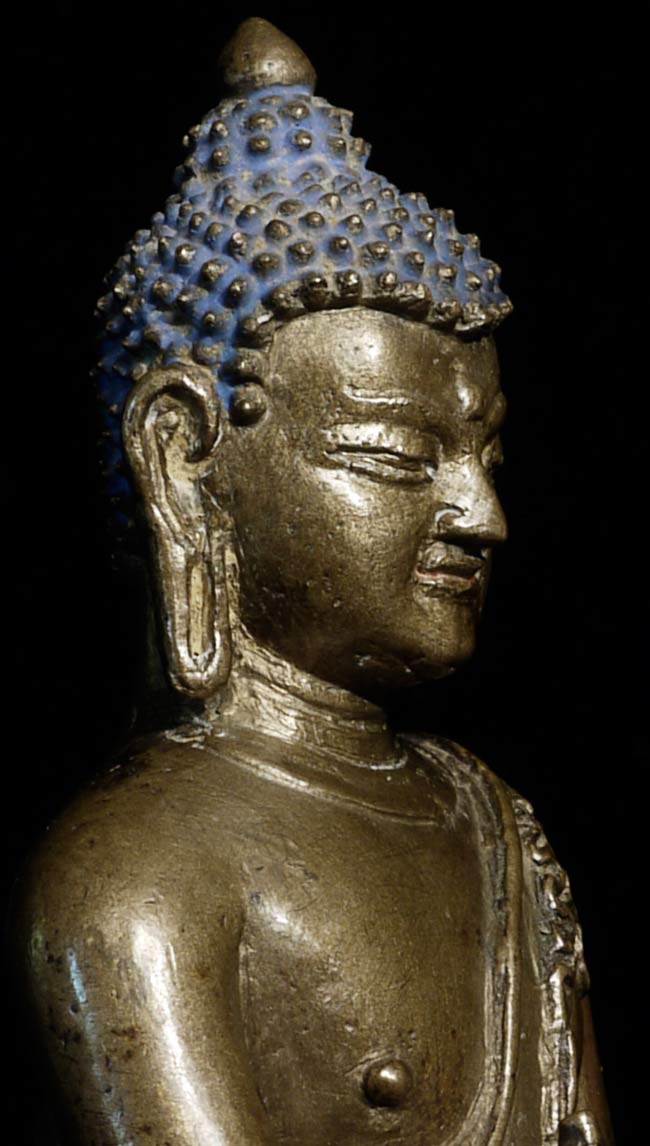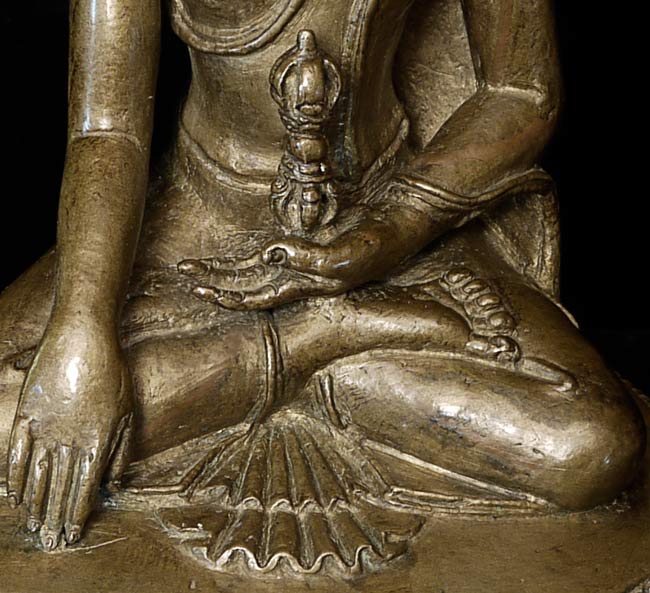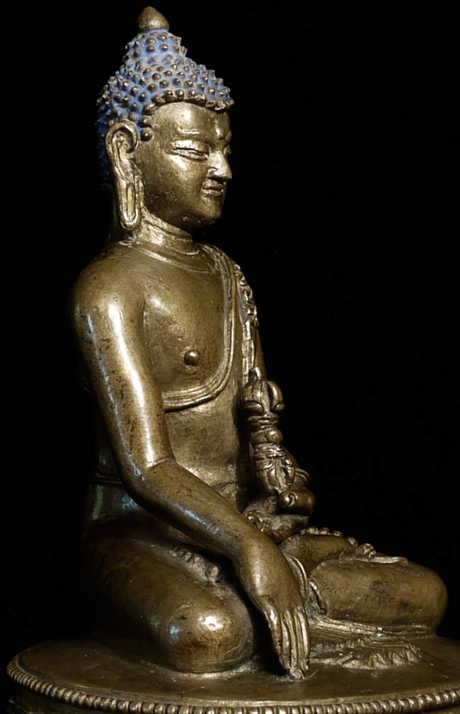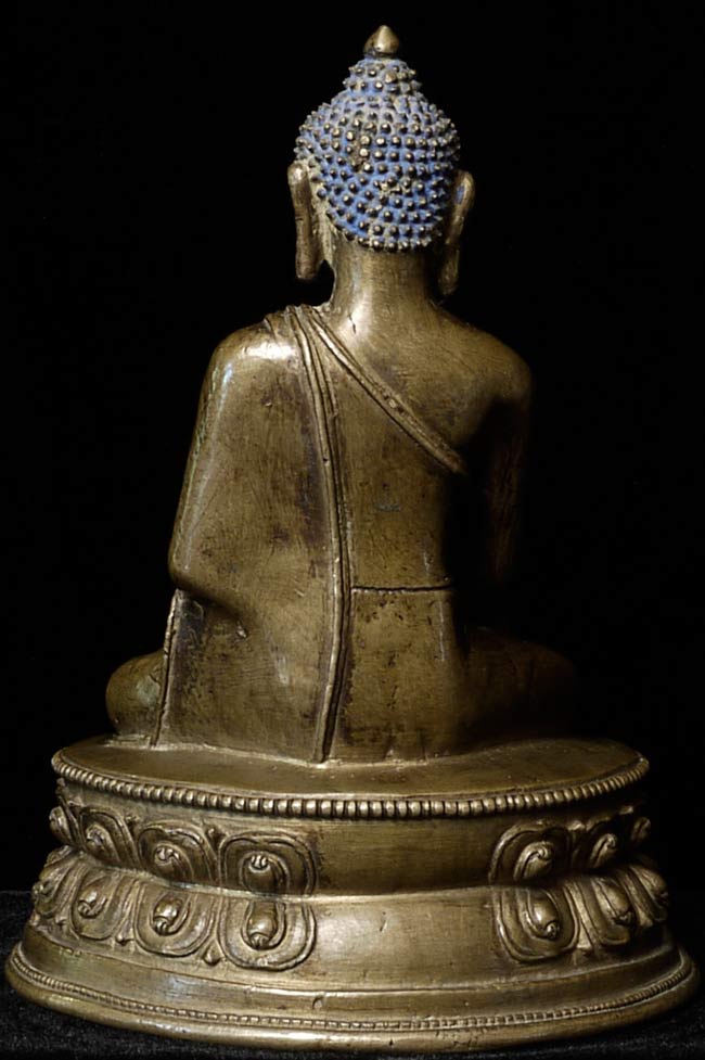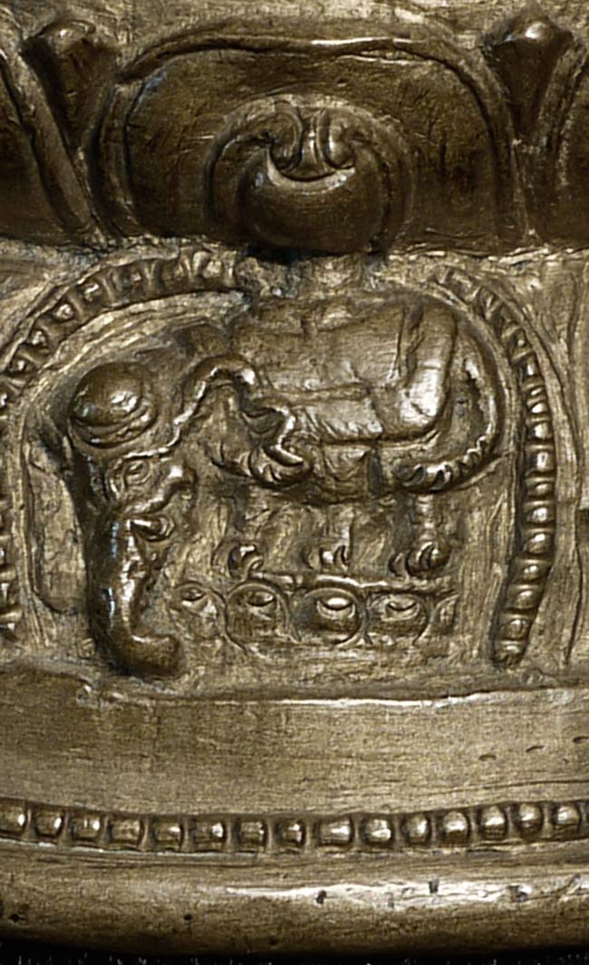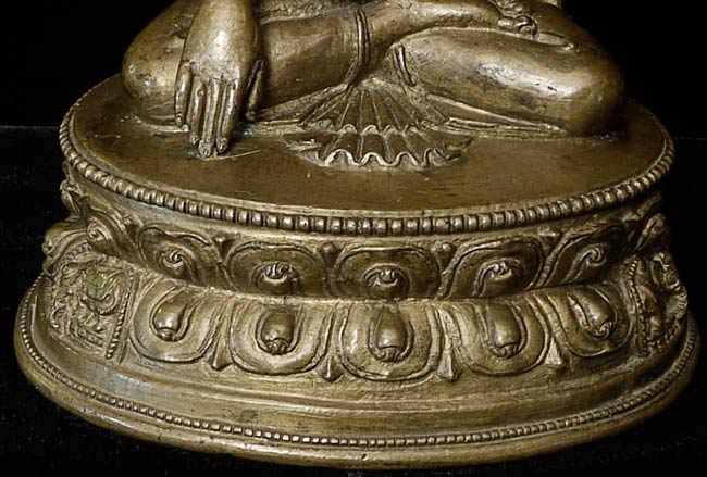 14/15thC Tibetan Bronze Buddha. Cast with great detail- note the finesse in the sash over his shoulder, hands and fingers, dorge etc. Also note the 2 small elephants on the lotus petals on the front of the base. I have never seen another Tibetan Buddha of this type with this feature, and can find none in the reference books. Beautiful face-both serene and powerful, he radiates a peaceful joy. A rare, early beauty. 5.75" tall, bottom measures 4.25" x 3.5".