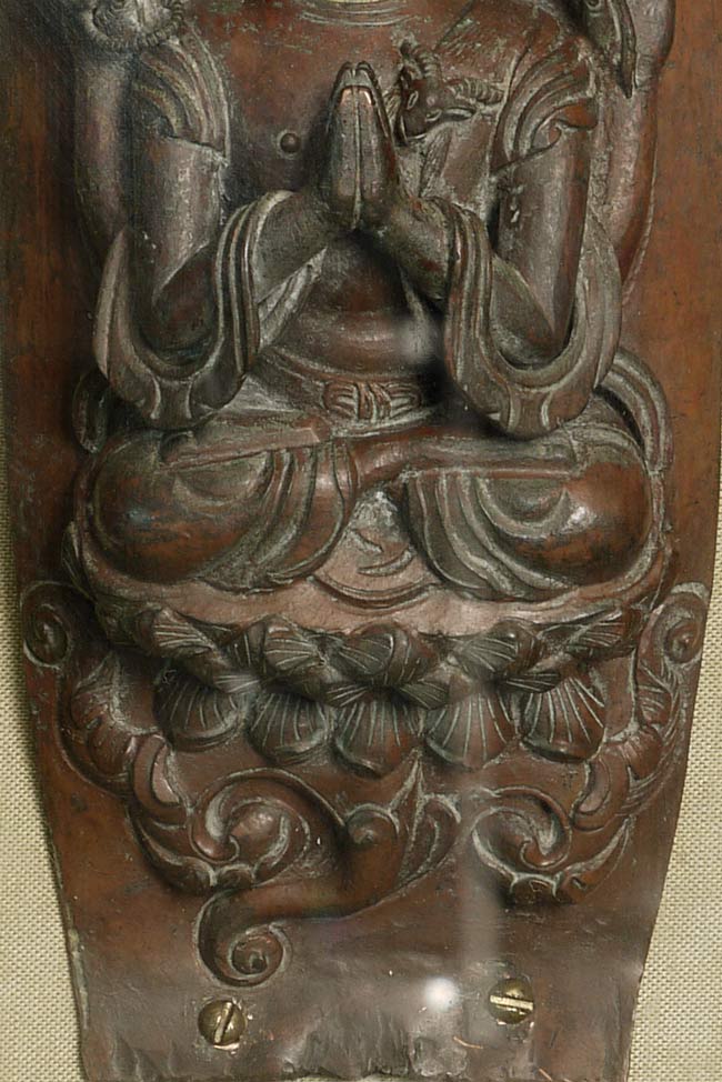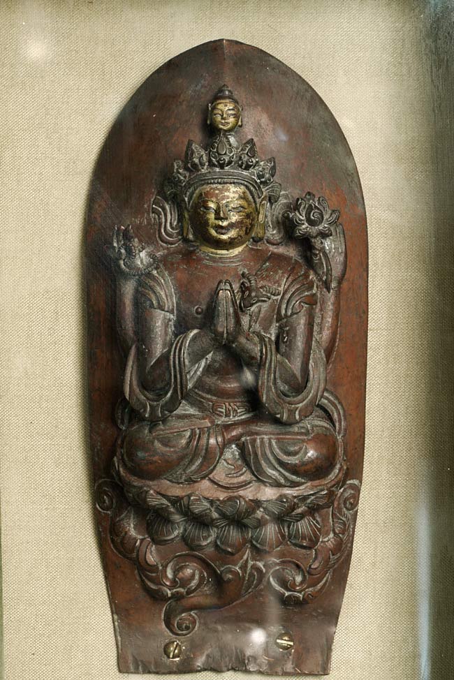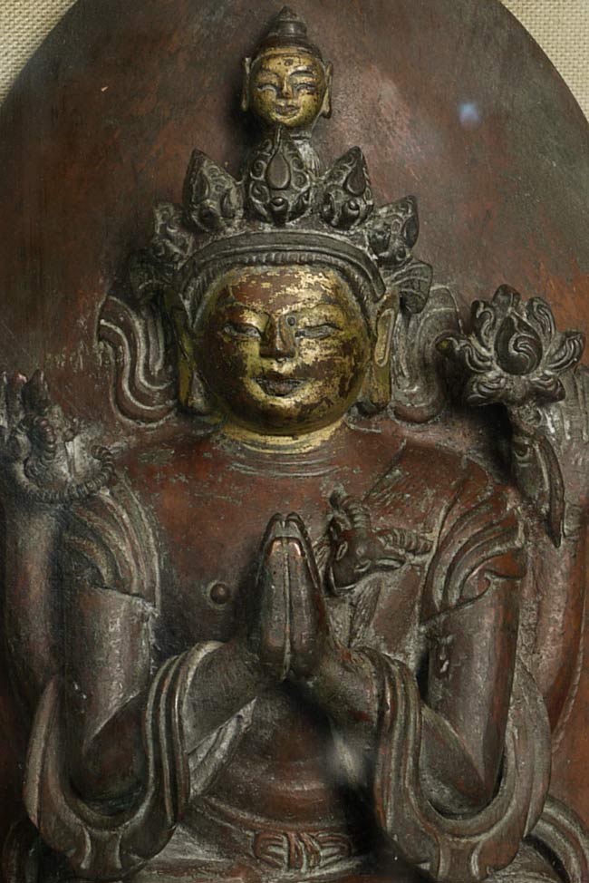 Framed 18thC Tibetan Copper and Bronze Bodhisattva. Beautiful patina. Figure measures approximately 5.75" tall, 2.75" wide. Frame measures 16" x 12.5".