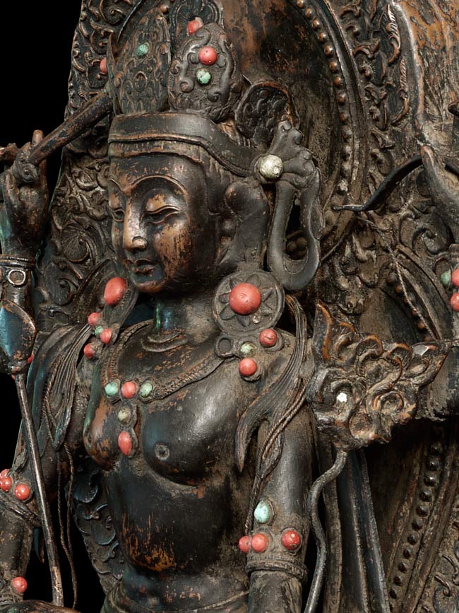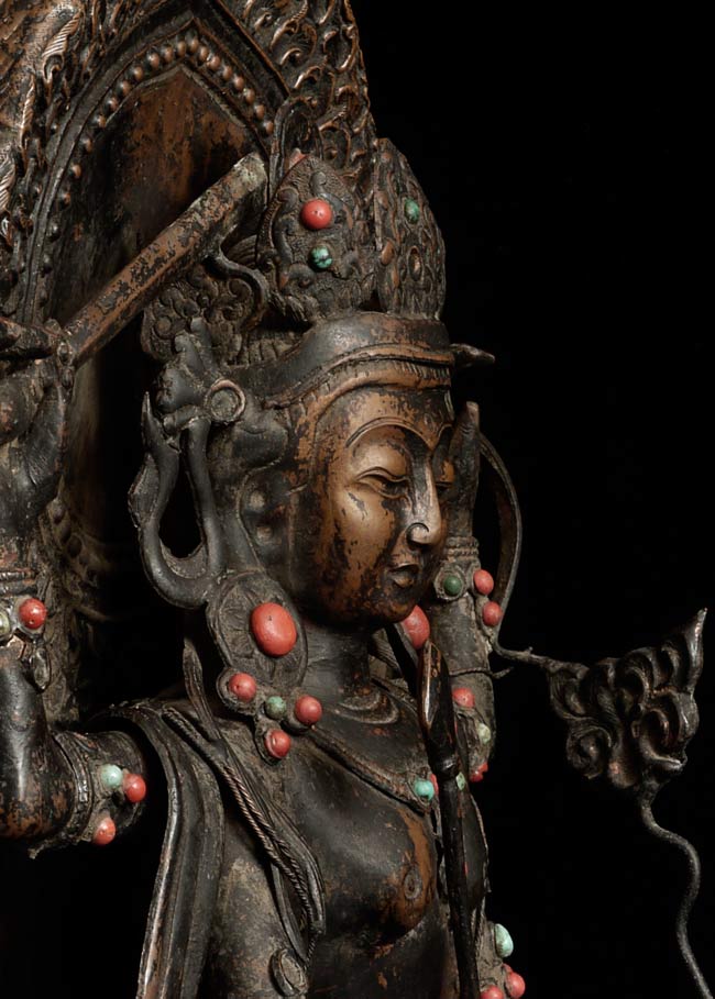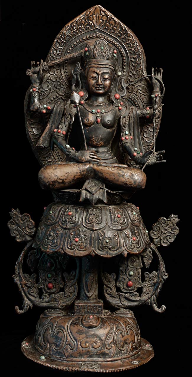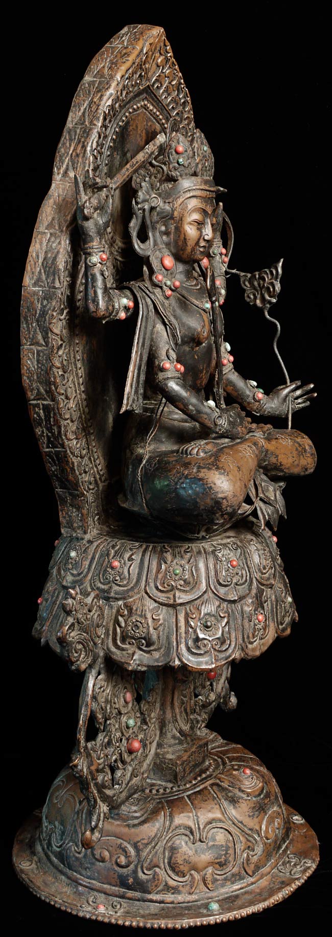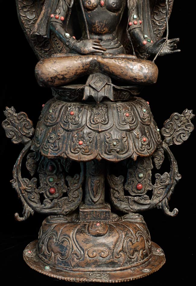 Large, striking, and very beautiful Nepal/Tibet/Chinese 4 arm Bodhisattva. I am not positive of country of origin, as the construction appears Nepalese, though the style has strong Tibetan influence, and there is a Chinese inscription on the base. It is possible it was made in Tibet by Newari artisans from Nepal. Many Newari sculptors were brought from Nepal to Tibet, as they were renowned as skillful metal sculptors. I believe it is probably circa 1800 based on related pieces I have seen. During that period Tibet and China were closely associated, and many Tibetan pieces ended up in China. Due to the very large size (more than 2 feet tall!), high quality, and excellent condition, the price is not inexpensive. 26" tall. Fabulous!