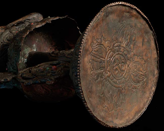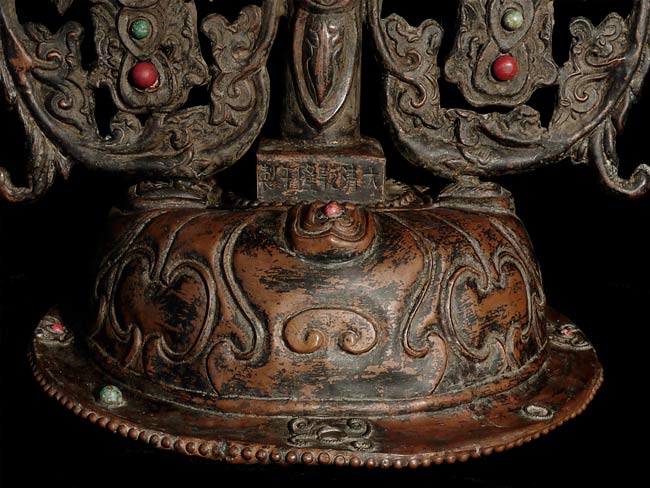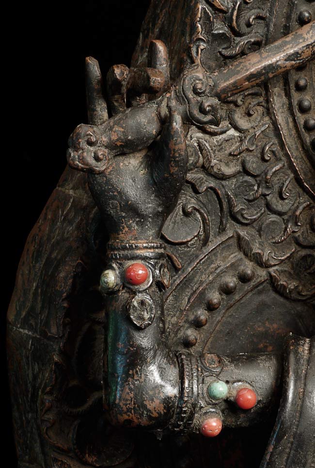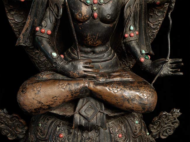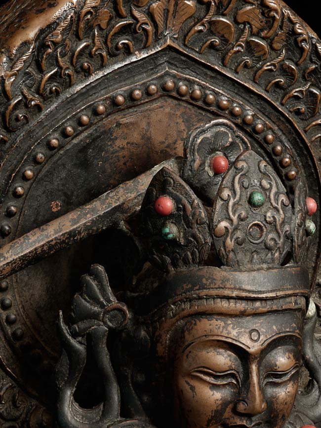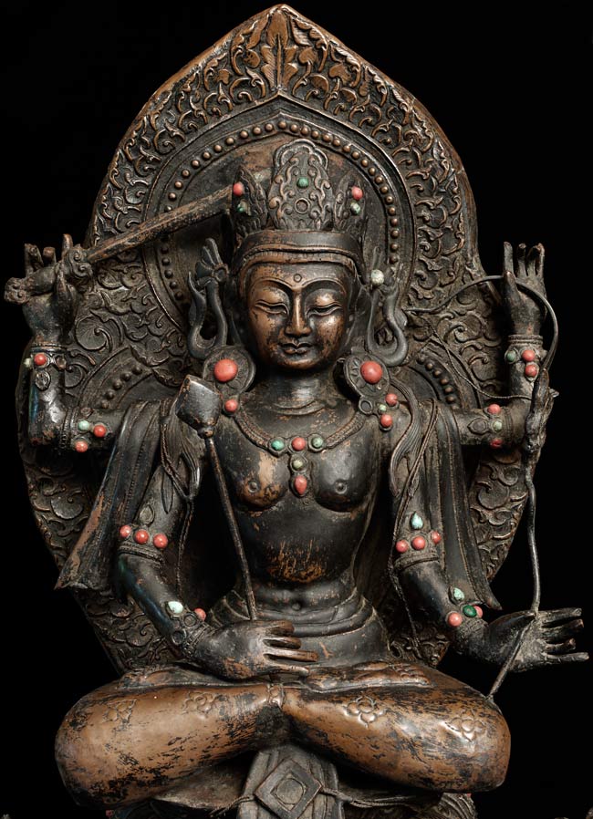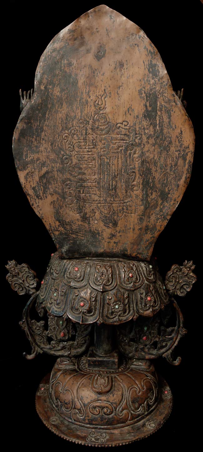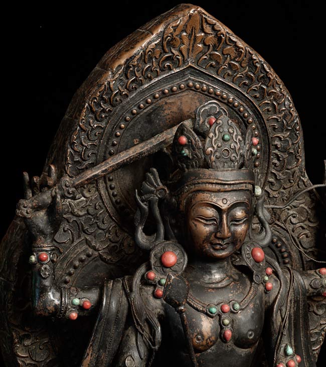 Large, striking, and very beautiful Nepal/Tibet/Chinese 4 arm Bodhisattva. I am not positive of country of origin, as the construction appears Nepalese, though the style has strong Tibetan influence, and there is a Chinese inscription on the base. It is possible it was made in Tibet by Newari artisans from Nepal. Many Newari sculptors were brought from Nepal to Tibet, as they were renowned as skillful metal sculptors. I believe it is probably circa 1800 based on related pieces I have seen. During that period Tibet and China were closely associated, and many Tibetan pieces ended up in China. Due to the very large size (more than 2 feet tall!), high quality, and excellent condition, the price is not inexpensive. 26" tall. Fabulous!