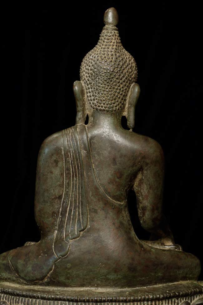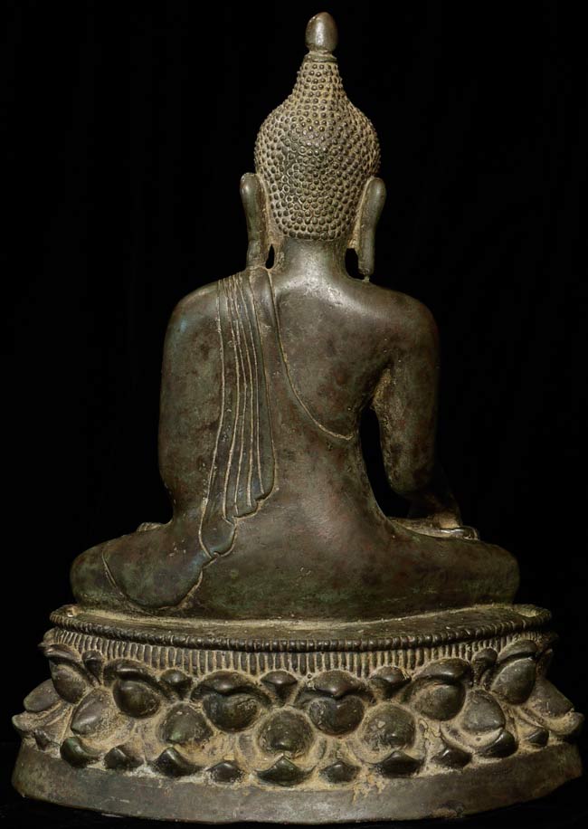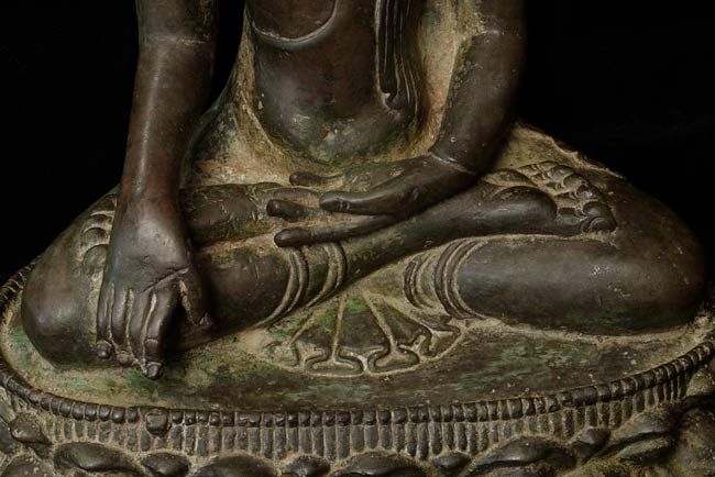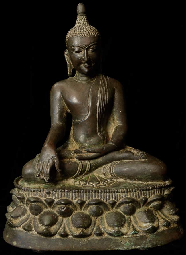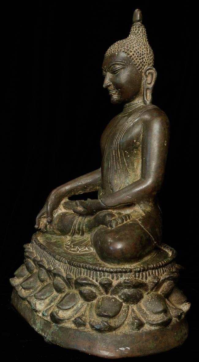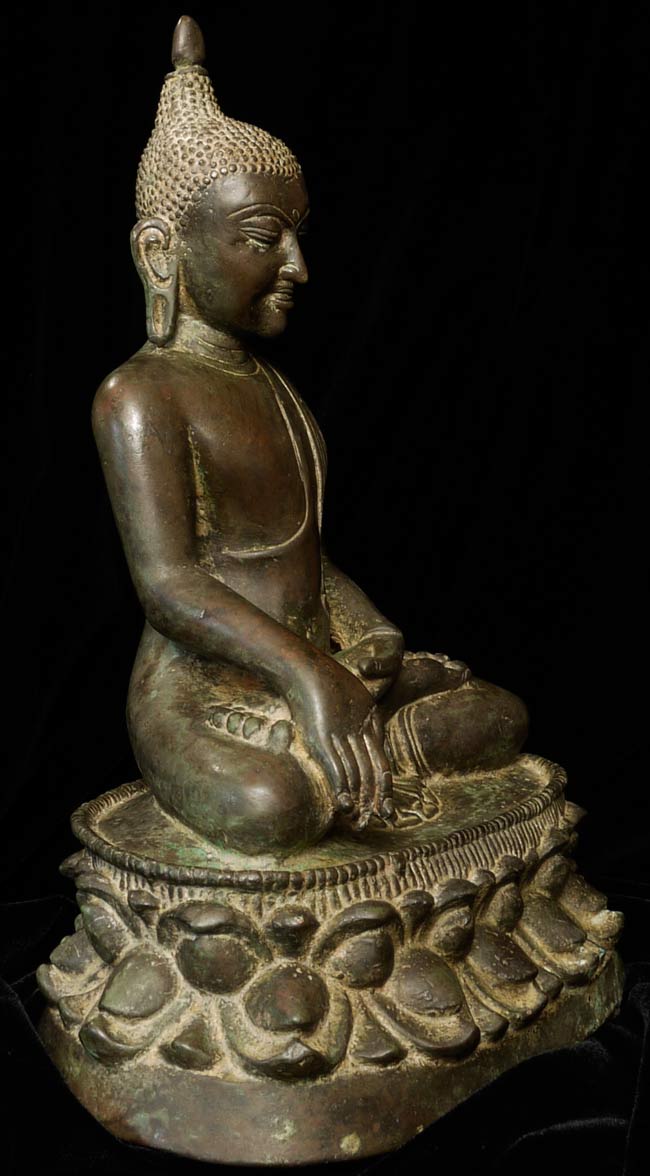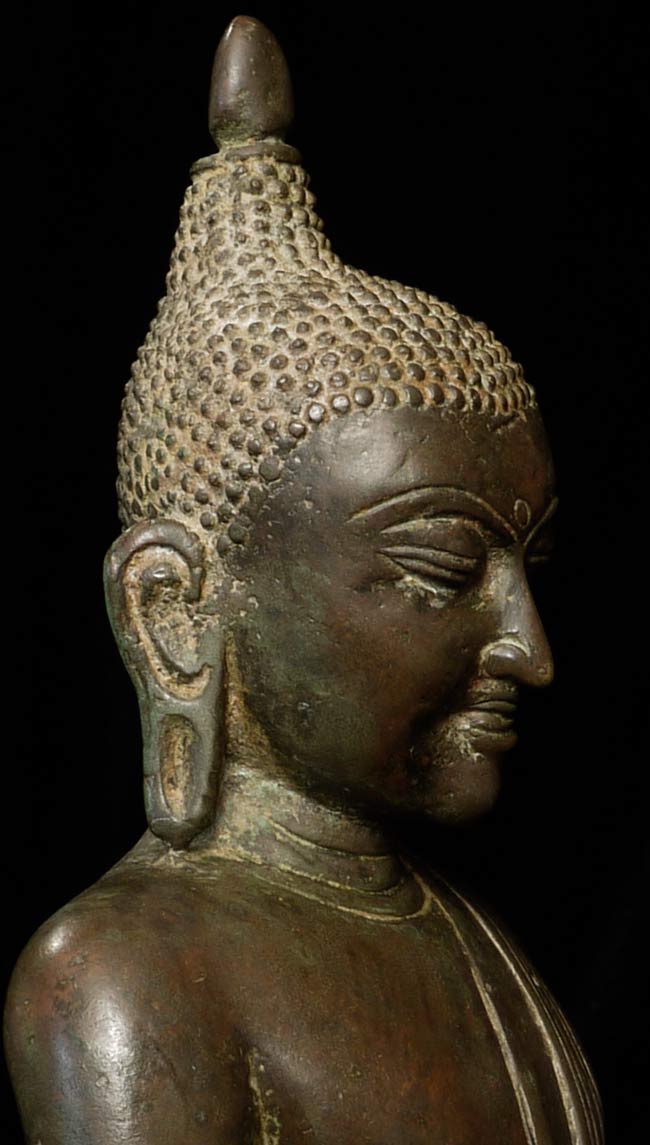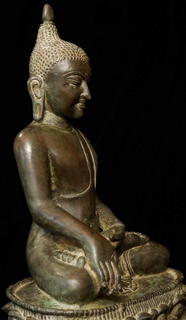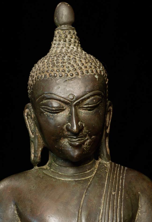 Extremely uncommon and very expressive Late Pagan solid-cast Buddha. Hard to date with precision, but I believe this Buddha to be 13-15th century (plus or minus a century or two), and from the Late Pagan, "Ava" or "Pinya" periods in Burma. Classic Pagan face and body. Sits 9.75" tall. Very heavy-a good 15 pounds!