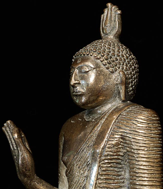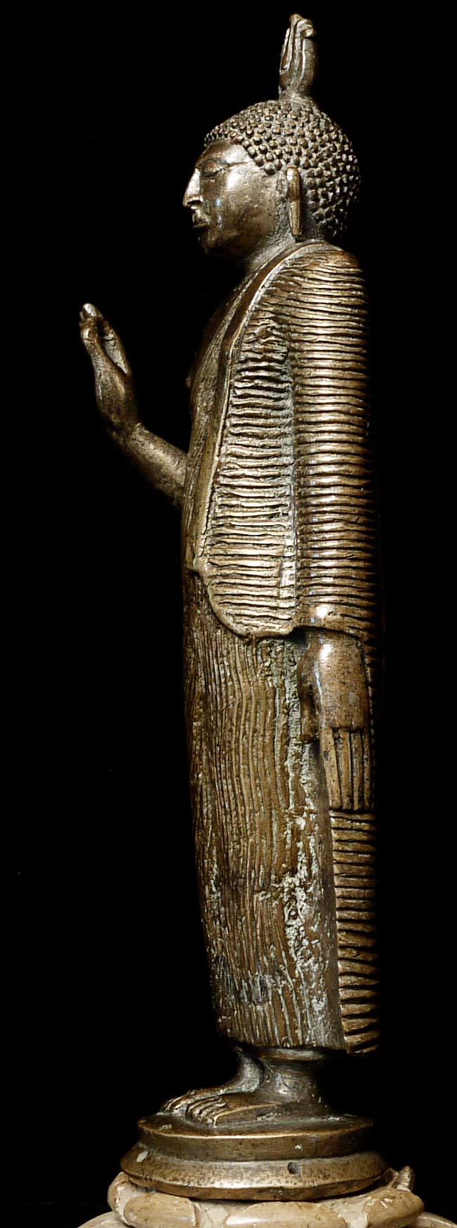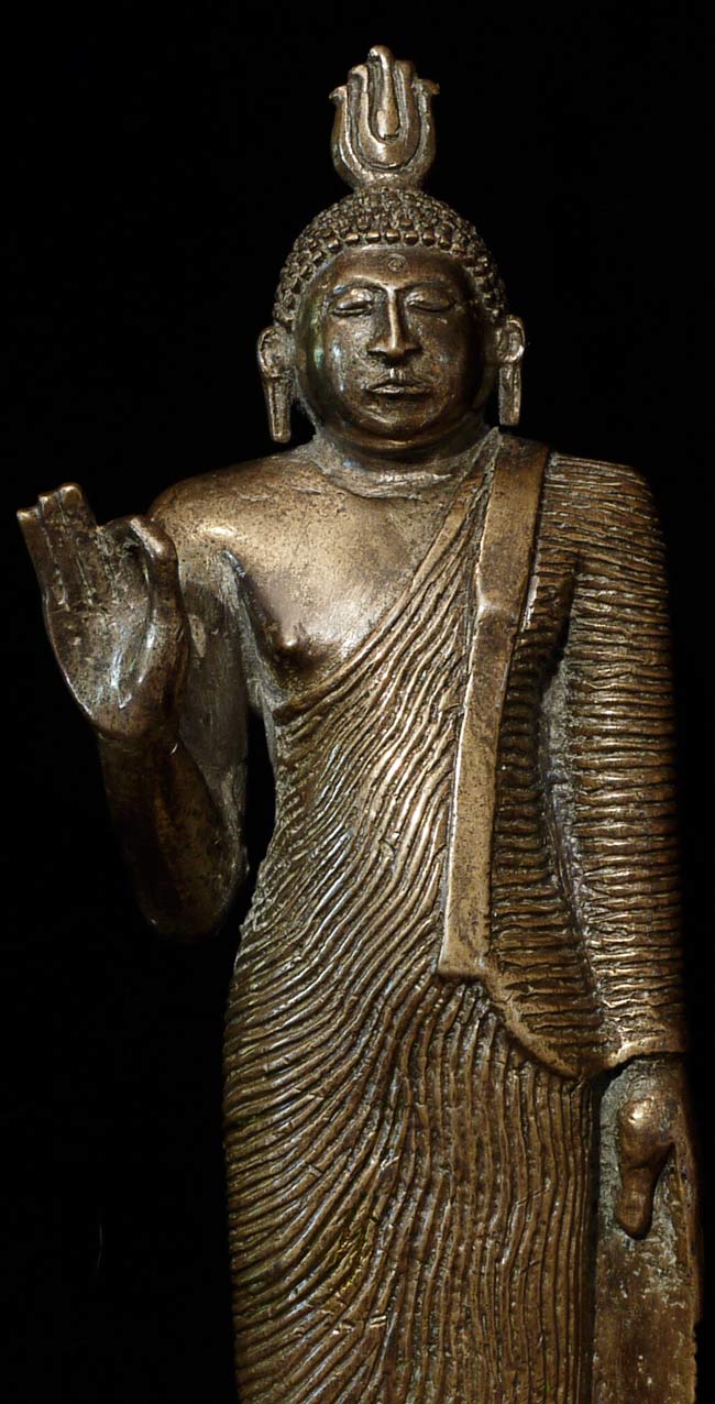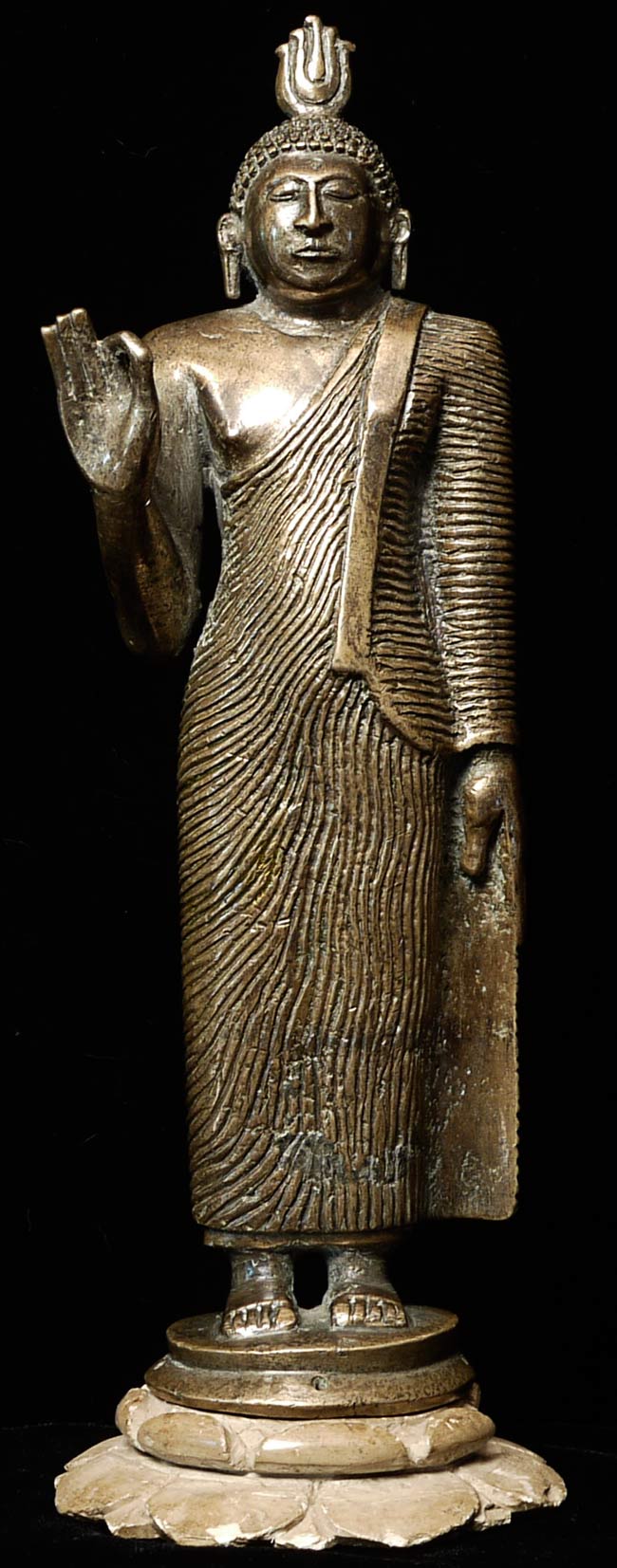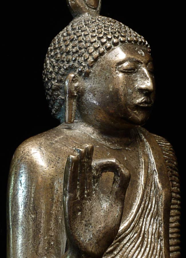 Very high silver content solid cast 18thC Sri Lankan Kandy style Buddha. EXTREMELY HEAVY for its size, and large for its type at 8.75" tall (figure only). Optional base is 5/8" tall, diameter 3.25" I've never had one this large made out of a high silver alloy-he almost glows in the dark!