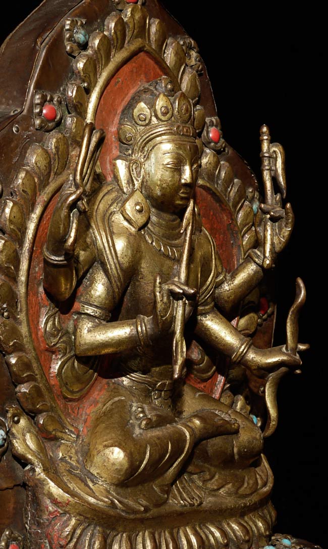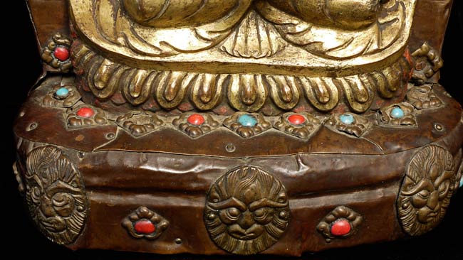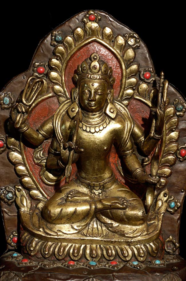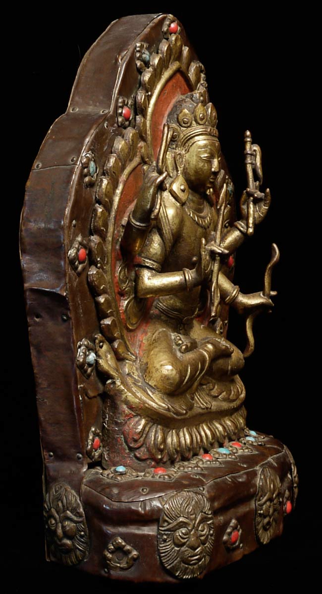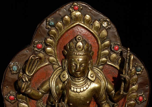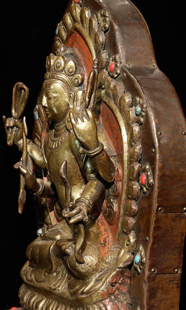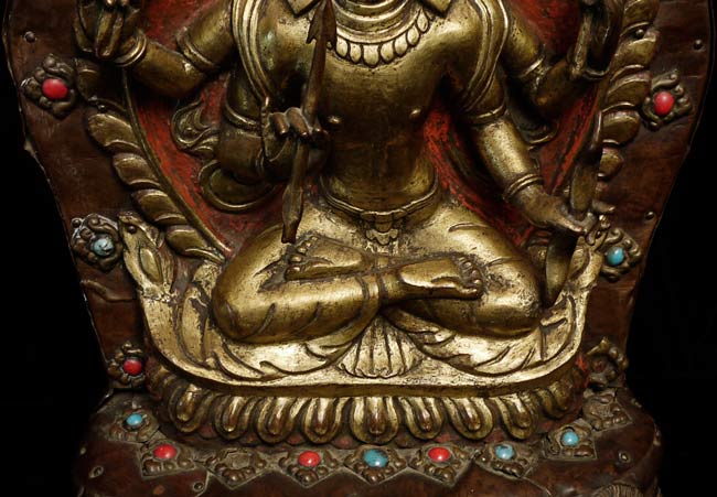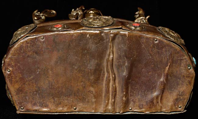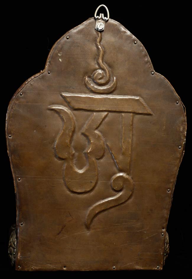 Antique Bronze Bodhisattva affixed to copper repousse over wood. Probably 60 to 100 years old. 10.5" tall, 7" wide, 3 3/8" deep