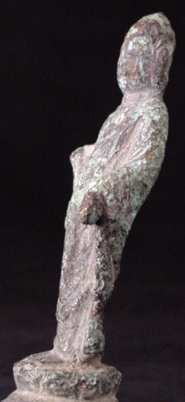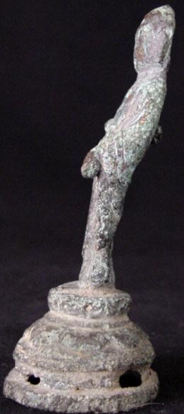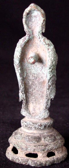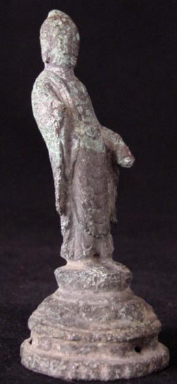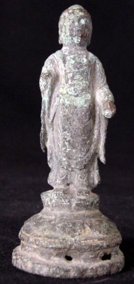 This is an authentic standing bronze Buddha from the earliest days of Korean Buddhist art. It appears to have been de-accessioned from a museum collection, and to have number on it. Bronze Buddhas from this early period are quite rare, and very few authentic ones make their way to Ebay. It is unfinished on the reverse, which was common in early bronze figural casting. He has a protrusion on the backm, which may have attached him to something. He has a fantastic flowing quality to the figure: he leans back in a relaxed and confident manner. It stands 4.25 inches tall He has extensive waer and is missing one hand and one arm, which is common on these earliest of Korean Buddhas. A collector's item. He has tremendous presence.
