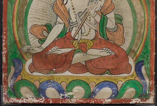 A beautiful and finely painted antique Mongolian Thangka, measuring 4 inches (10.2 cm) H x 3.25 inches (8.3 cm) W. The exquisitely rendered deity sits in serene meditation, adorned with delicate jewelry, a radiant golden halo, and flowing robes highlighted with subtle mineral pigments. The refined linework, balanced composition, and gentle shading reflect a notably skilled hand—of higher quality than many surviving examples. Light wear and surface texture add authenticity without diminishing its elegance. Compact yet visually rich, this Thangka is an exceptional addition for collectors seeking finely executed sacred Mongolian artwork.