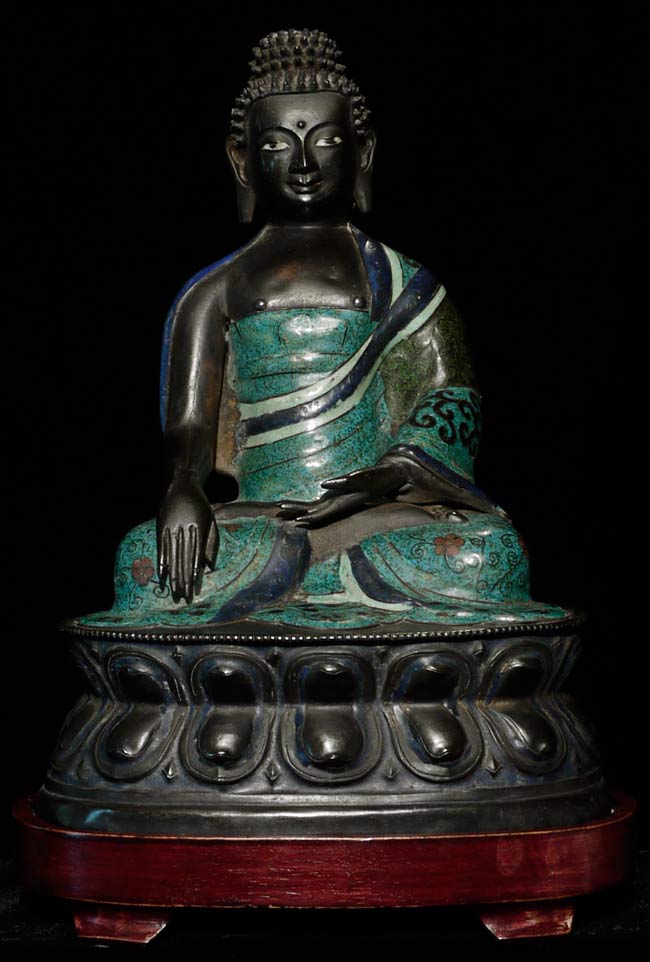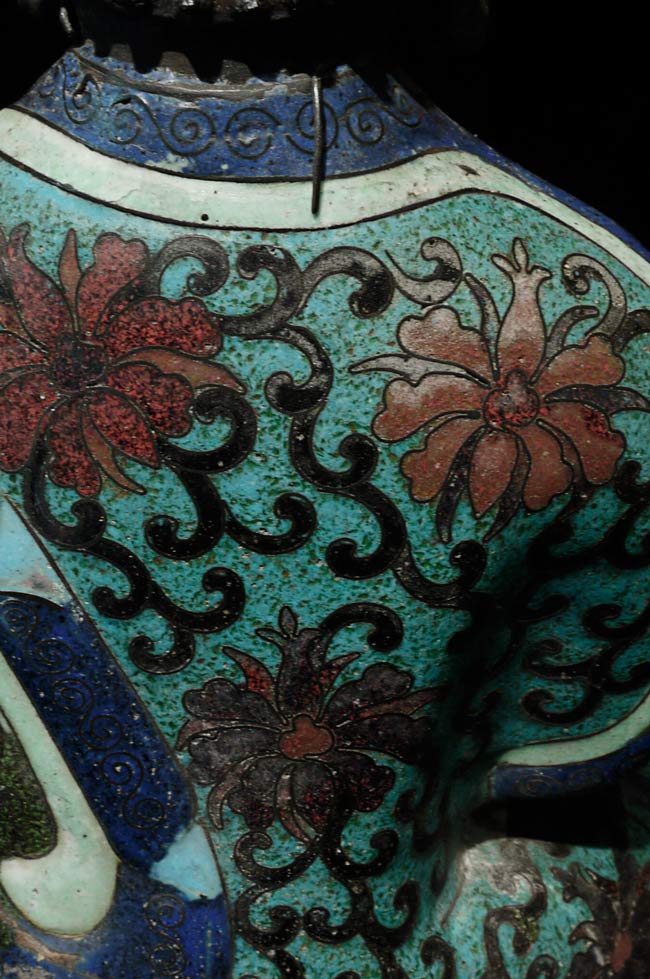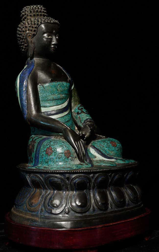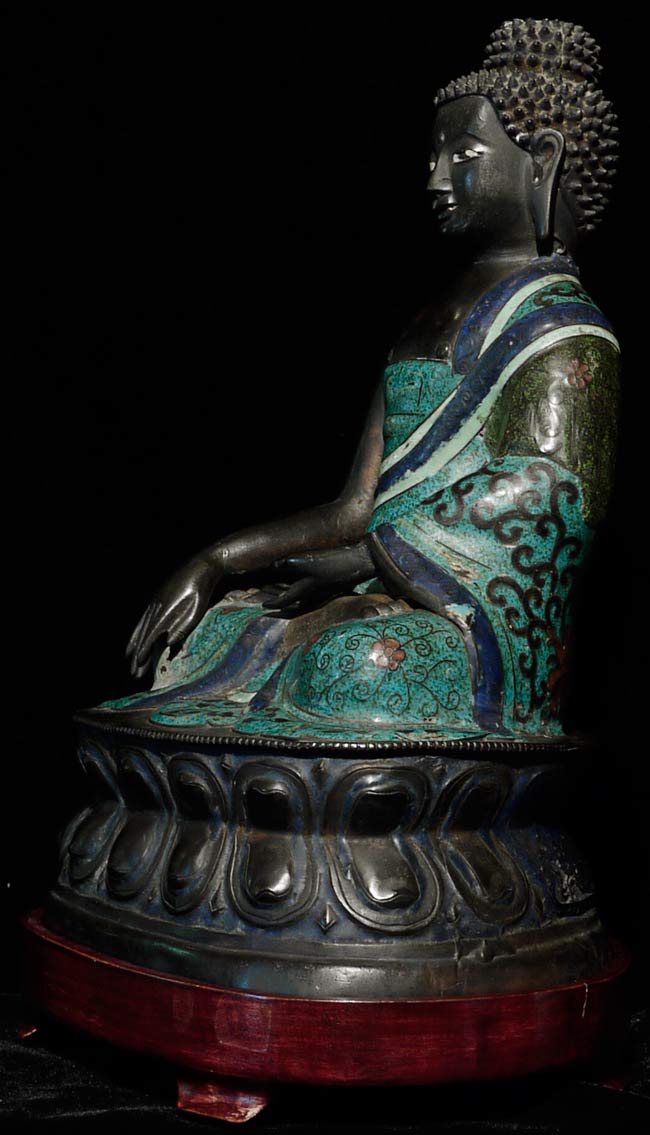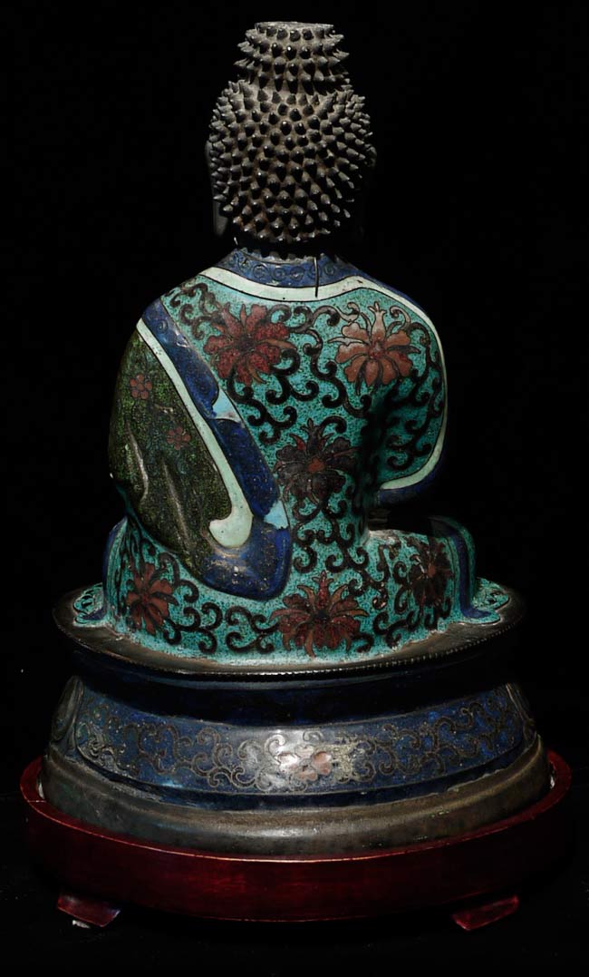Beautiful Antique Cloisonné Buddha. The nicest of this type I have seen in a long time. In very good condition for a cloisonne Buddha, with only minor loss and wear to the cloisonne. Appears to have originally had a finial. Large at 10" tall, bottom measures 7.5" x 5.75". Stand adds 1" in height.