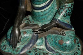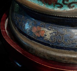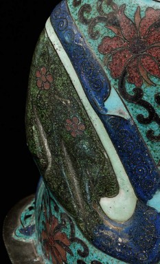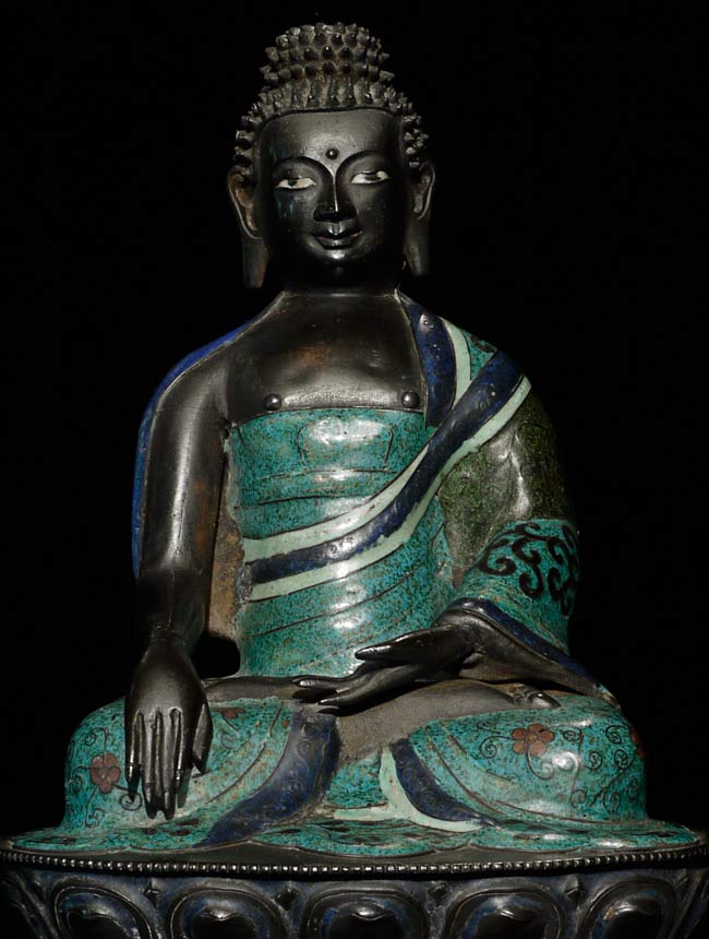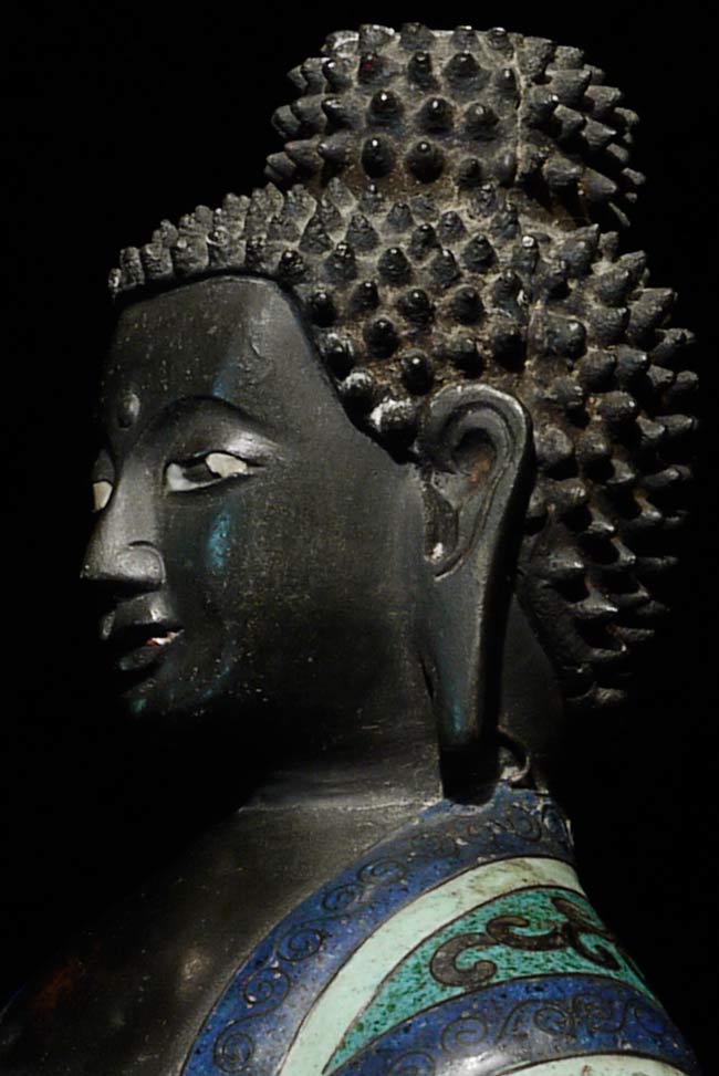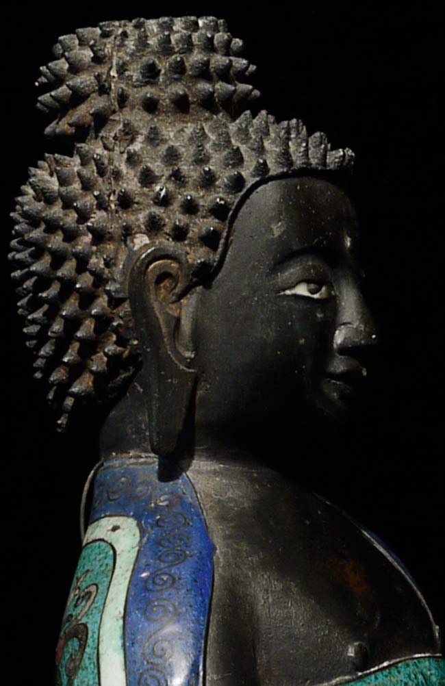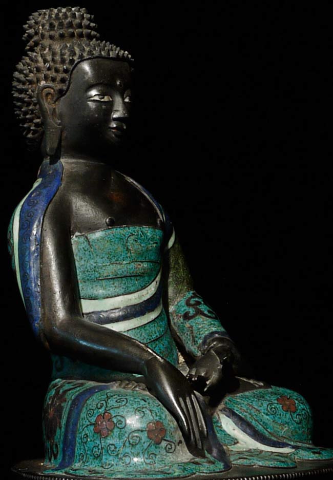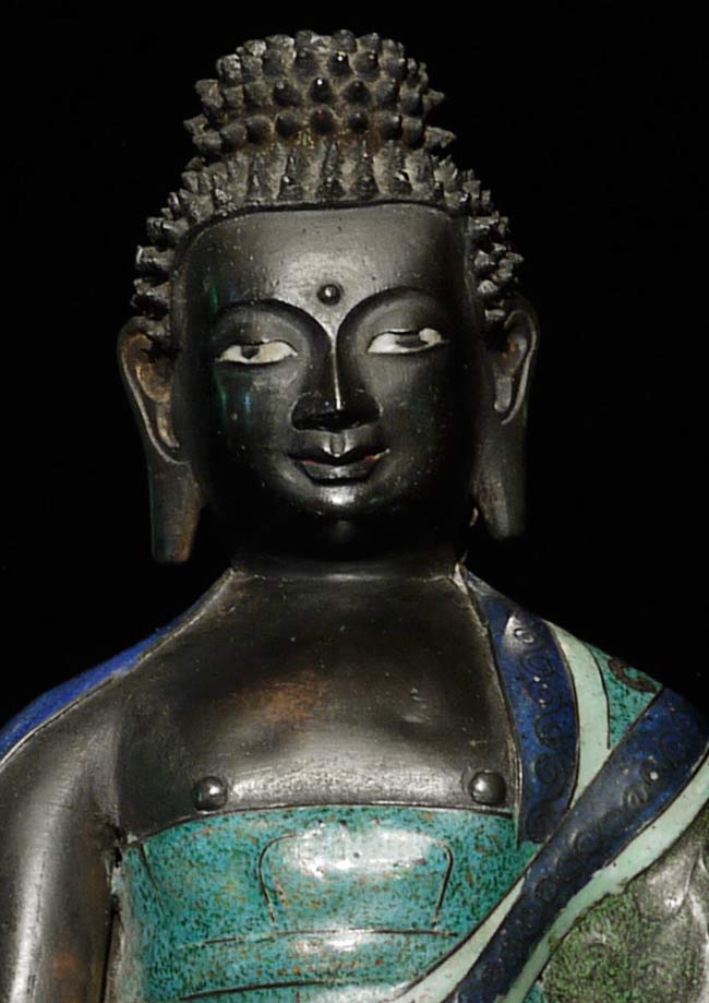 Beautiful Antique Cloisonné Buddha. The nicest of this type I have seen in a long time. In very good condition for a cloisonne Buddha, with only minor loss and wear to the cloisonne. Appears to have originally had a finial. Large at 10" tall, bottom measures 7.5" x 5.75". Stand adds 1" in height.