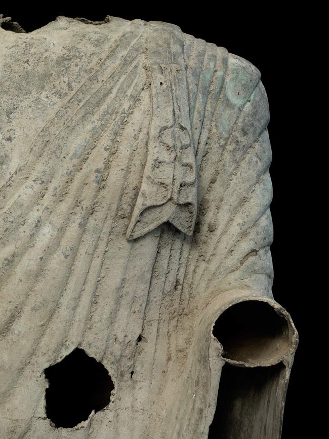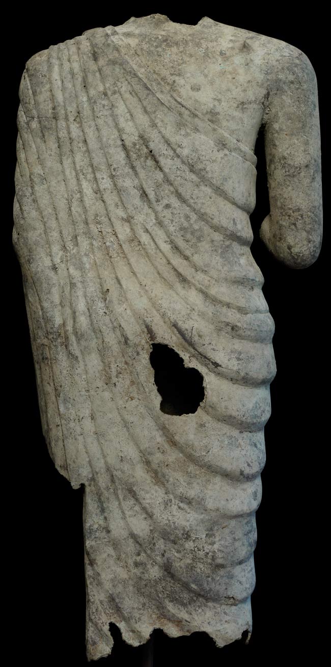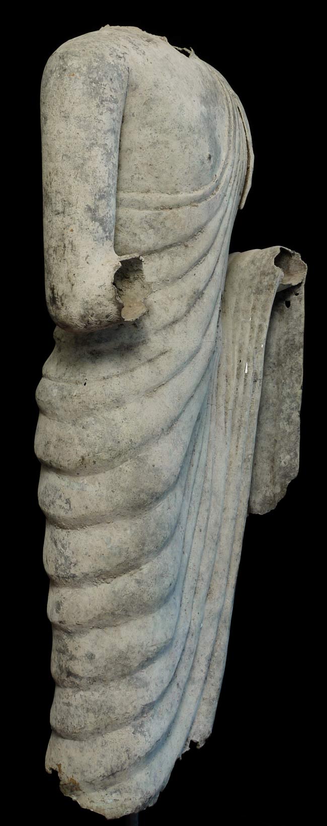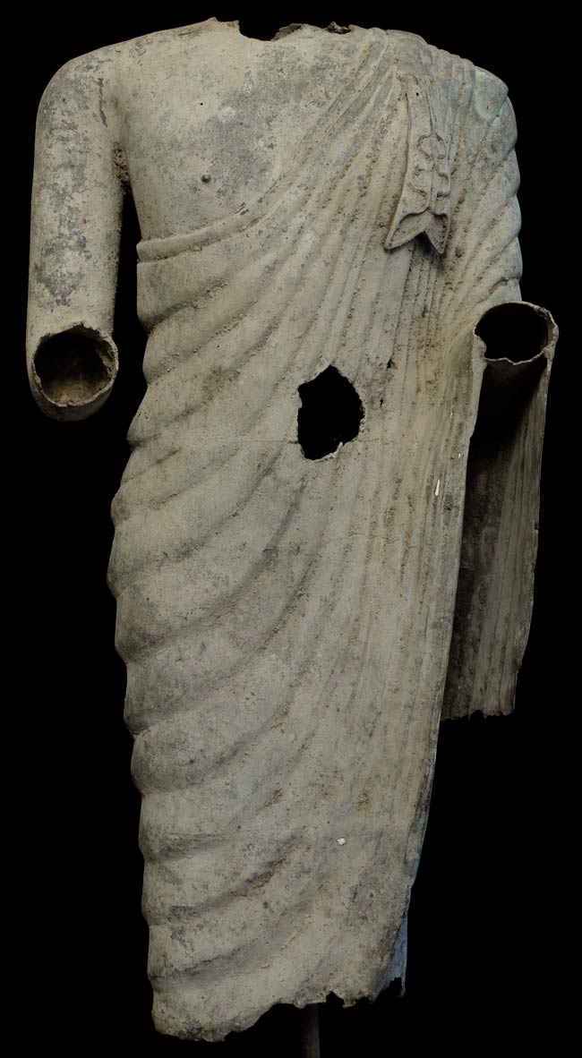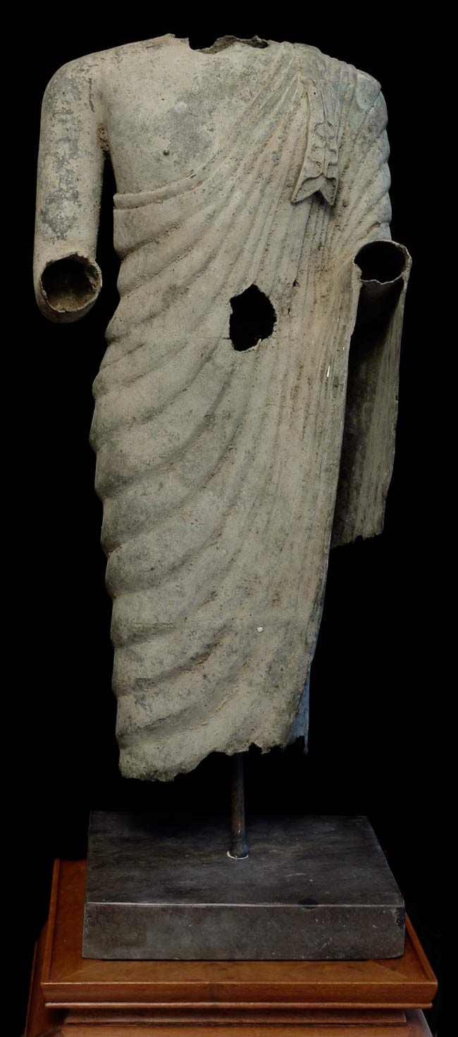 Early Indonesian Style Bronze Buddha Torso. It is quite large-the height of the original Buddha would have been over 4 feet tall. Appears to have age, and done in a 1,000+ year old style, this piece may be recent. Height with is base is 36". Base measures 12.5" x 9.5". Has internal frame for support.Has a commanding presence, and can anchor a room. Never seen another of this type in this size.