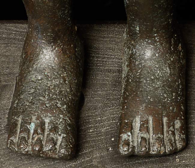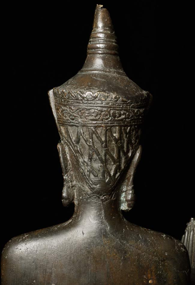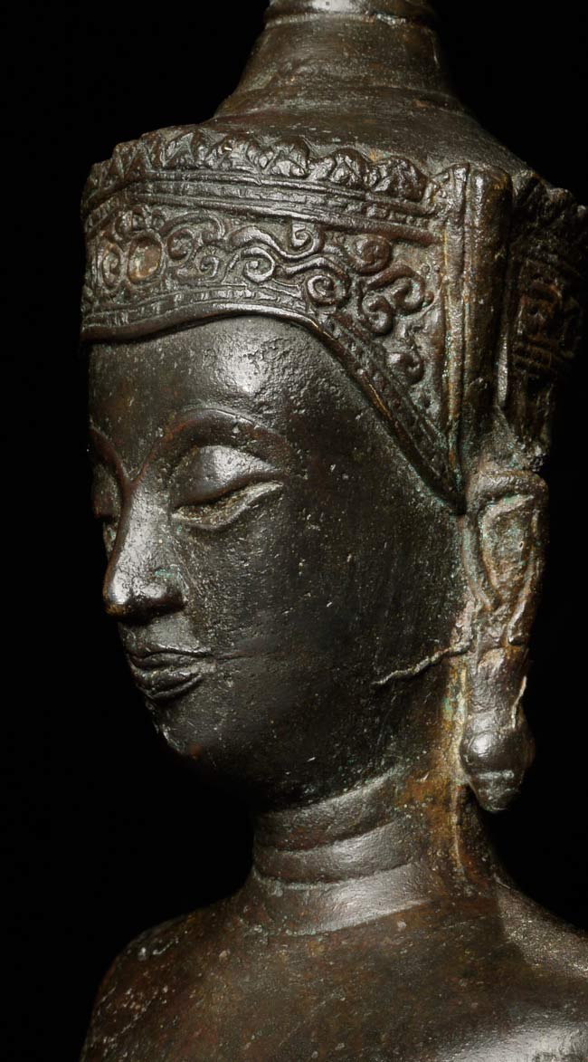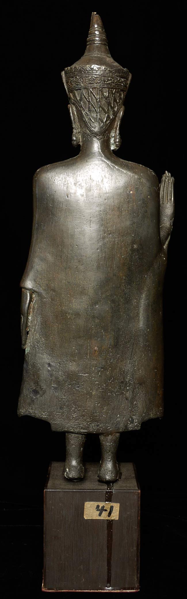 Nice 17/18thC Standing bronze Thai Buddha. Stands 13.75" tall. Stand is another 3" tall, 2.75" square.