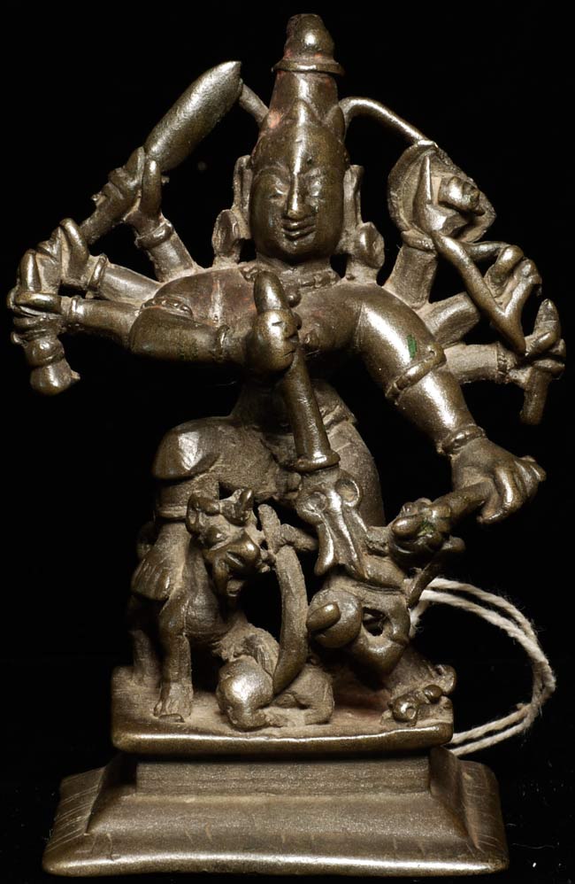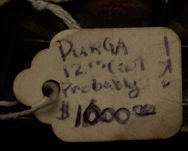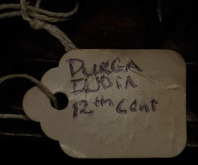 Powerful early Durga. Has an old tag which dates it at 12th century (and prices it at $1,000). I do not believe it is quite that old. 3" tall, wonderful detail!