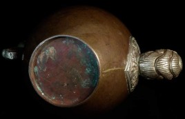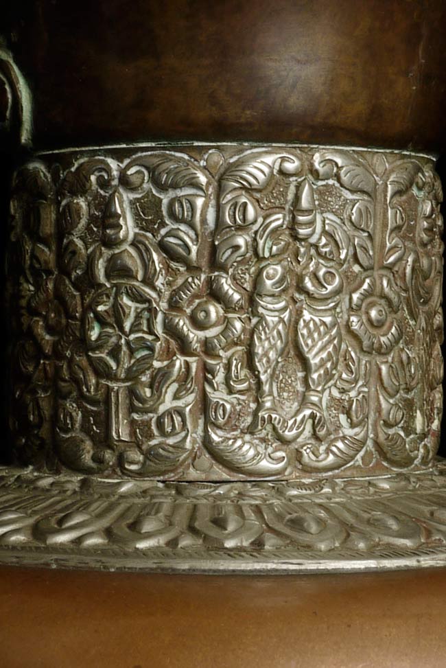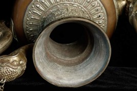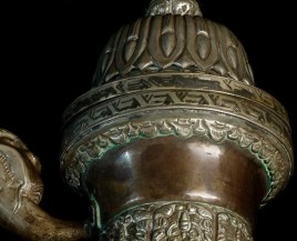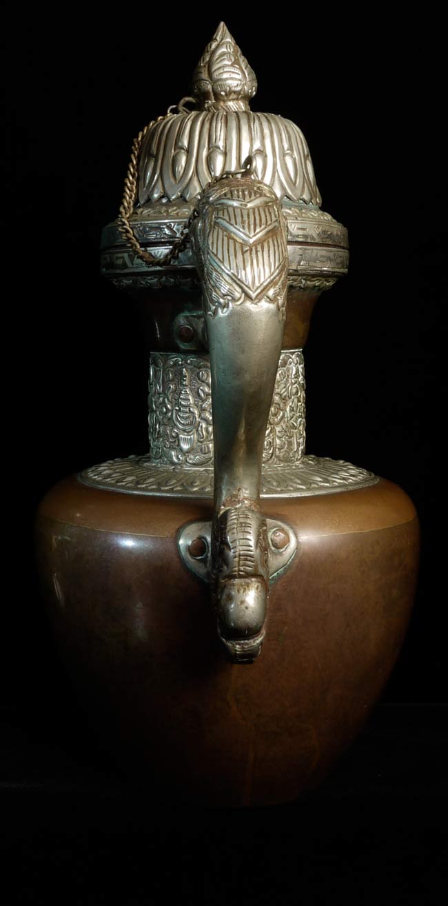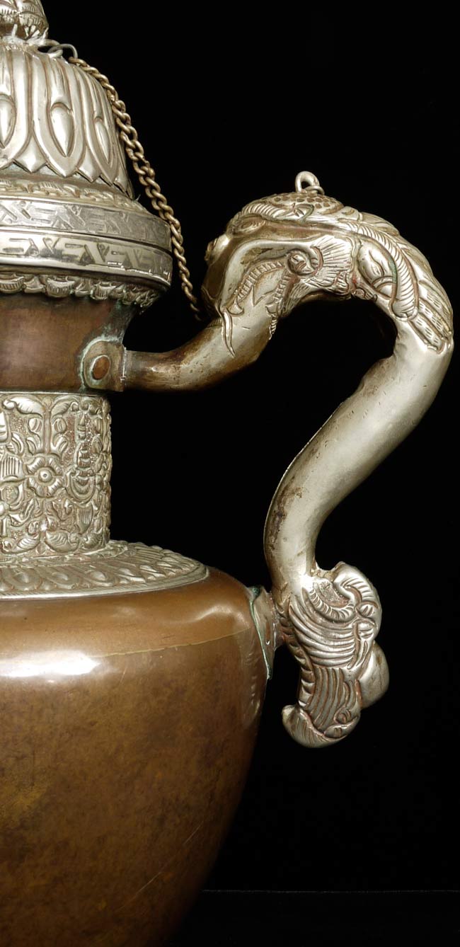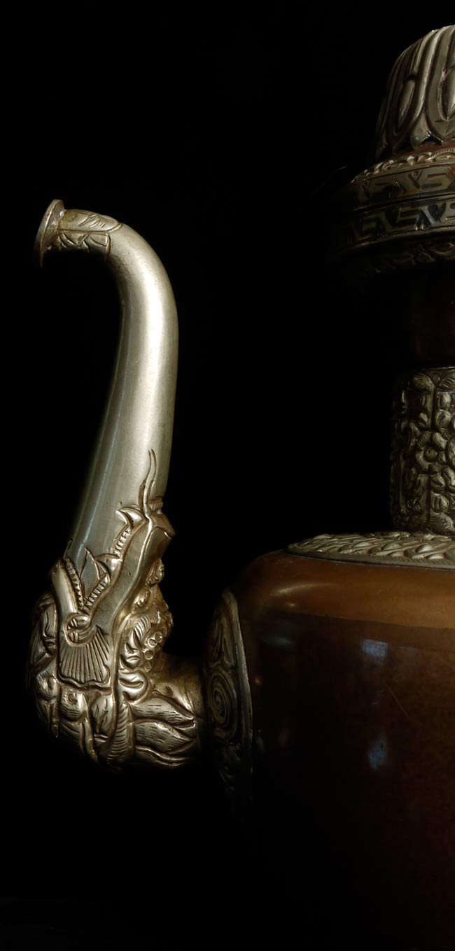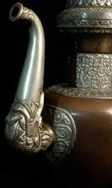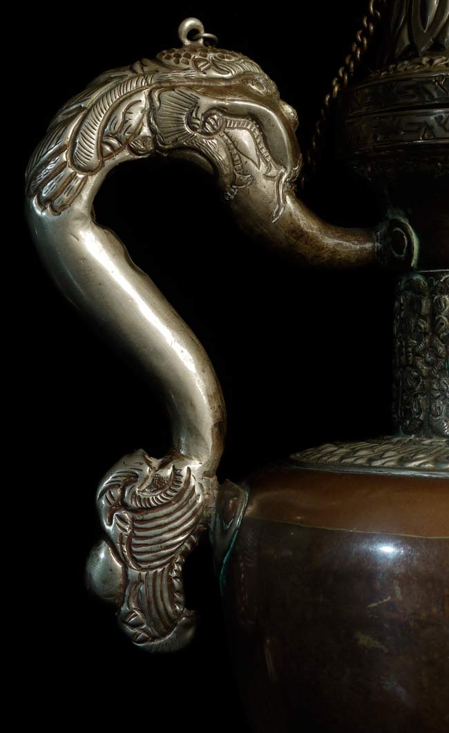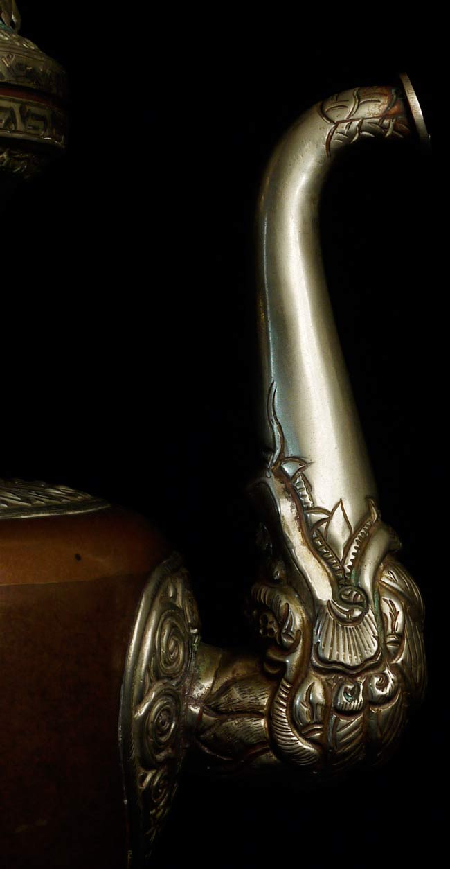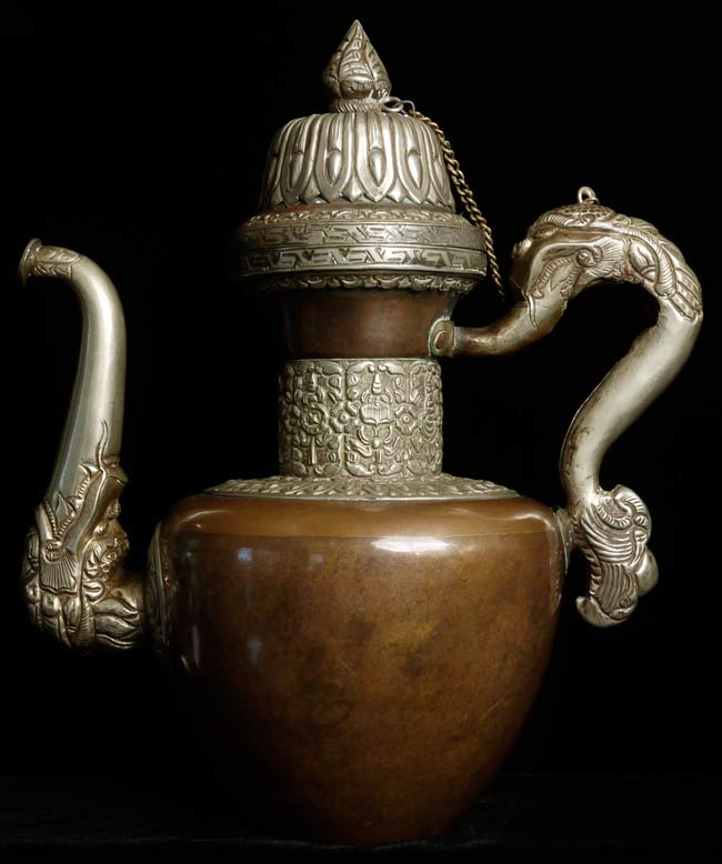 A lovely antique Tibetan ewer with dragon handle and spot. 12" tall, approximately 10" at widest point (spot to handle view), bowl has 7" diameter.