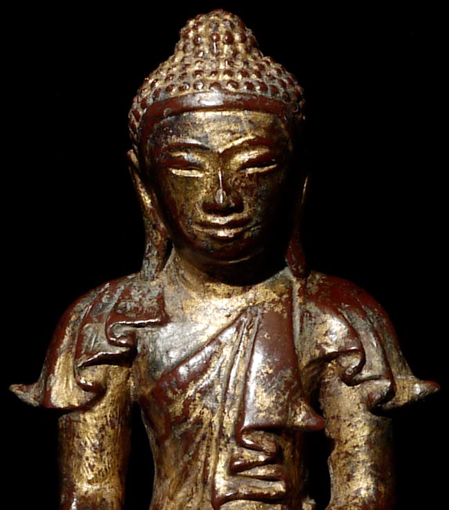 Lovely 19thC Burmese Bronze Buddha with both San and Mandalay influence. Sits 8.5" tall, 8" at widest point, 4.5" deep