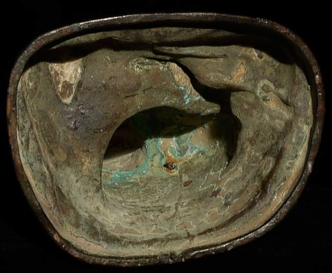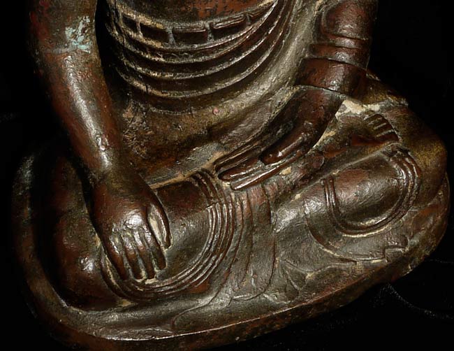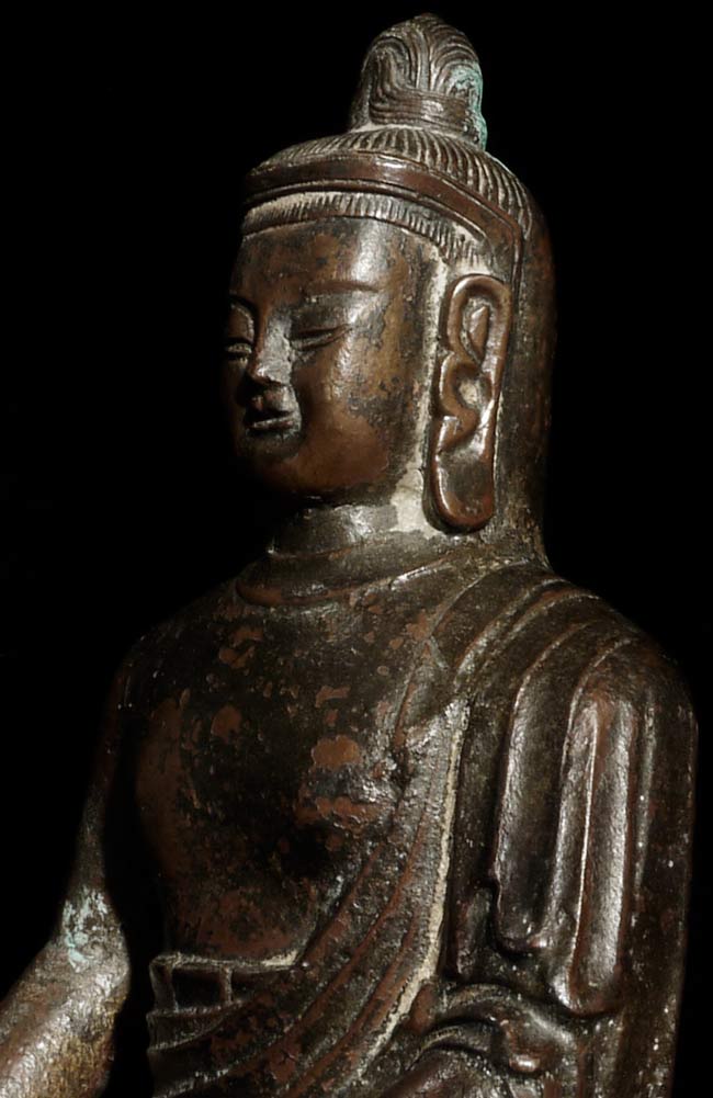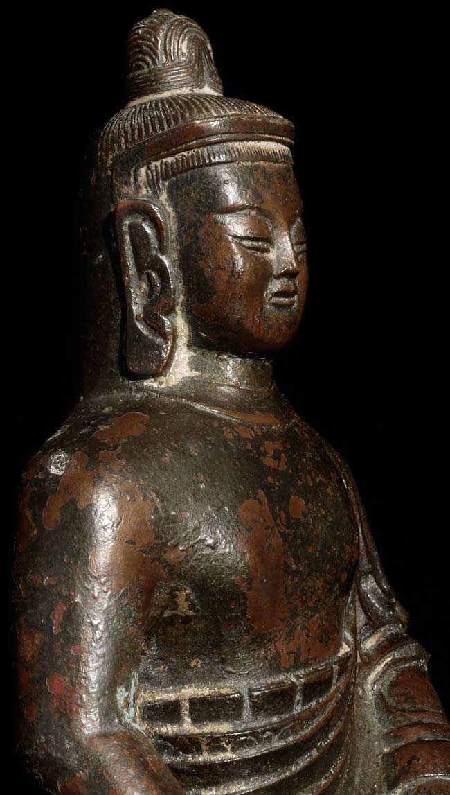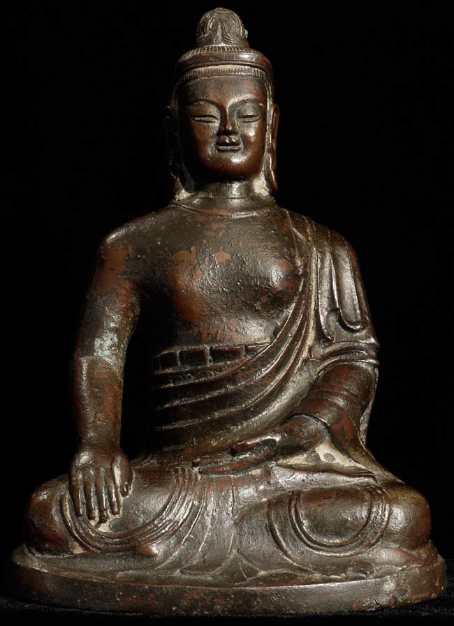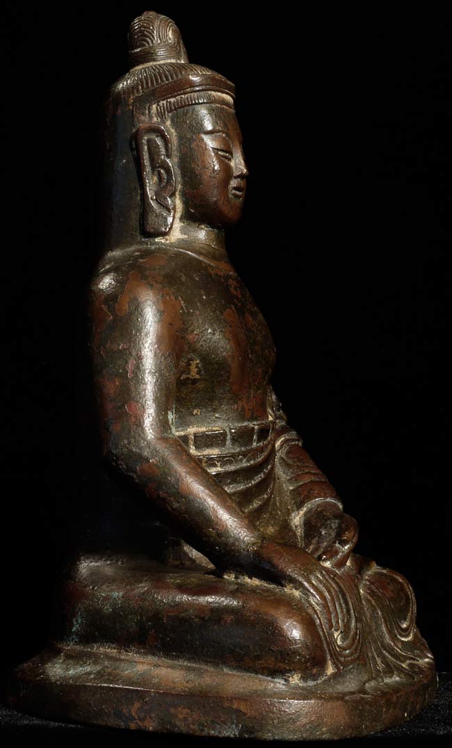 Unusual 17-19thC Bronze Buddha- probably from a provincial area in the west or south of China near the Himalayas. Unusual proportions, and very unusual top knot. 8.75" tall, 6.5" wide, 5" deep