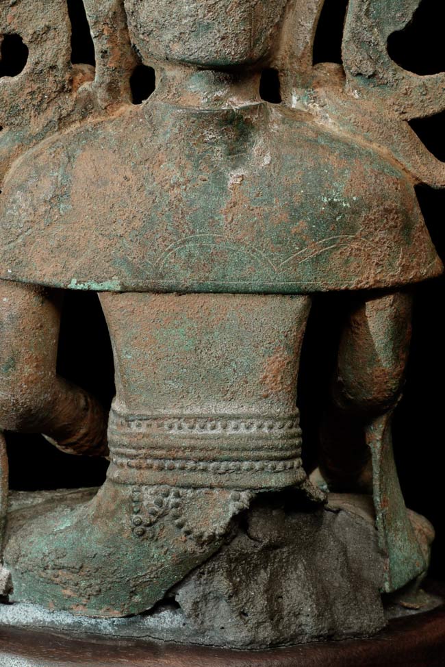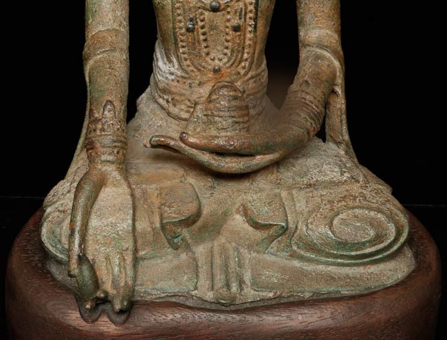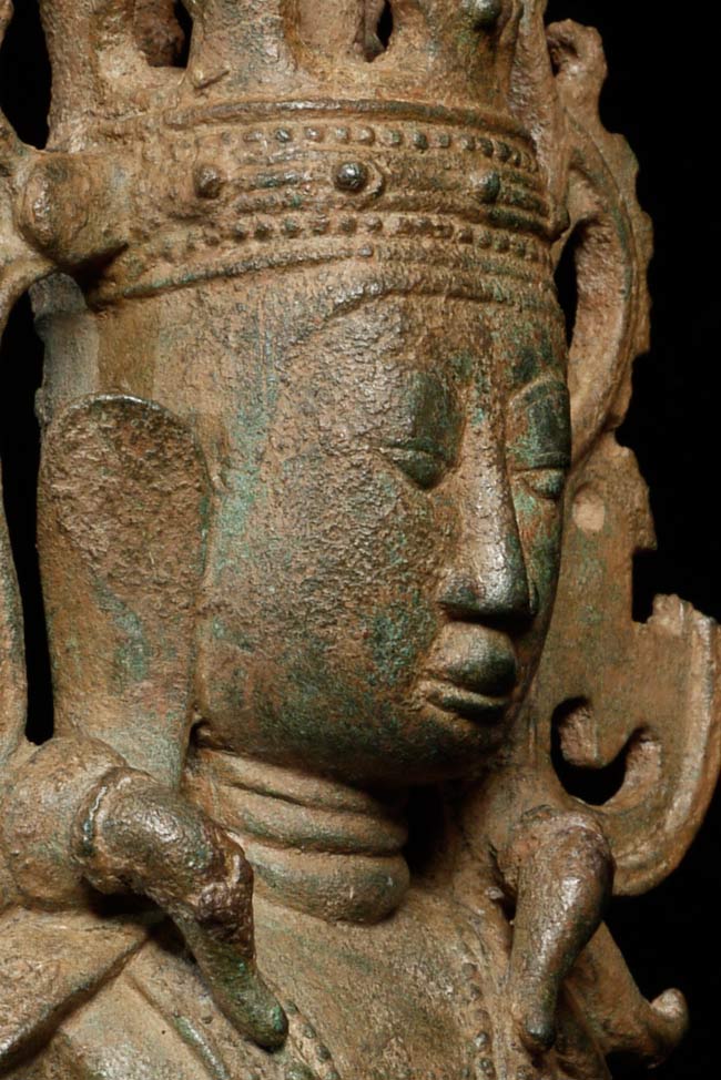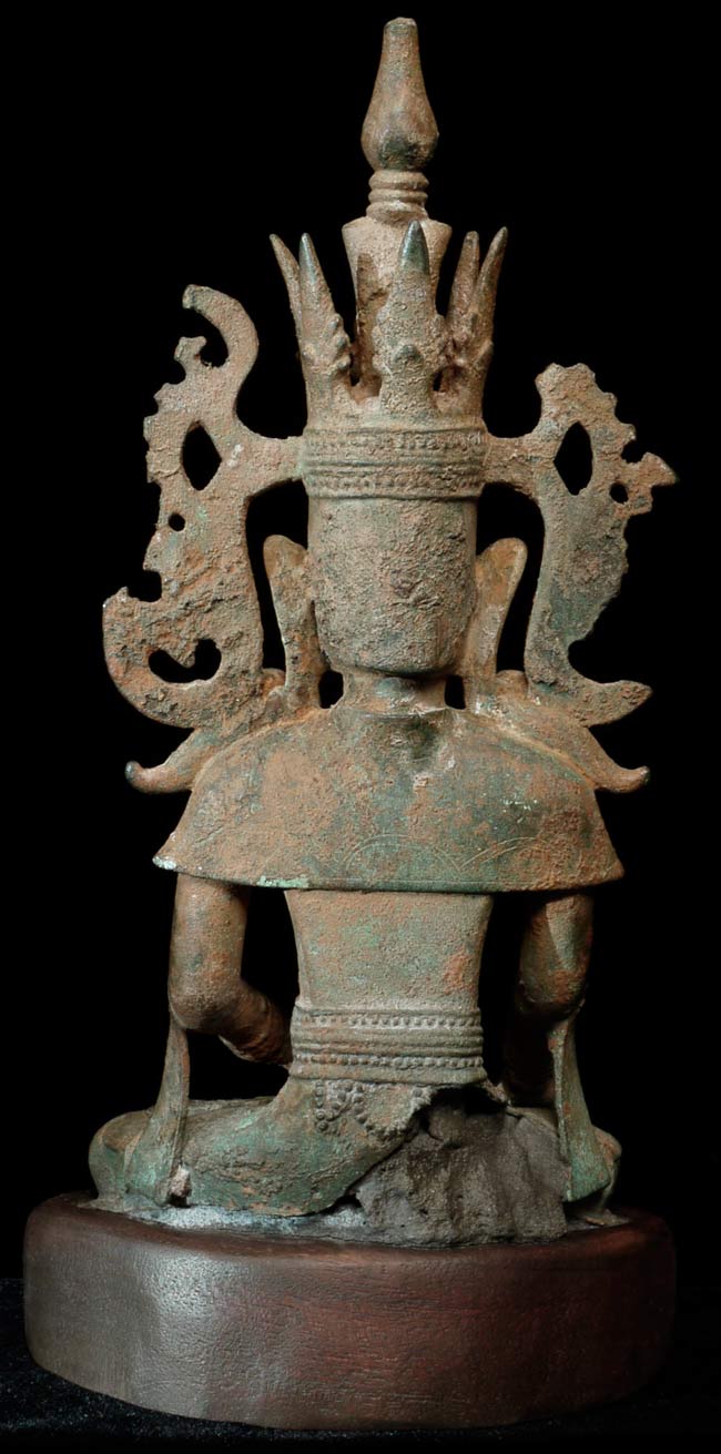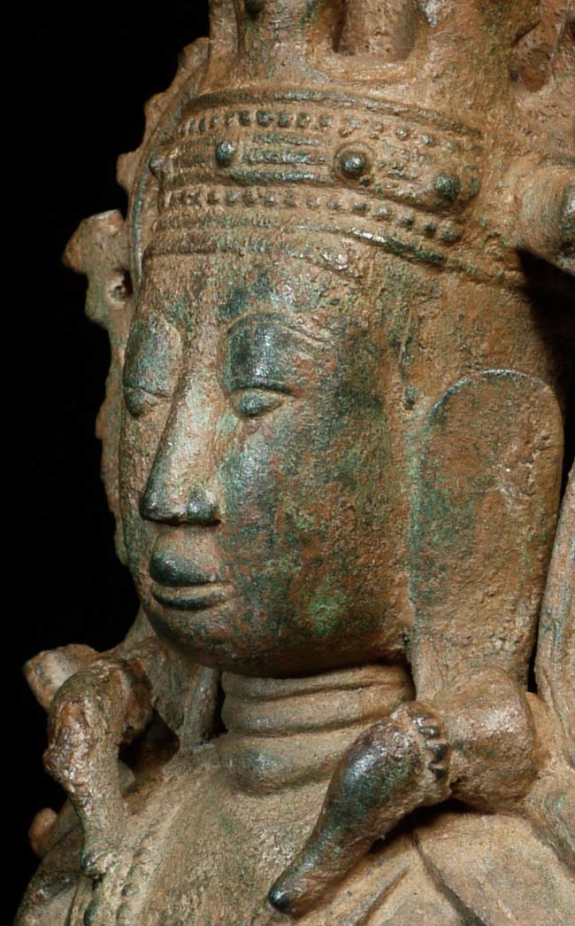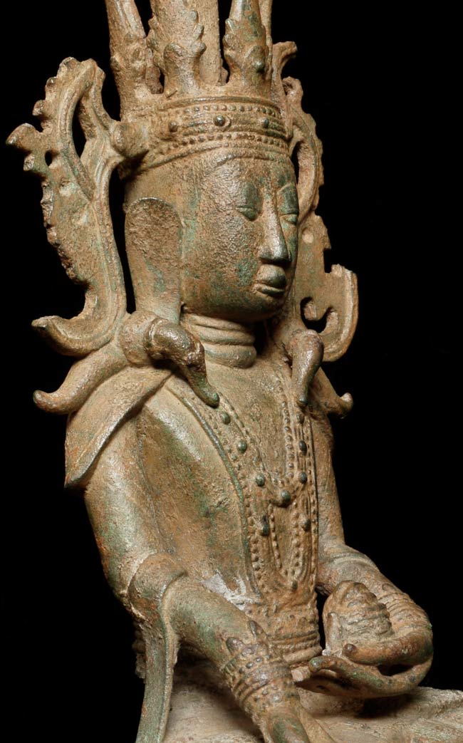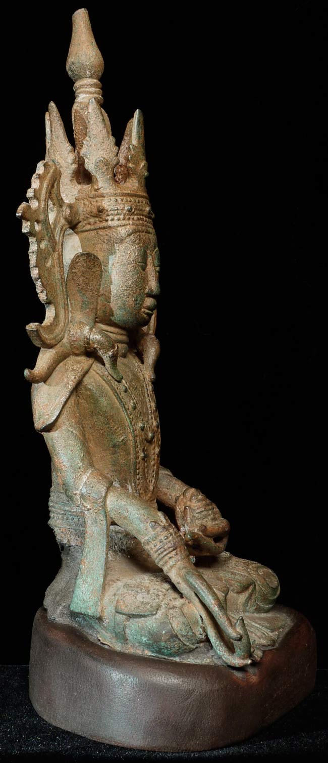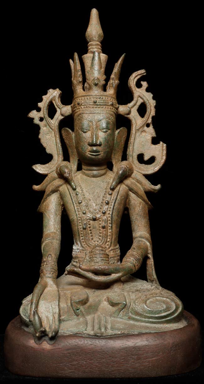 Extra special 17/18thC Burmese bronze Buddha in Royal Attire. Exceptional sculpting, casting and finishing. One of the best faces I have encountered-ever- on this type of Buddha. Losses to crown and base as seen in the photos. Was almost surely buried for centuries. Total height of 10.5" on a custom base that is 1" tall, 5.5" wide, 4" deep.