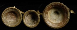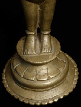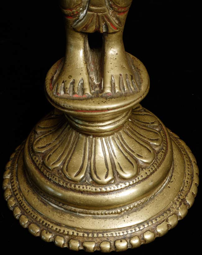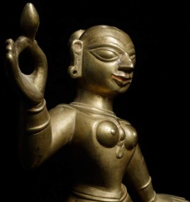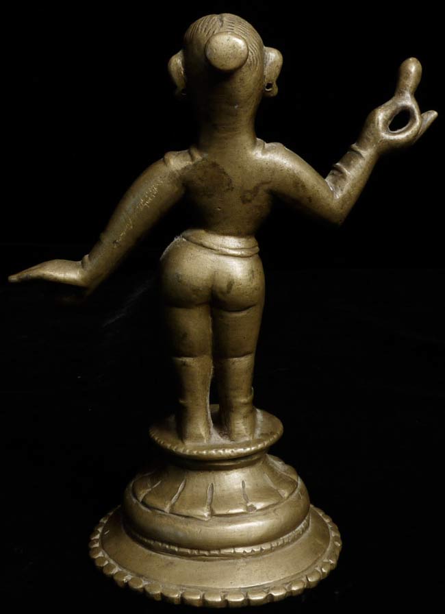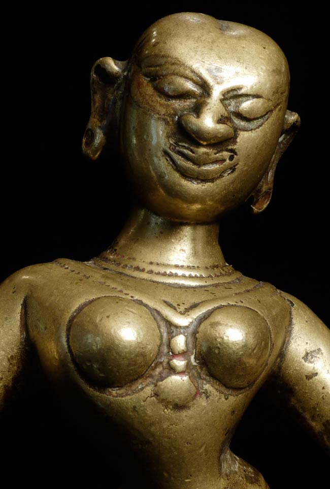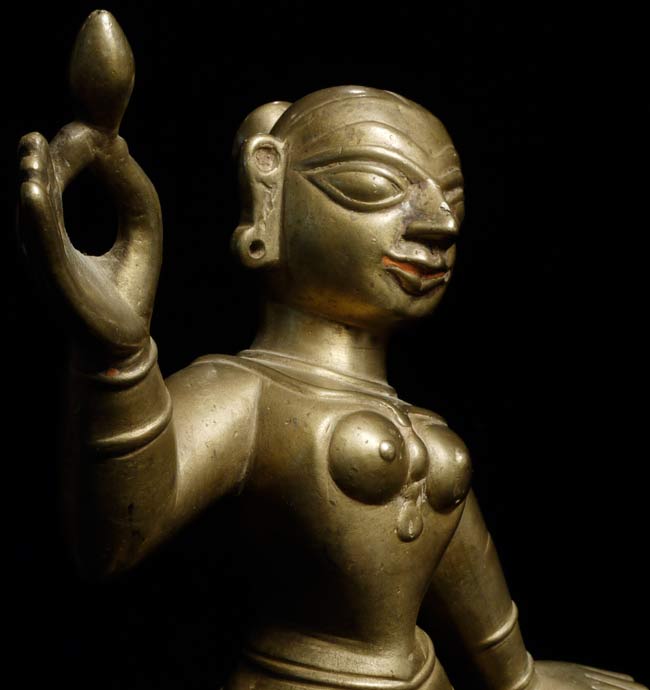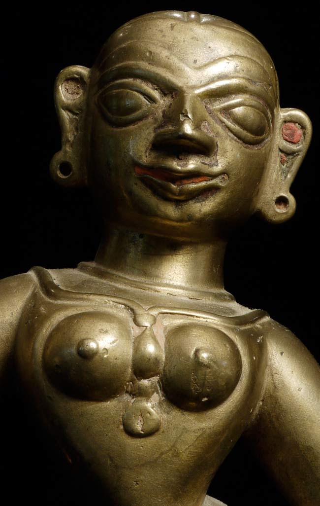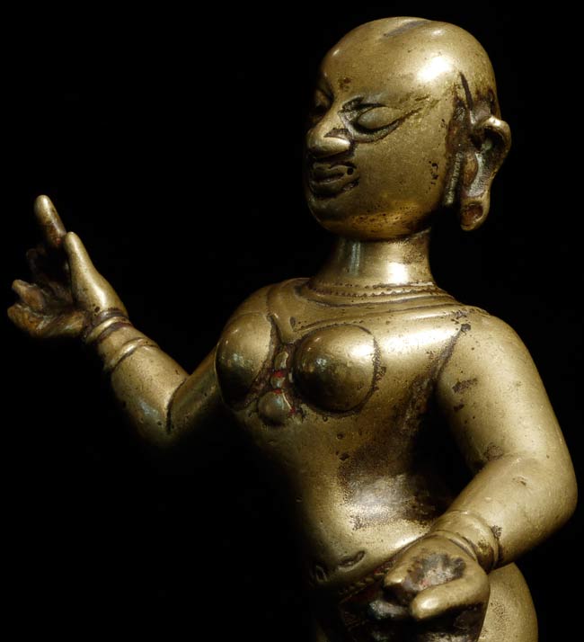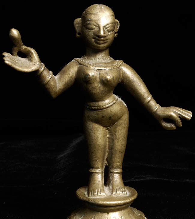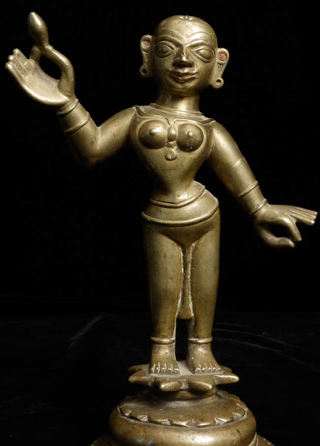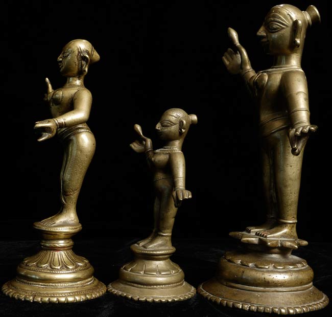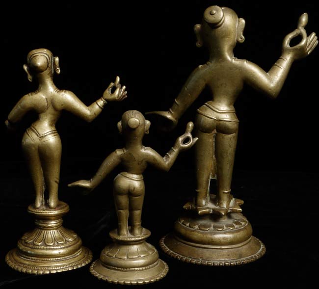 Set of three large solid-cast Indian bronzes. Nice examples- probably 15th to 18th century. The tallest is 9.25", the shortest is 6". All have wonderfully large hands (right holding a lotus), and a great sway to their hips.