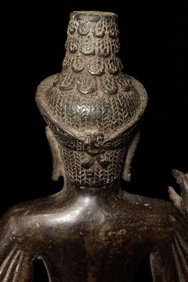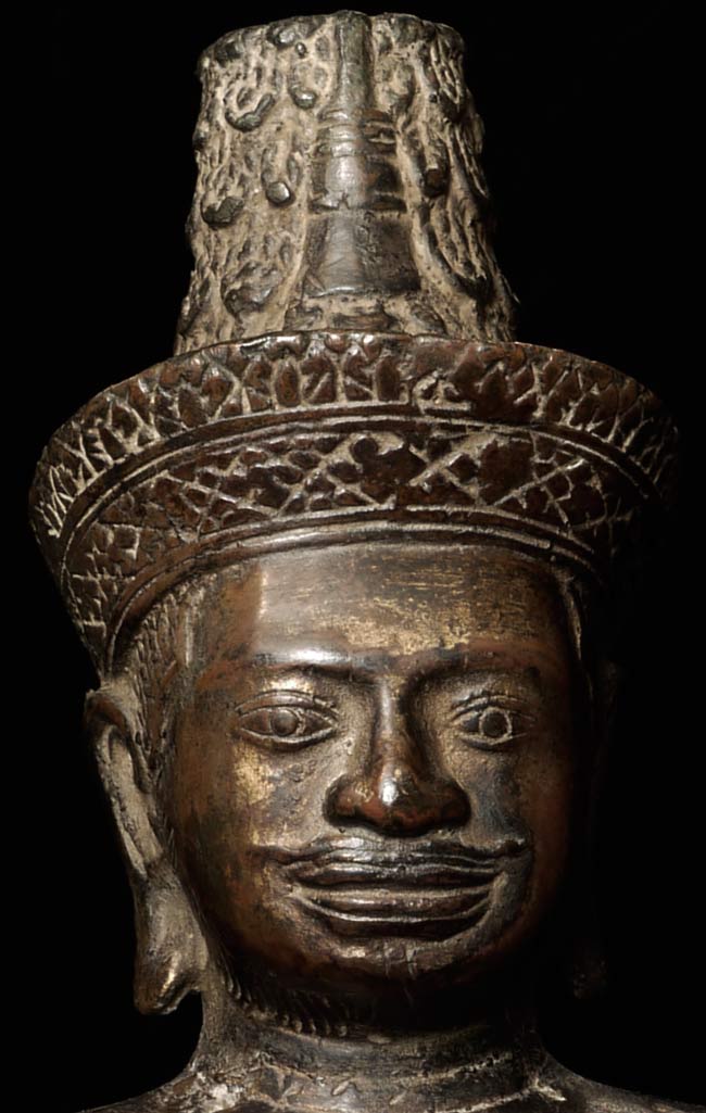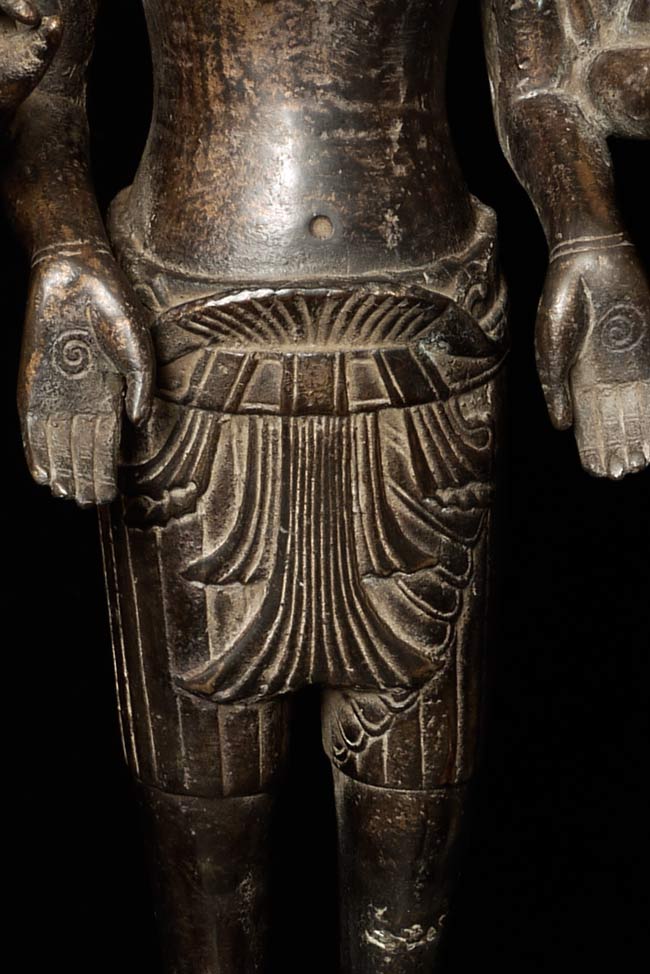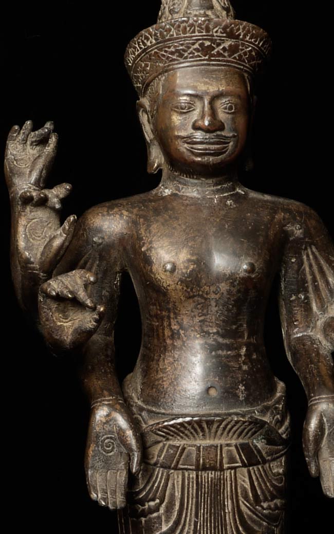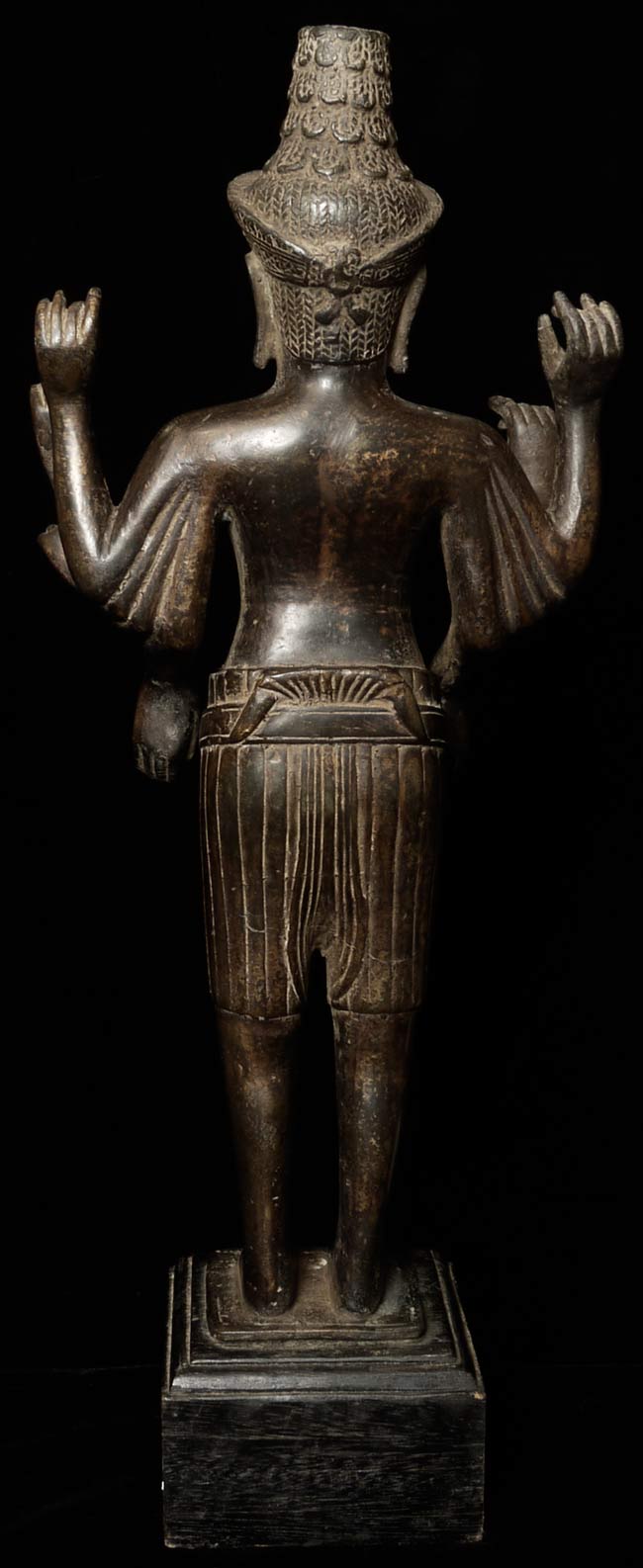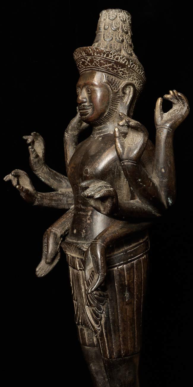 Superb eight arm figure from Cambodia or Vietnam. Purchased from a gentleman who bought this many years ago from a farmer in rural Vietnam along with several other pieces the farmer had been keeping in his barn. The seller believed that this piece is late Cham style. The Cham culture (Champa) floursihed in an area which is now part of southern Vietnam. While the Cham culture (as the parallel Khmer culture in Cambodia) flourished for many centuries up through the 13th century, I believe that this piece is antique, though probably not a period piece. Possibly 18/19thC, though I am truly not sure. Large, with a total height of 17", bottom measures 3.75" square. Beautiful, with a commanding presence.