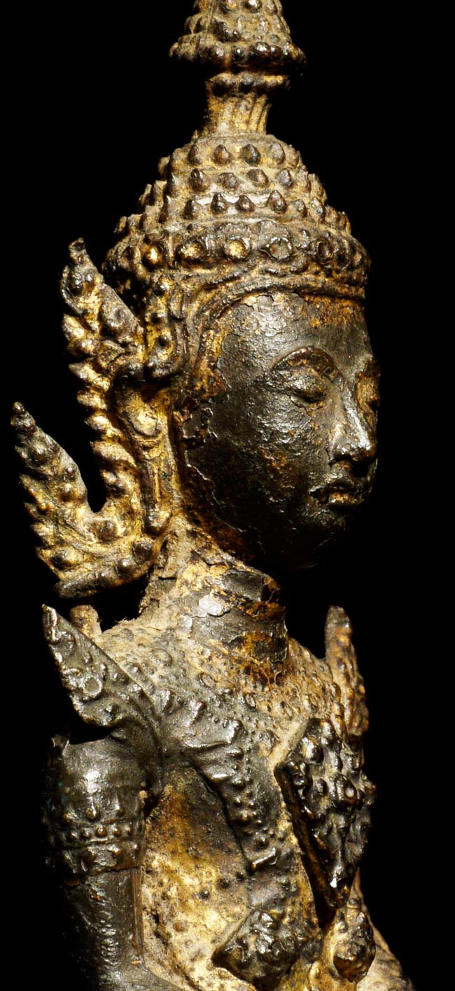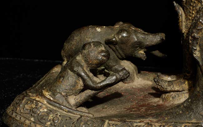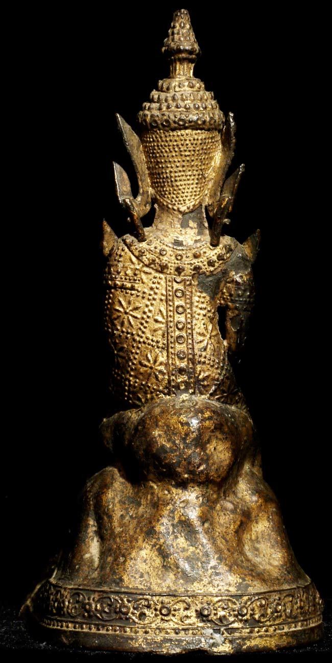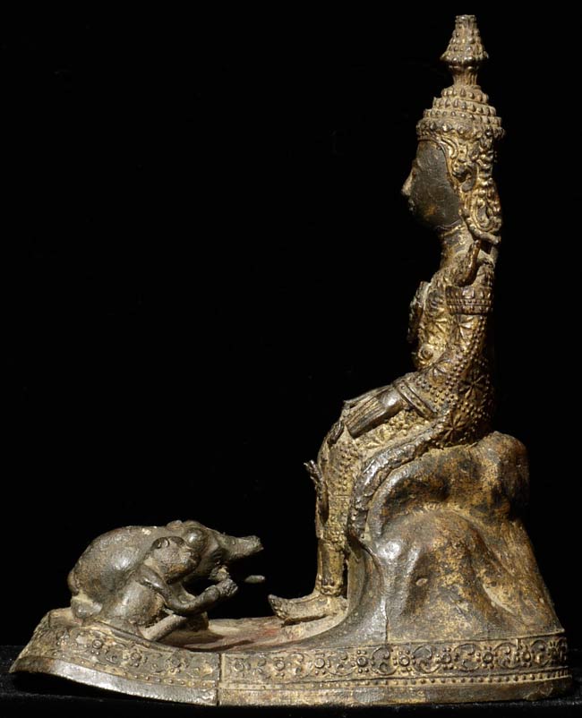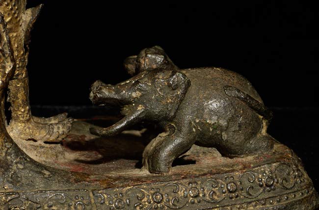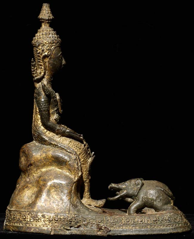 Very sweet 19thC Thai Rattanakosin Buddha with an elephant and monkey at his feet. This type is specific to Thailand. 6.25" tall, 5 1/8" x 3" on bottom.