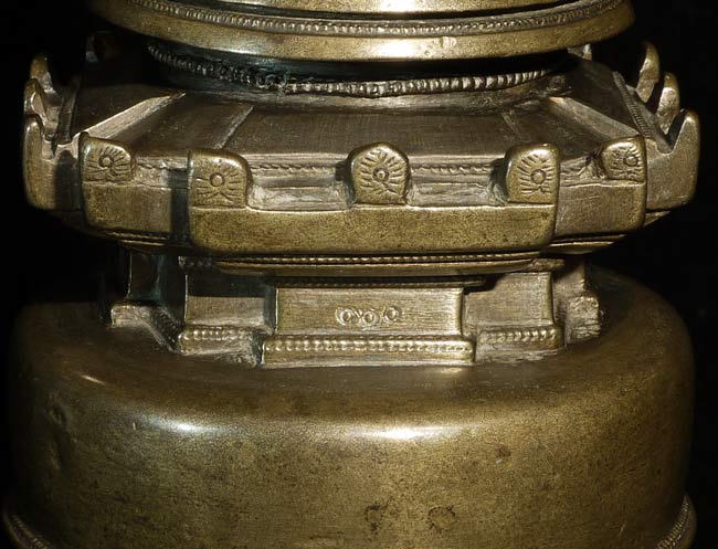 Early Tibetan bronze Stupa of excellent quality. Probably 13/14thC, though may be a bit later. Remarkably, the original seal appears intact. A very good size at 8.5" tall, bottom diameter of 4.25. Lovely detail!