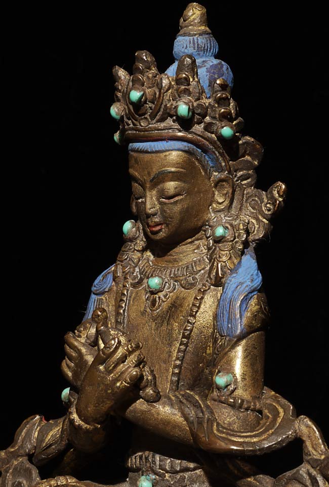 Lovely Antique Tibetan Buddha with beautiful base. 7.5" tall, bottom is 5.5" x 3". Consecrated. Exquisite! Closely related to iten # 4560. They are nearly identical except that the mudras and attributes are different.
