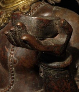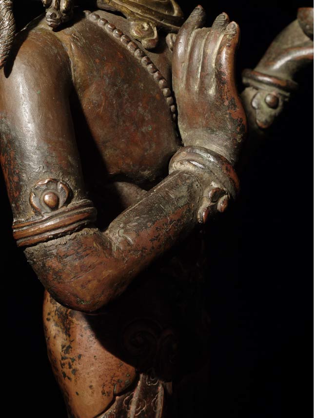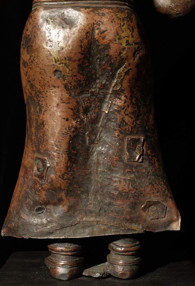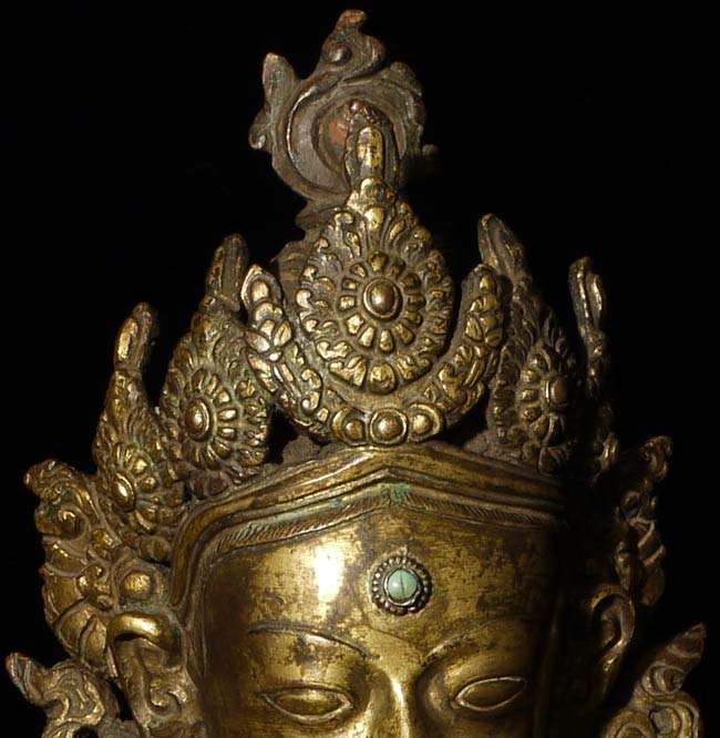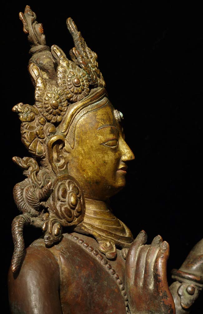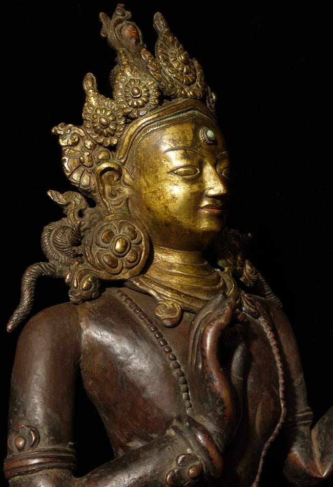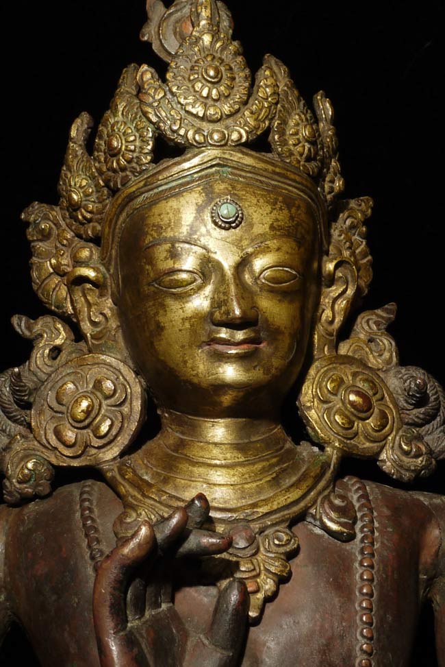 Rare 14/15thC Tibetan Bodhisattva. Body is repousse, head is cast. All original. Quite large for such an early piece at 16" tall on attached base (14.4 inches for statue alone. Expensive.Additional optional base lifts the piece another 2.25".