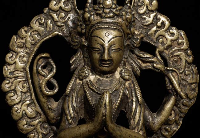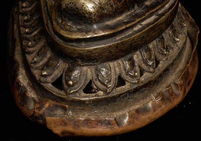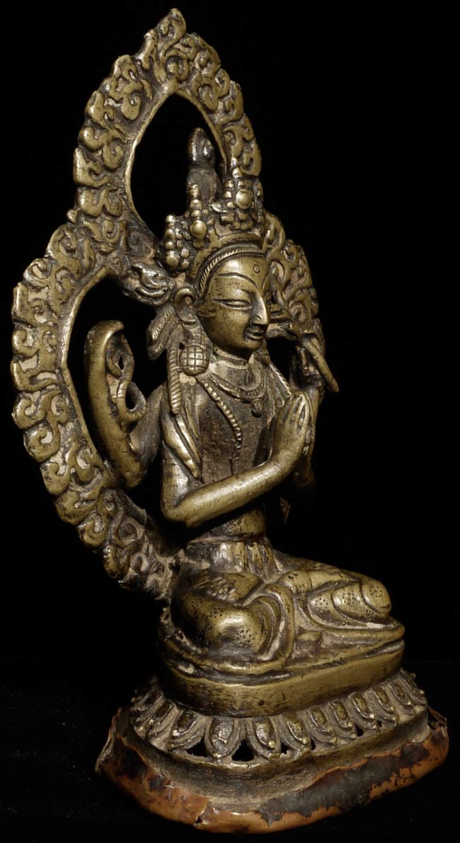 19thC Nepalese Buddha. Mandorla is slightly loose and leans to one side if not propped up. Would be easy to fix. 6.25" tall, 4" at widest point