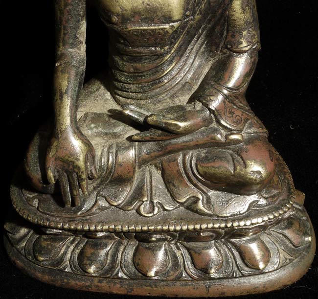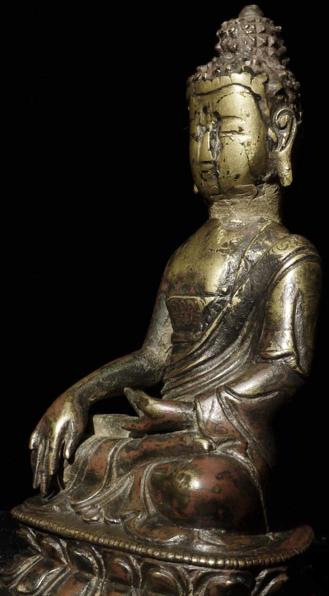15/16thC Tibetan Bronze Buddha. Significant wear and recarving to the face. Unusual. Sits 4.25" tall.