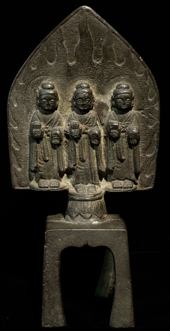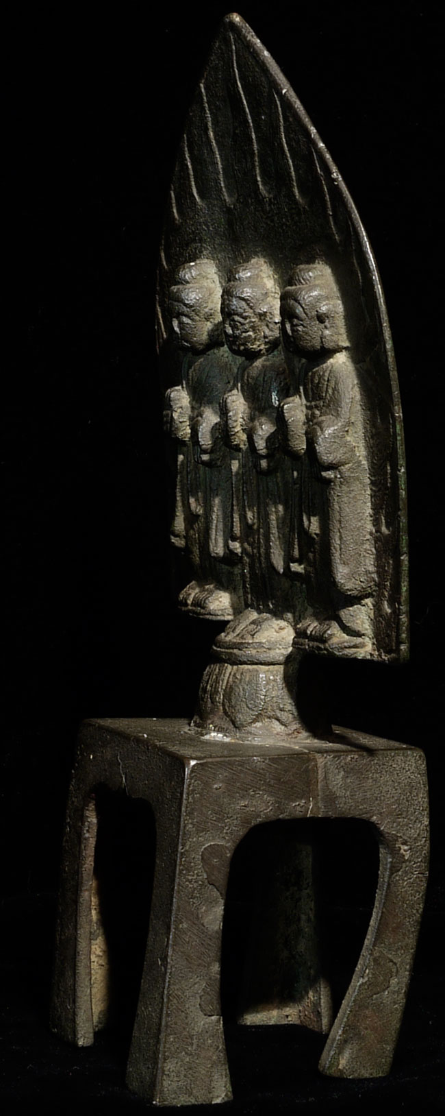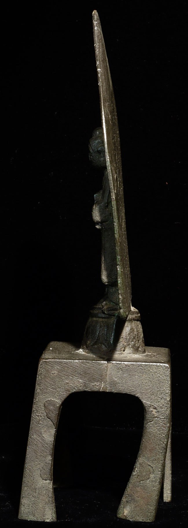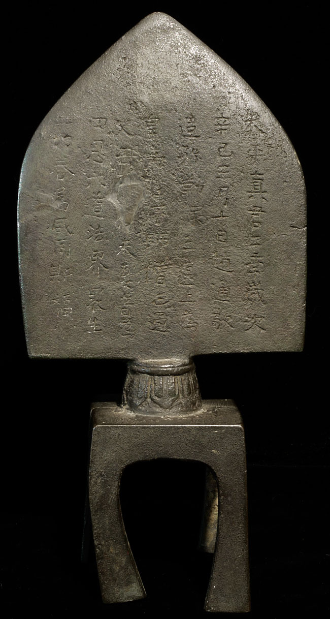 From the collection of a prominent collector/dealer/appraiser. She dates this to the Ming Dynasty in a much earlier style. Extensive inscription on the back. 9 1/8" tall, 4.5" at widest point
