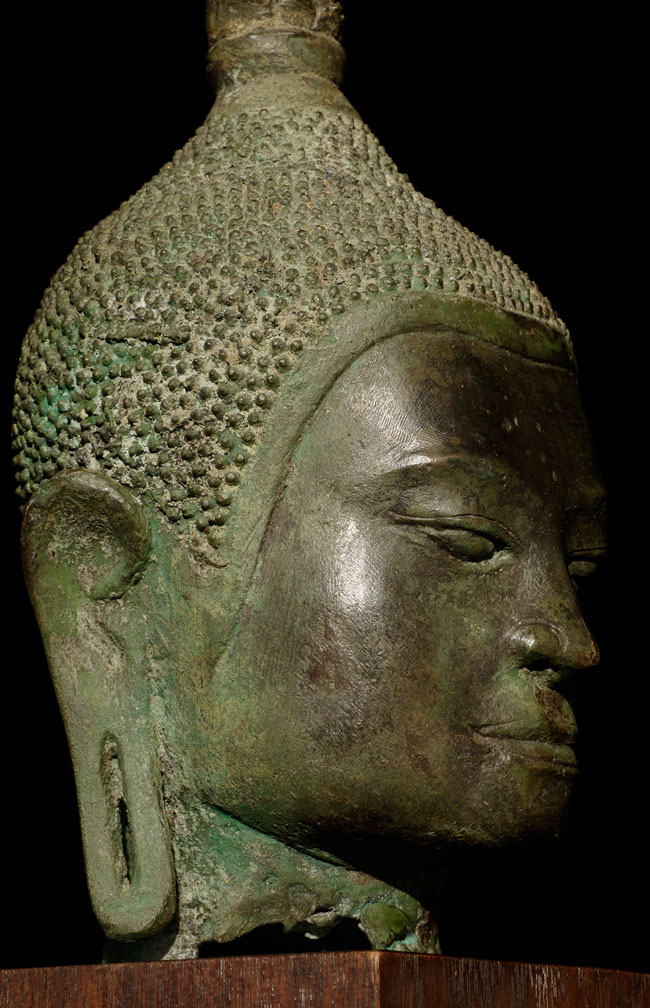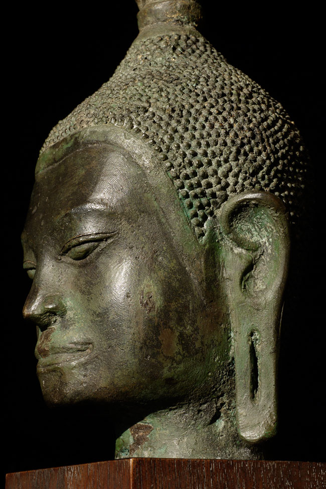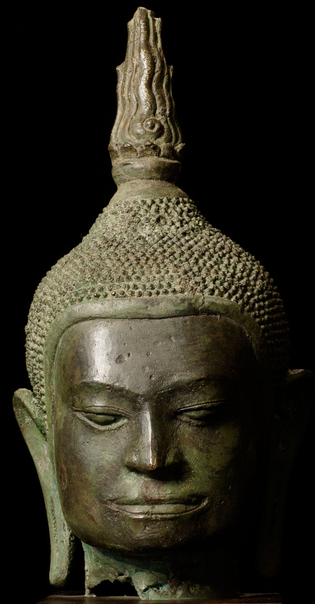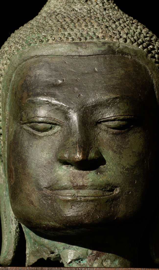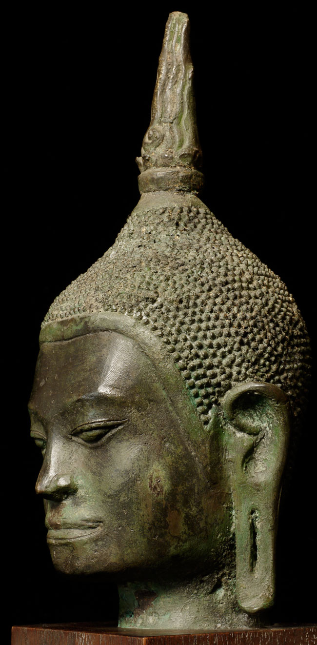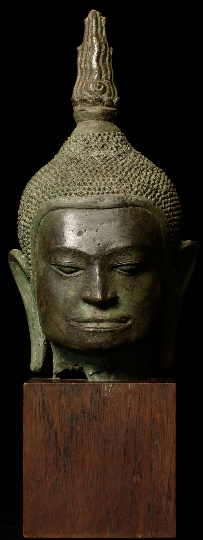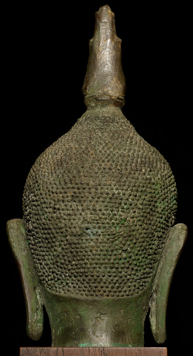 Beautiful 14thC Utong style Thai Buddha head. Traces or original lacquer and gilding. Outstanding example of its type. Very good size at 8" tall, base adds another 3.25" in height.