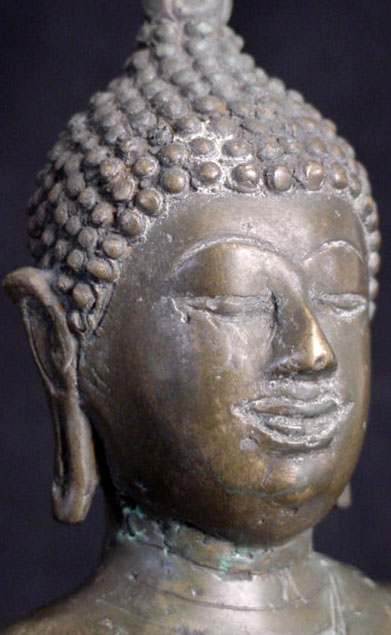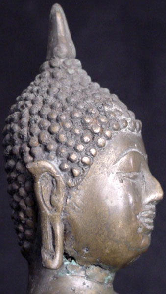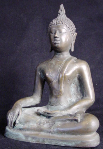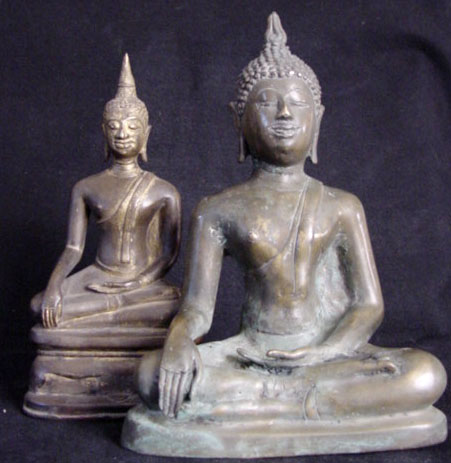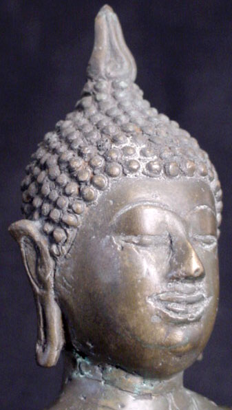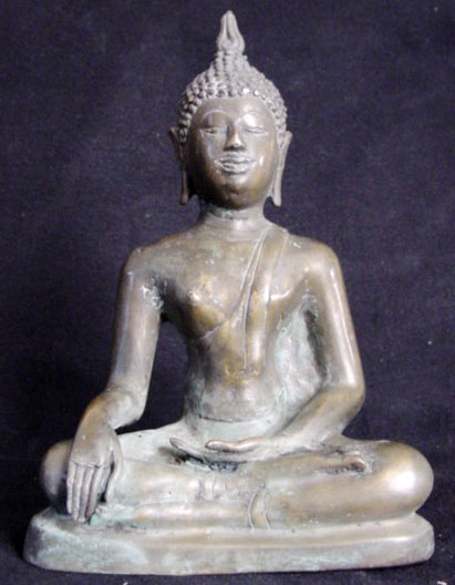 This is a nice Northern Thai Buddha: it is 19th or possibly very early 20th century. It stands 8 inches tall, but it is larger than its dimension suggests, as it has a very short base. I put a 7.25 inch Buddha in one photo to give a sense of its mass. Note the wonderfyl wear to the nose, which looks to have been rubbed many times over the years