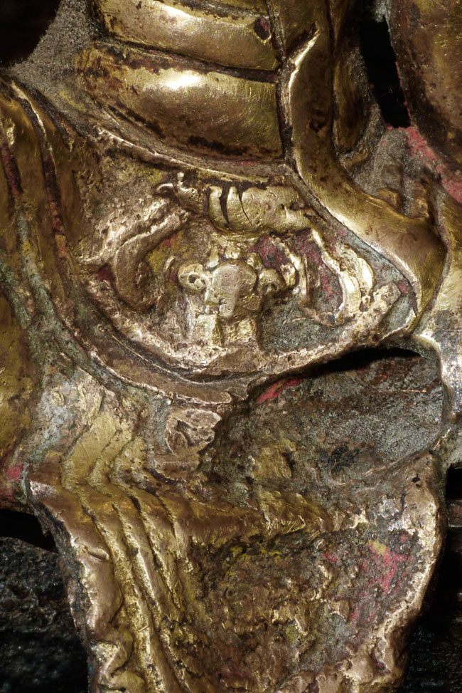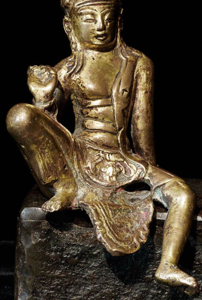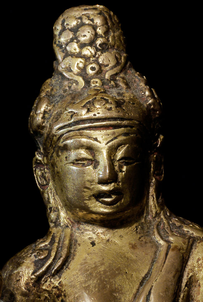 Nepalese PAdmapani in an archaic style. I believe this one is 19th century, but may be earlier. Mouth might be re-carved. Sits 4.75" tall from top of head to bottom of lower foot.