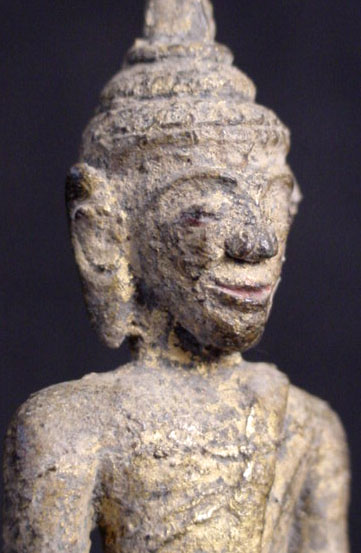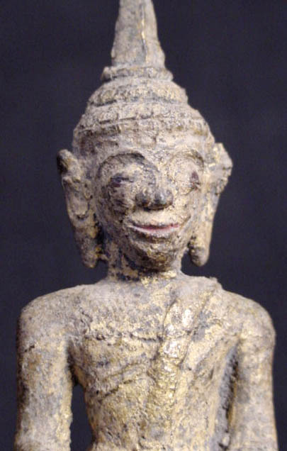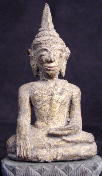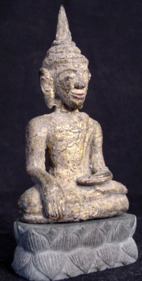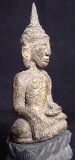 This is a very good quality small Laos Bronze Buddha. It has an excellent face and overall composition. Most of the original gilding remains. He has a small protrusion on the base which fits in to the custom base. He stands 3 and 1/8 inches, and 4 inches including the base.