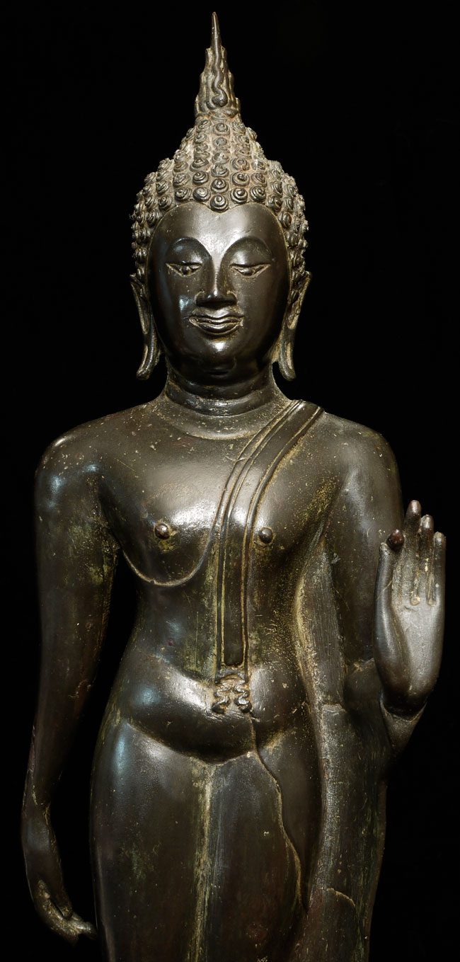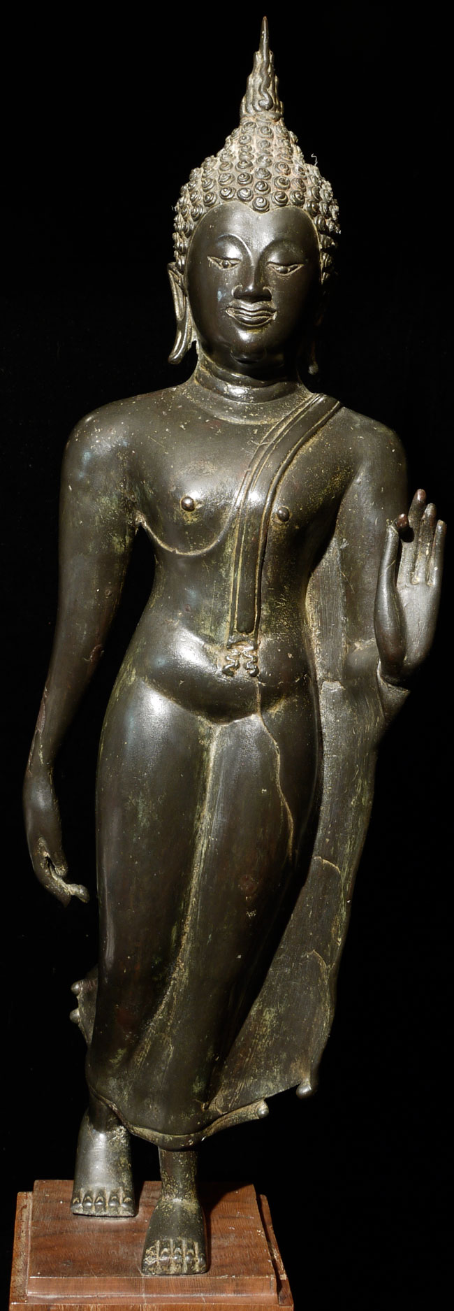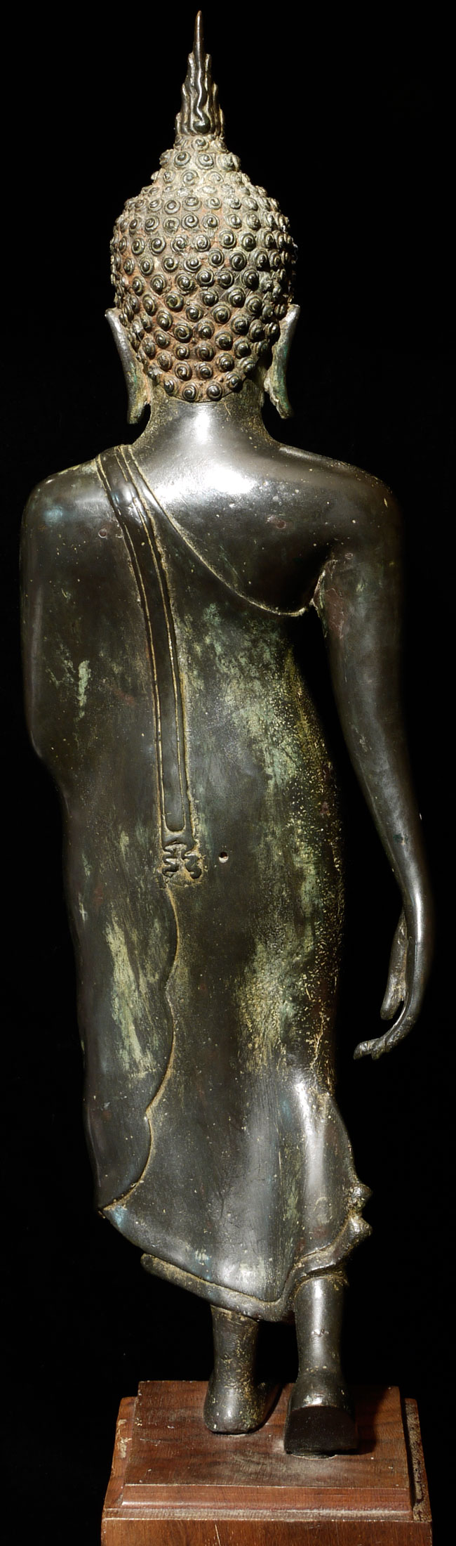 Superb antique Thai bronze walking Buddha. I believe this Buddhas may be 16/17th "Northern Sukothai", though it may be later. It is finer and styled differently than the late 19thC Sukothai revival style made popular under Rama V (the "King and I" king). Beautiful jade green patina typically sometimes found on Northern Thai Buddha images. Sild-cast (heavy), and sits a good 15" tall, total height including base is 18.75". Wonderfully fluid.