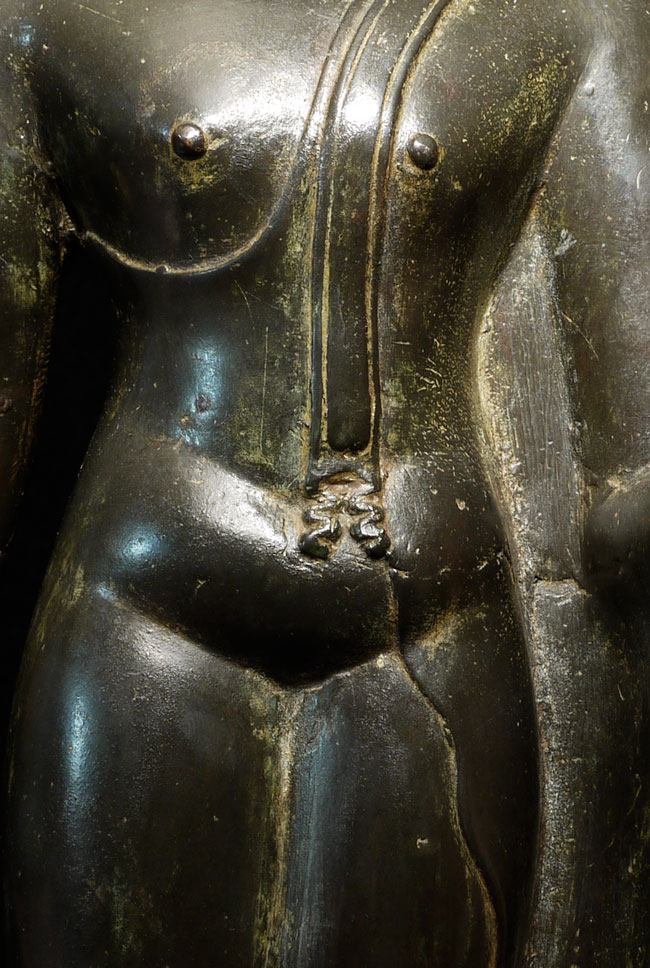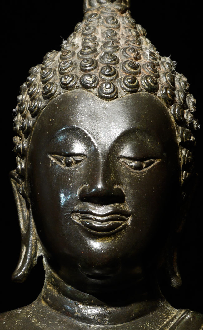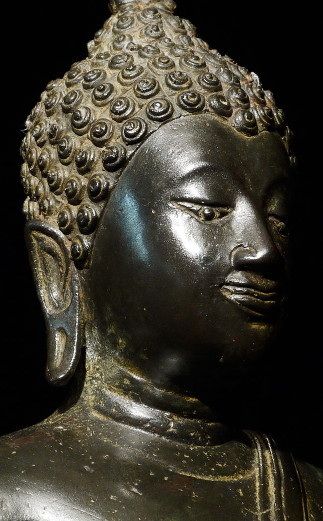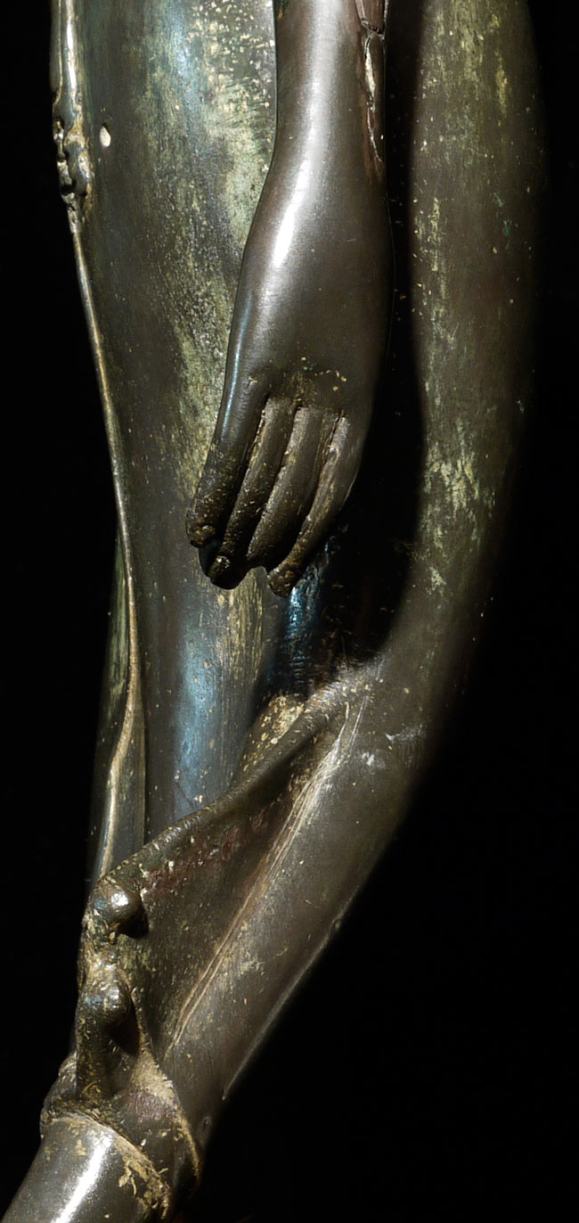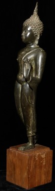 Superb antique Thai bronze walking Buddha. I believe this Buddhas may be 16/17th "Northern Sukothai", though it may be later. It is finer and styled differently than the late 19thC Sukothai revival style made popular under Rama V (the "King and I" king). Beautiful jade green patina typically sometimes found on Northern Thai Buddha images. Sild-cast (heavy), and sits a good 15" tall, total height including base is 18.75". Wonderfully fluid.