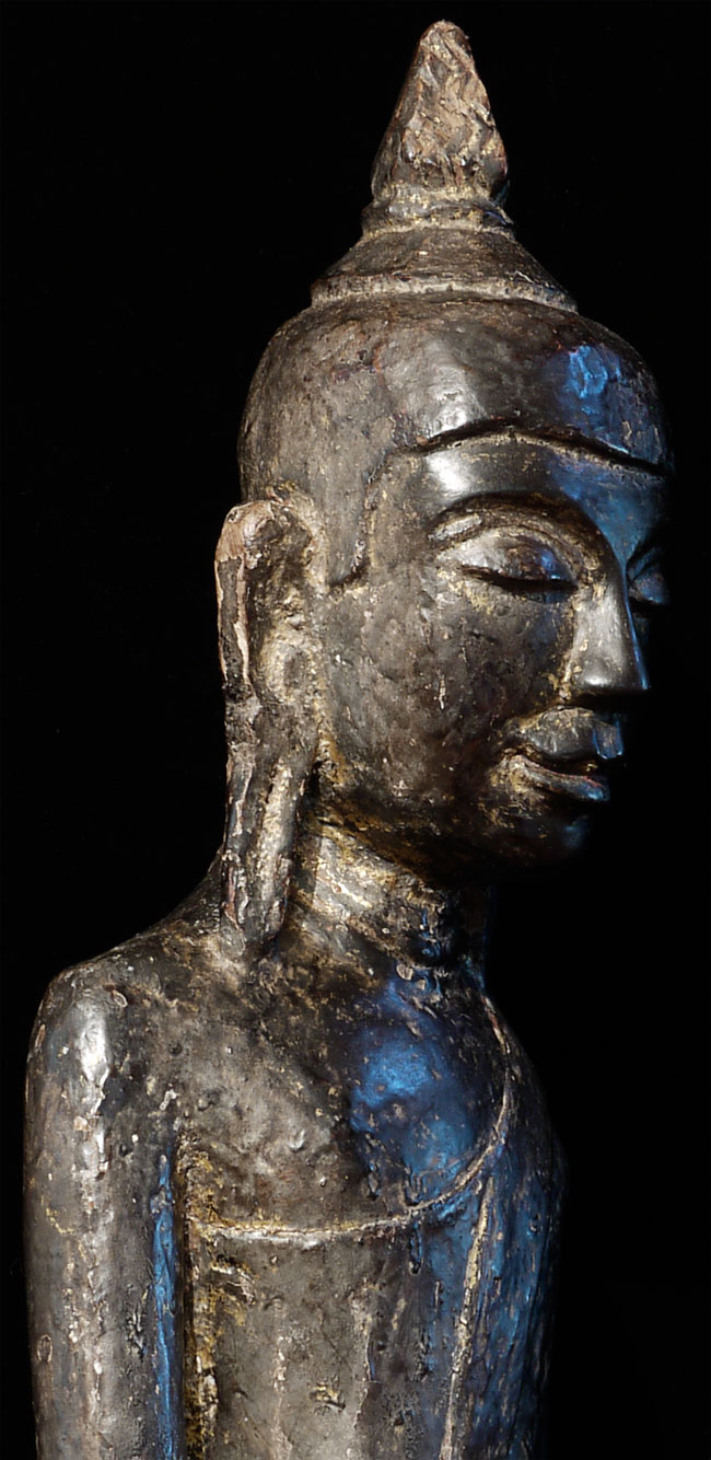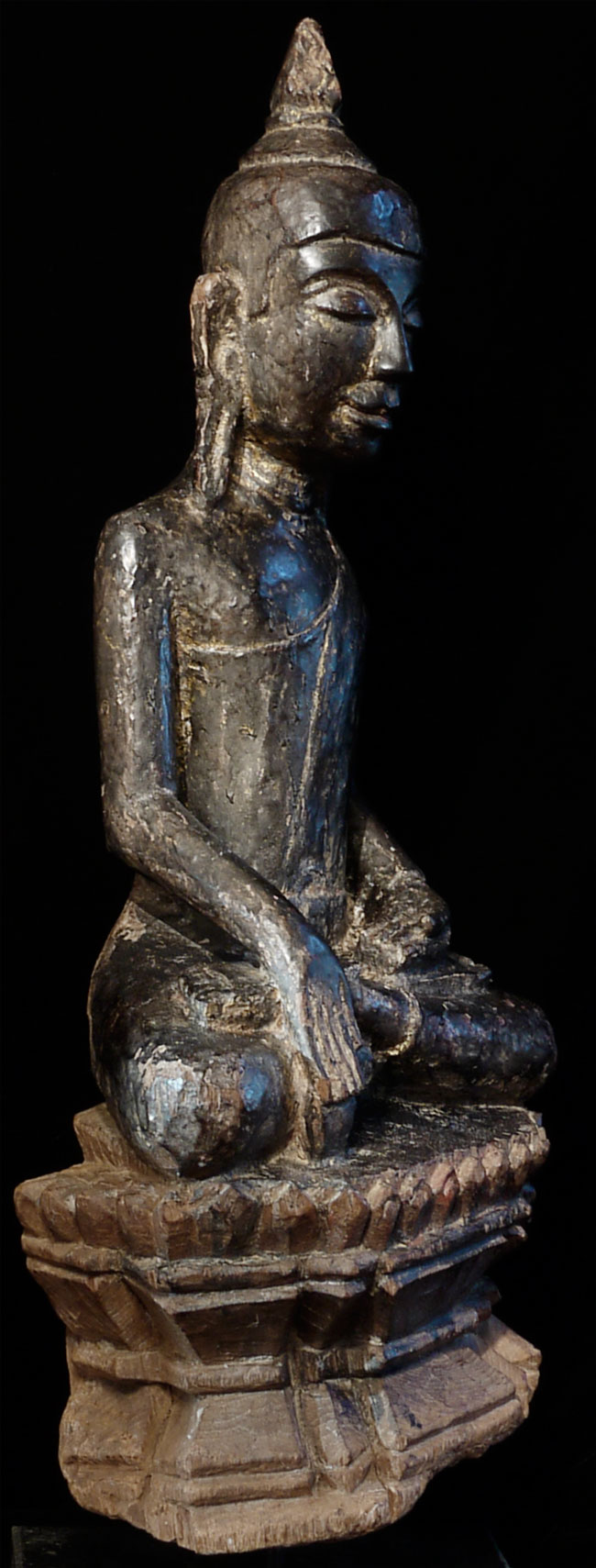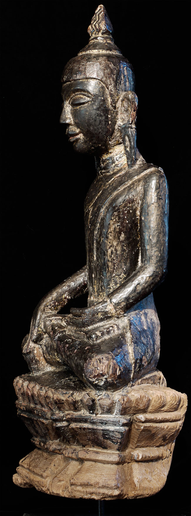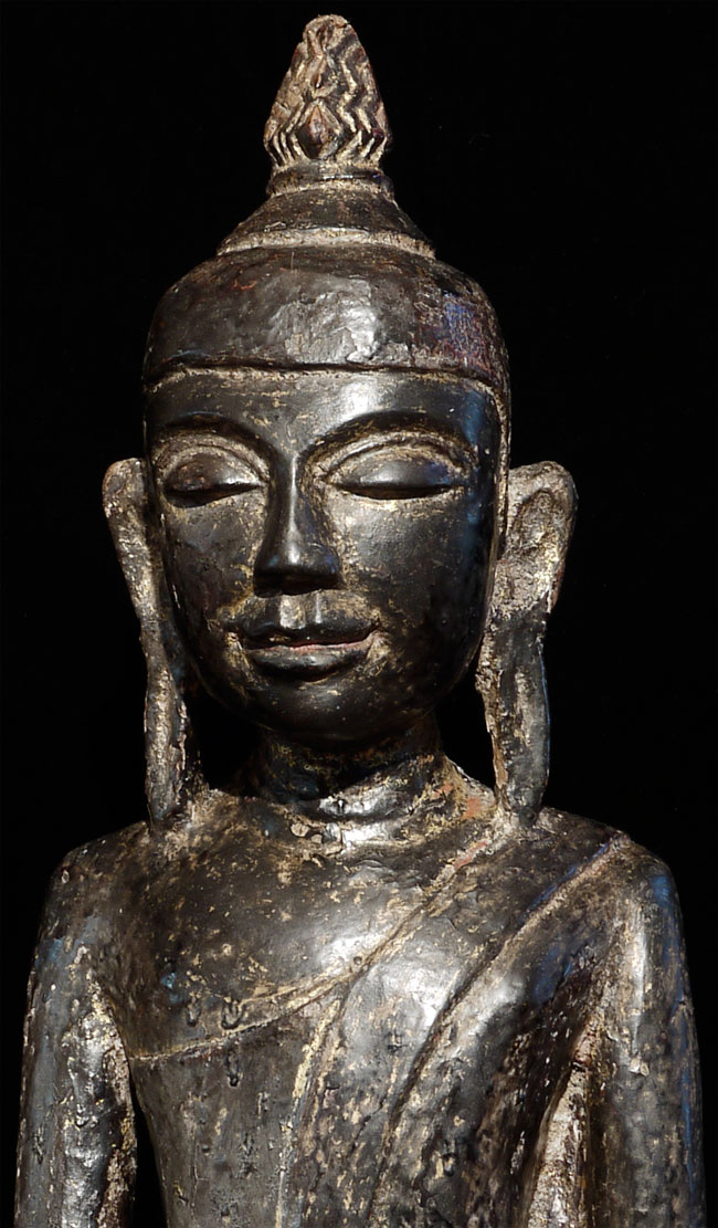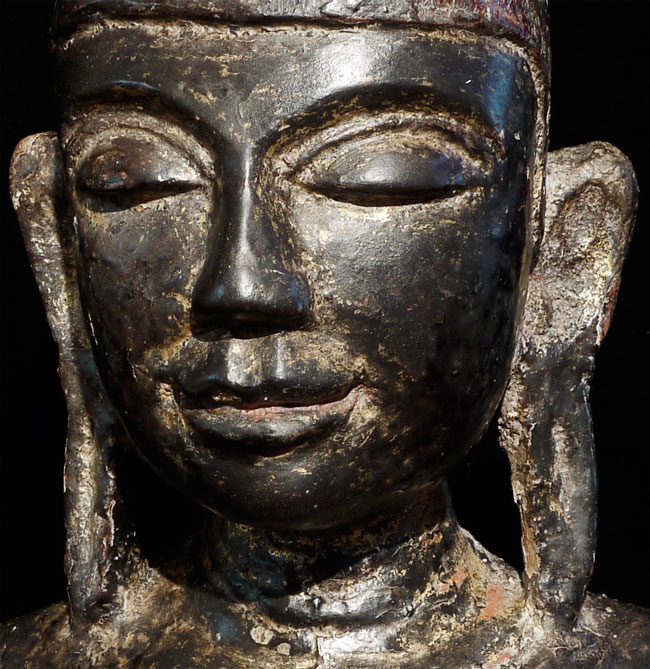 Fantastic 16/17thC Mon style Burmese laquered wood Buddha. Sublime countenance- he lights up any room. Hard to find in this good size and condition with such a beautiful face. Loss to the base (sitting hundreds of years in a hot, humid country-this type of loss is typical of authentic wood Buddh images of this age). Sits 25" tall, elevated to a height of 29" with the included base.