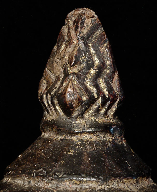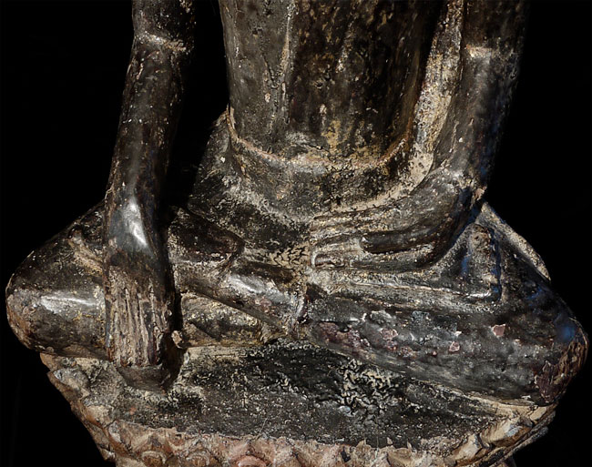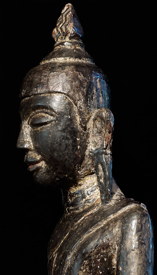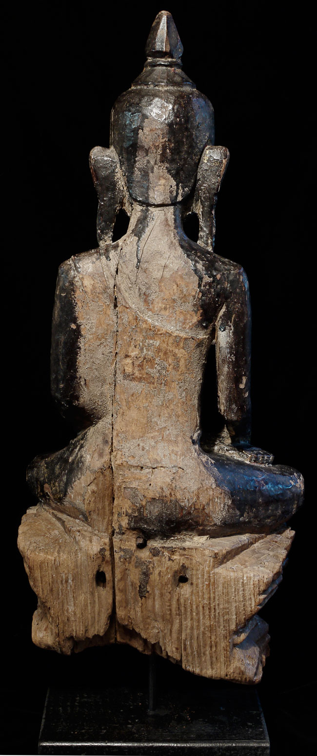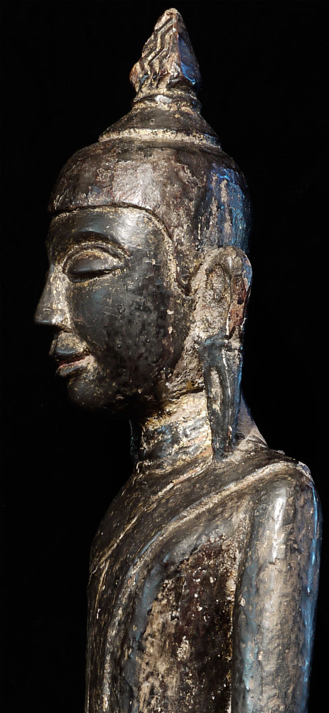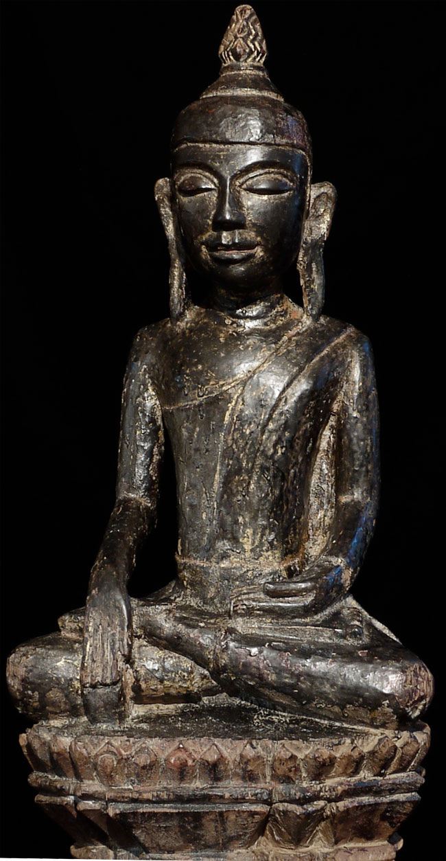 Fantastic 16/17thC Mon style Burmese laquered wood Buddha. Sublime countenance- he lights up any room. Hard to find in this good size and condition with such a beautiful face. Loss to the base (sitting hundreds of years in a hot, humid country-this type of loss is typical of authentic wood Buddh images of this age). Sits 25" tall, elevated to a height of 29" with the included base.