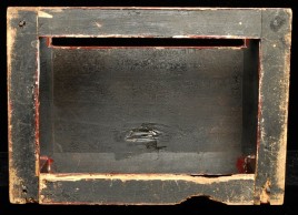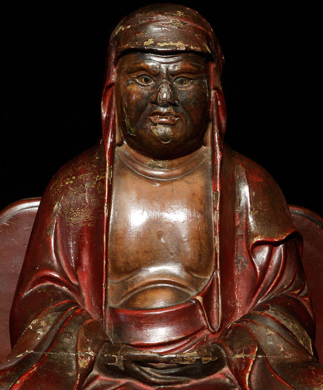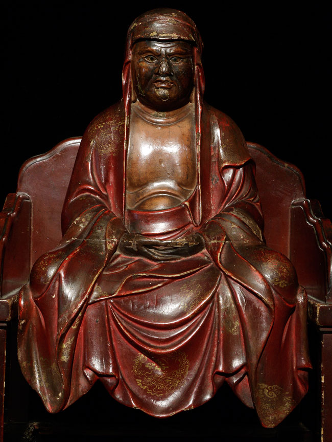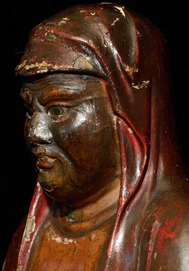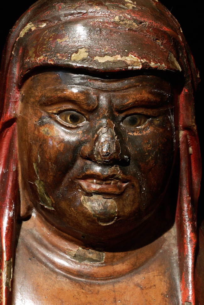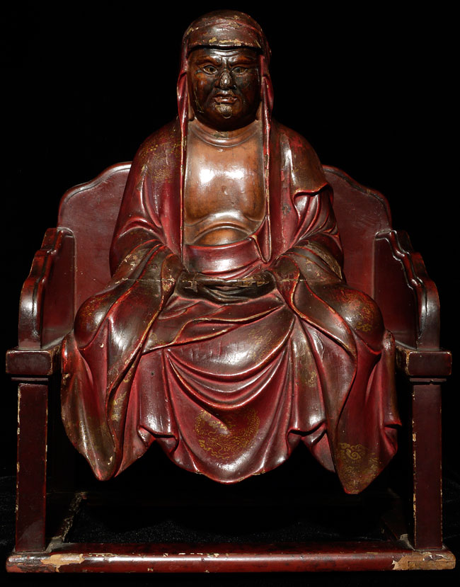 Penetrating 18thC Edo period Japanese figure with glass eyes. Loss and wear to the surface as seen in the photos. Powerful presence. Sits 11" total height, height to top of seat bench is 4". Width is 7.75" 5 5/8"