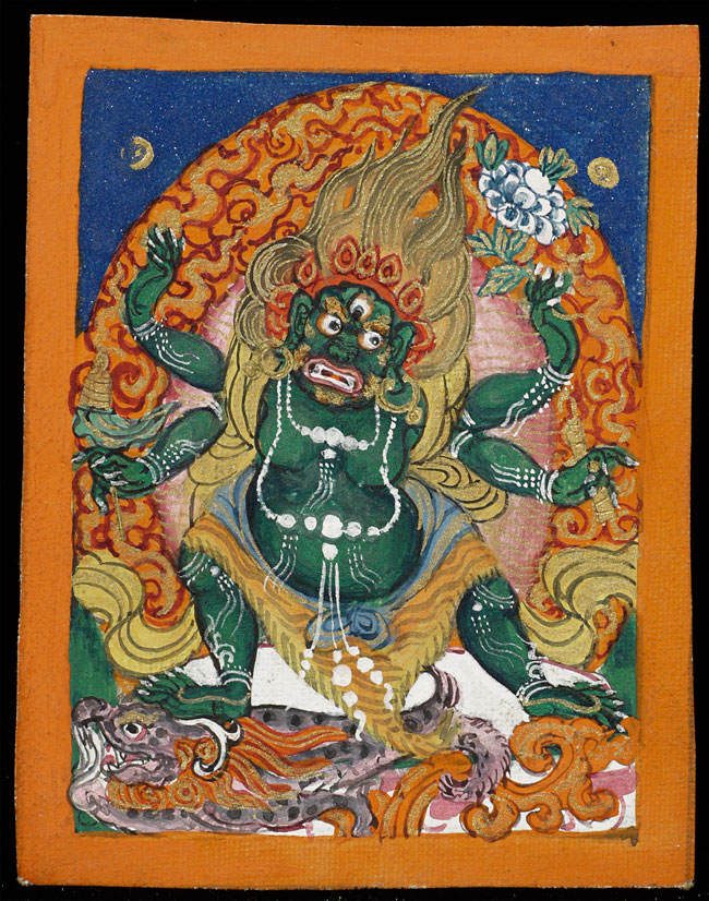 Wonderful antique Mongolian miniature thangka. Approximately 2.75" x 2.25". Sky looks to be crushed lapis.
