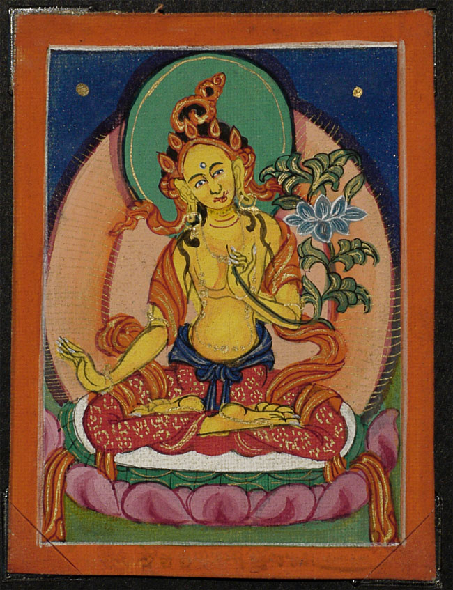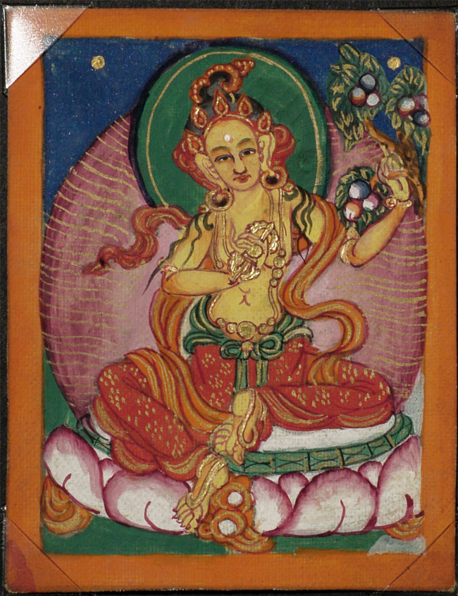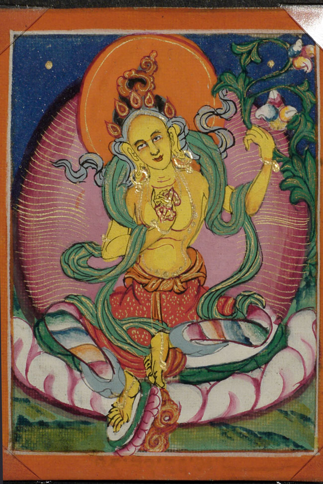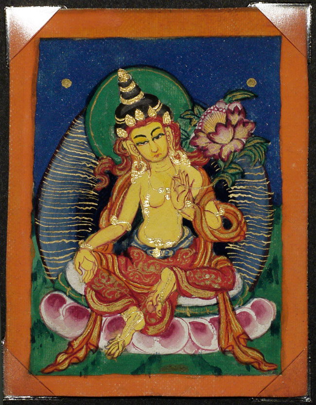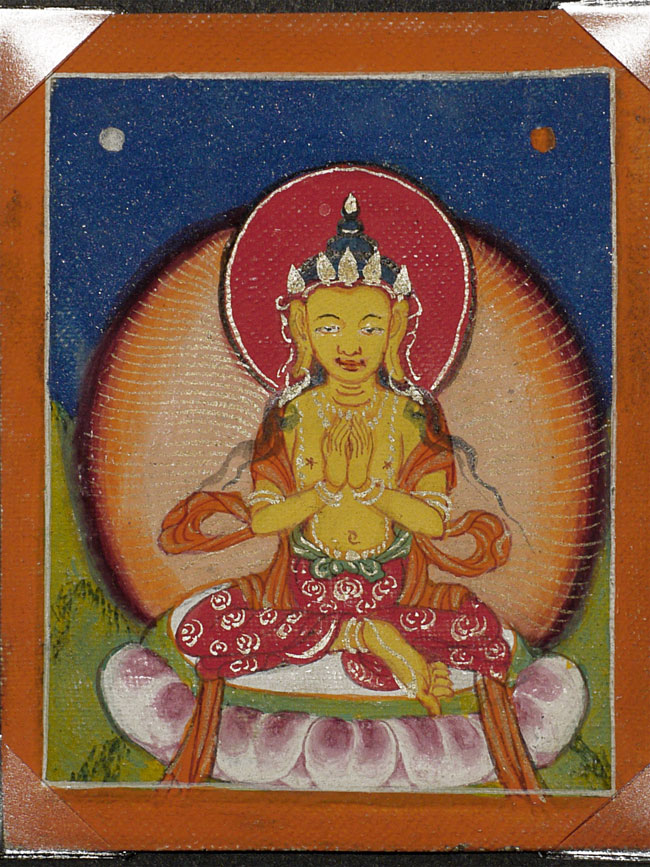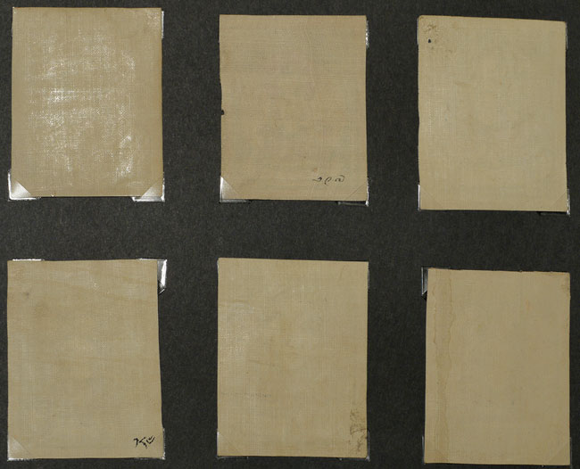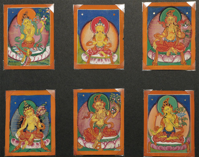 Wonderful set of six antique Mongolian miniature thangka measure. Each measures 2.75" x 2.25". Sky looks to be crushed lapis.