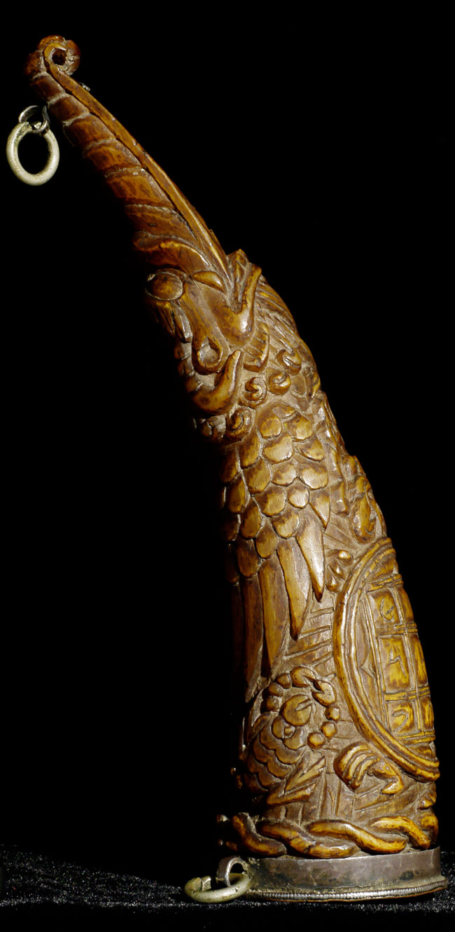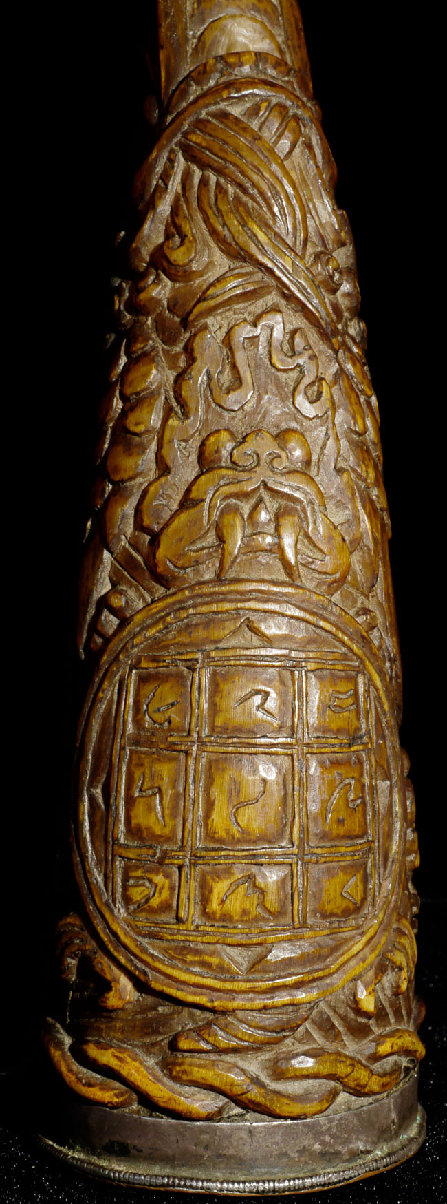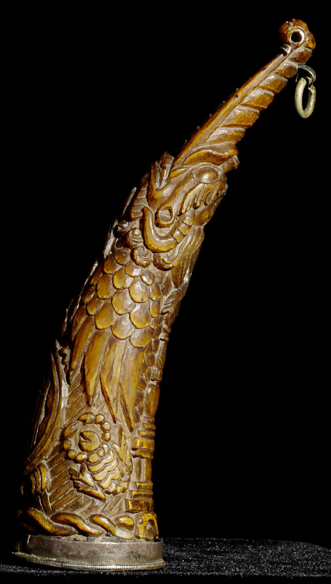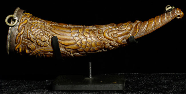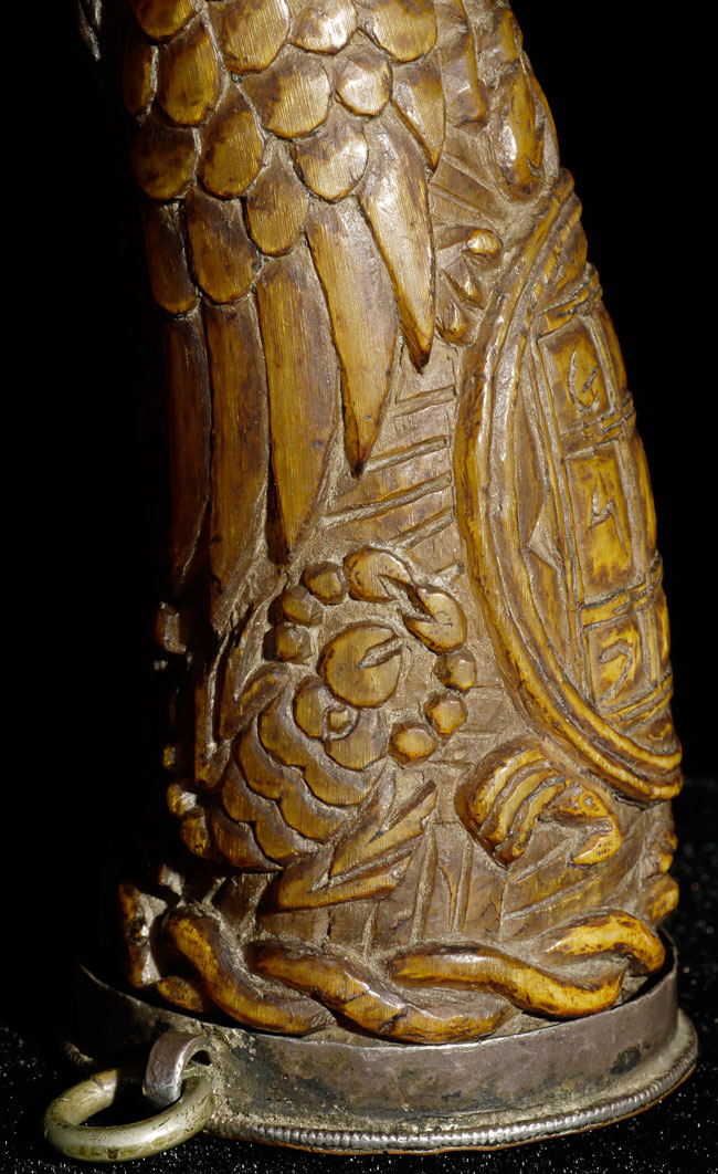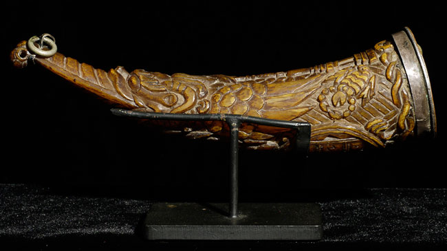 18thC supremely beautiful Tibetan Carved Horn. Beautiful patina and great finesse to the carving. 6.75" long, bottom has diameter of 1 7/8"