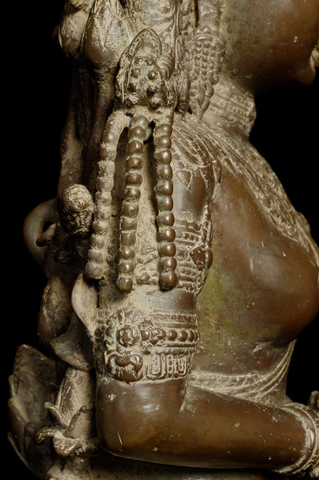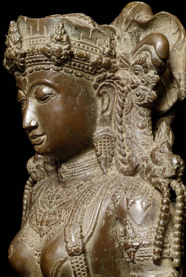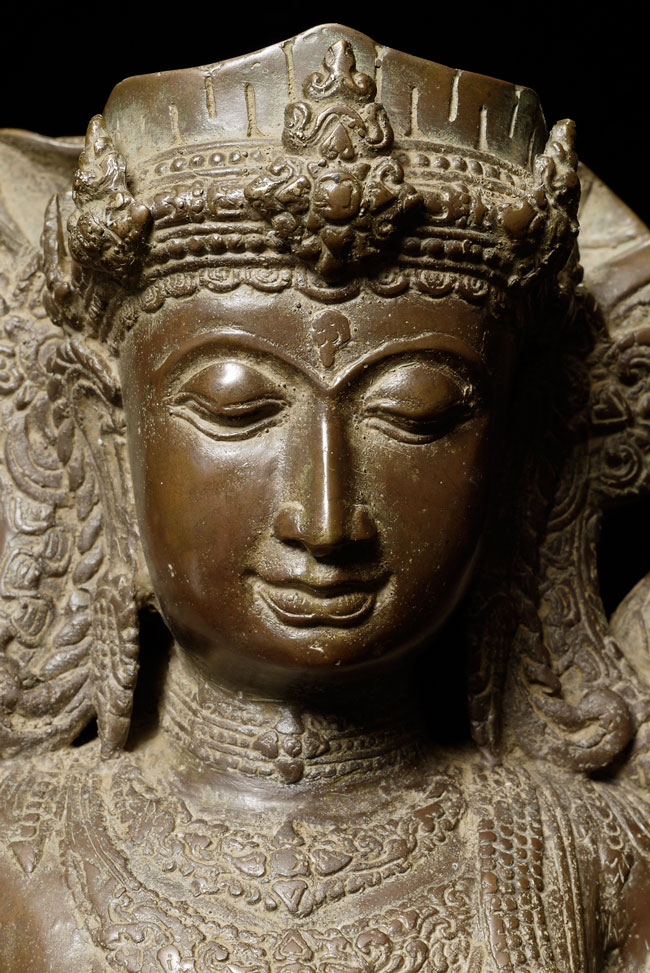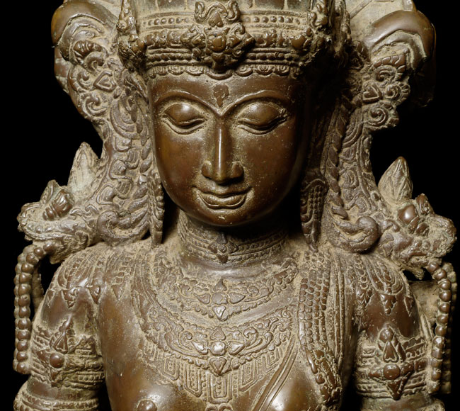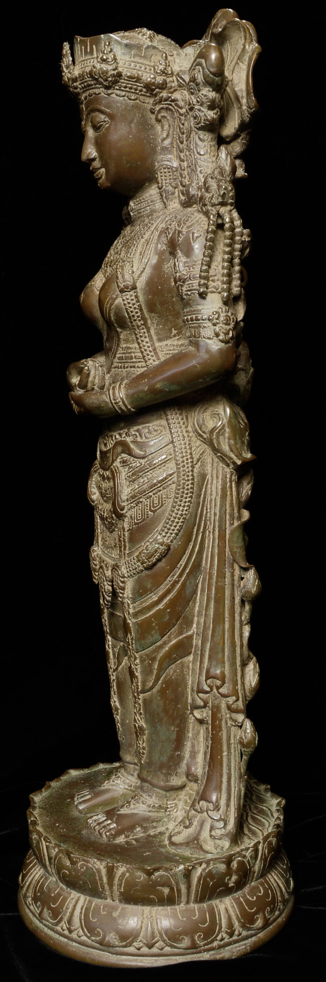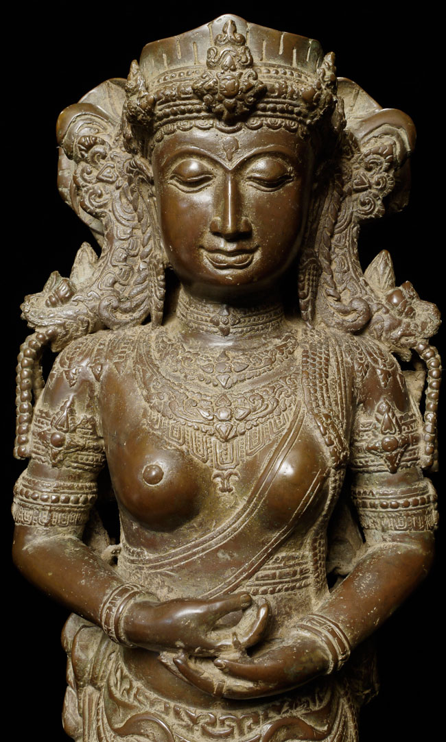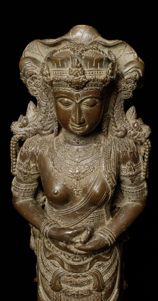 Spectacular Indonesian Goddess with unique and beautiful detail, especially on the back. Quite large at 22.5" tall, and very heavy. I think the actual figure is solid cast- not sure about the base. Based on the patina. casting style and quality, along with the look of the underside indicate age, though I do not know how to date this piece. Probably 19th century or earlier. Exquisite!