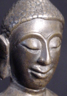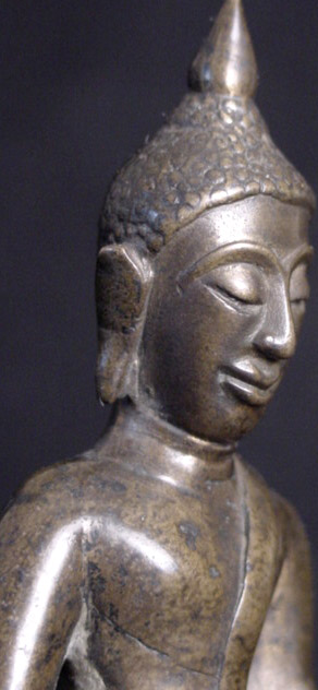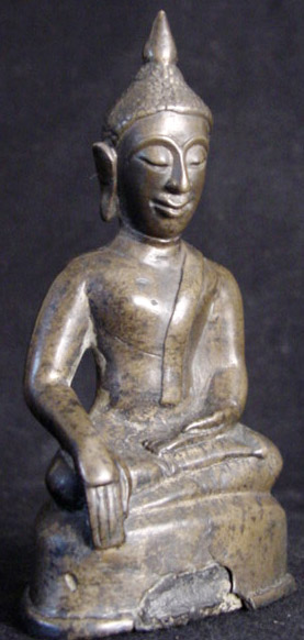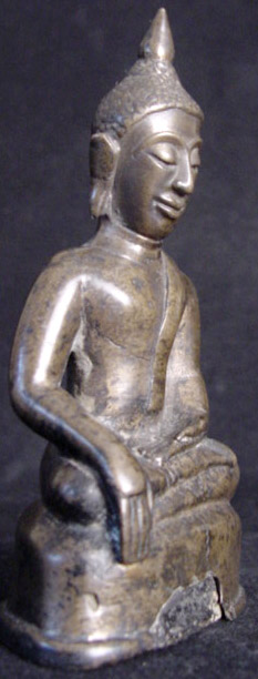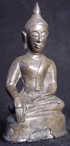 This is an extremely fine Lanna style Thai Buddha: these small refined Buddhas are extremely prized by the Thai people, and often sell for more than much larger examples. This one has an exquisite face that is as good as they get. The casting is excellent, and the surface is as smooth as glass. There is some loss to the base, but the figure is perfect. He sits just over 4 inches tall.