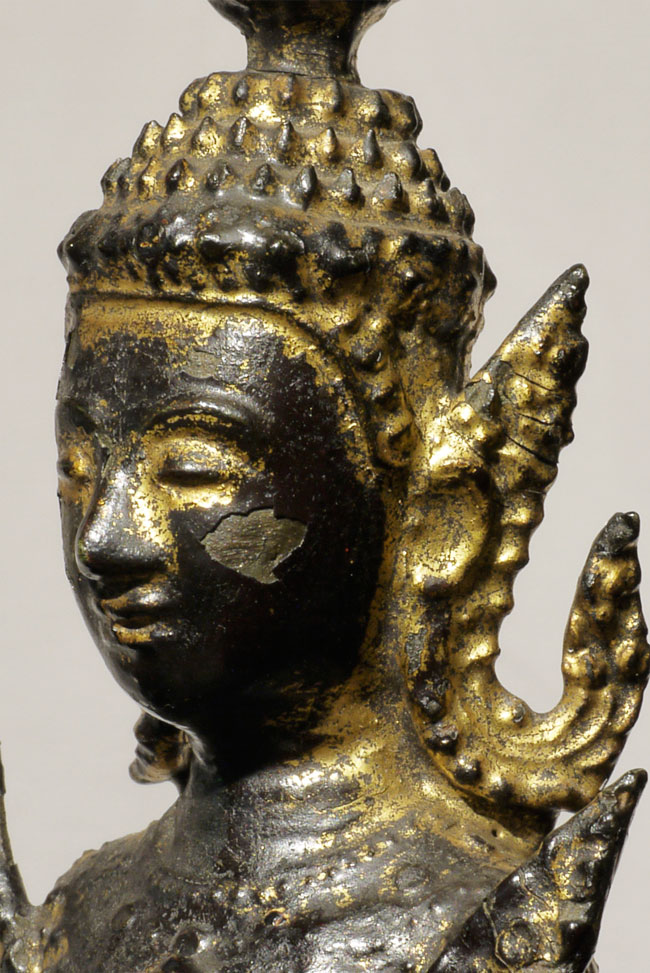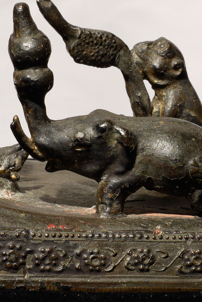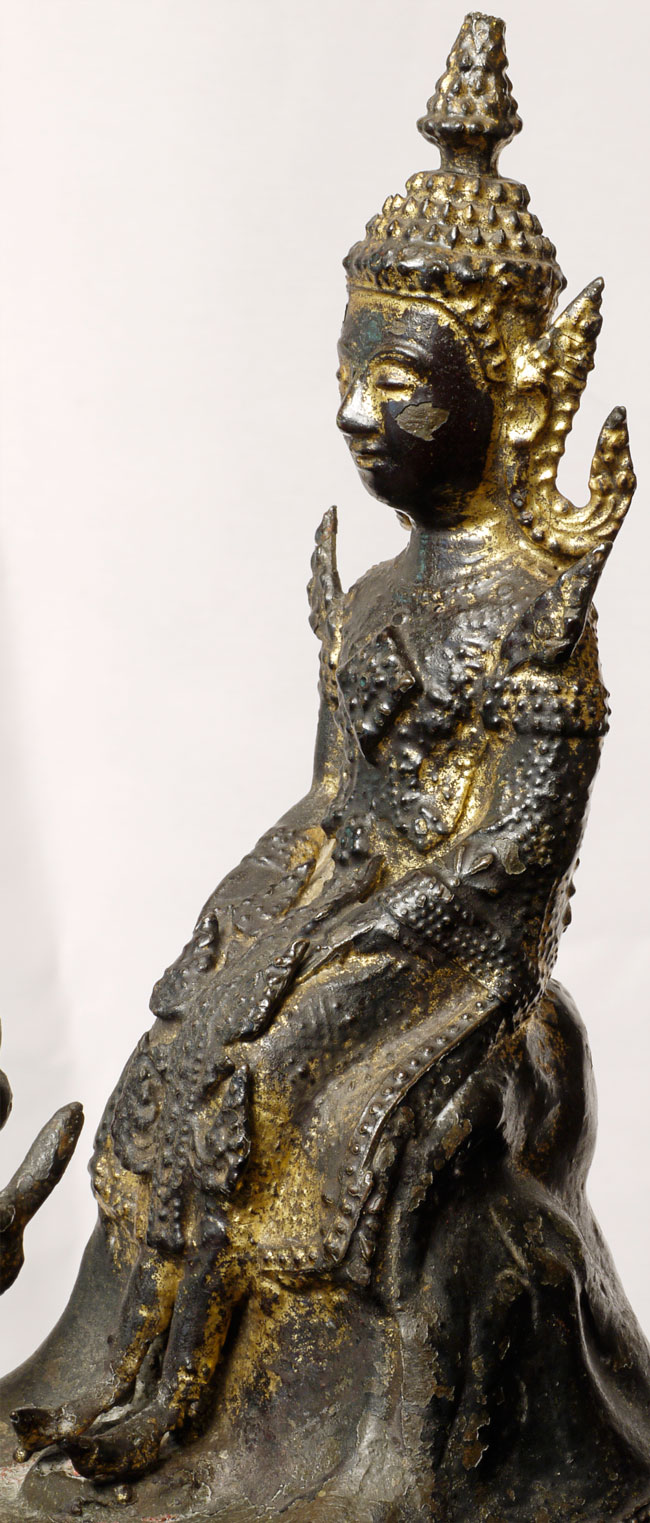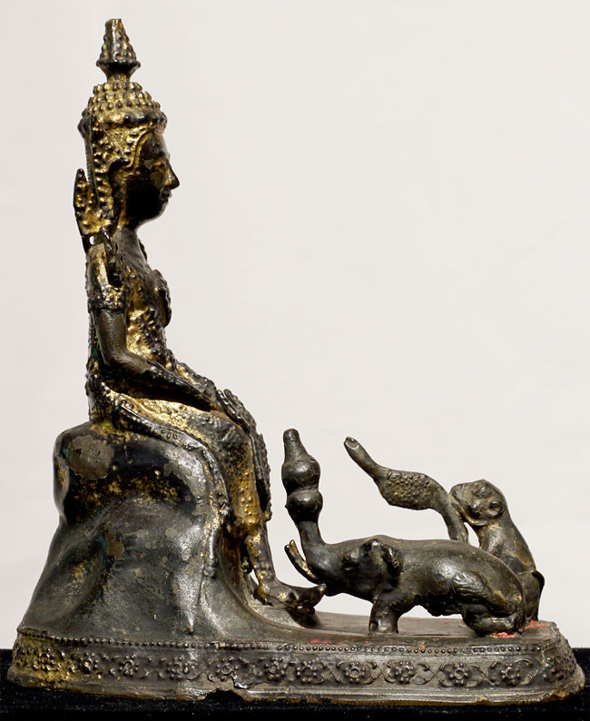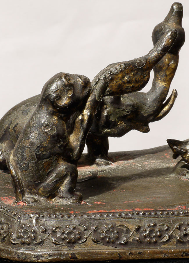 Very nice 19thC Thai Bronze Buddha sitting in the "European" style, with monkey and elephant devotees. 6.25" tall, 5.25" long, 3" wide