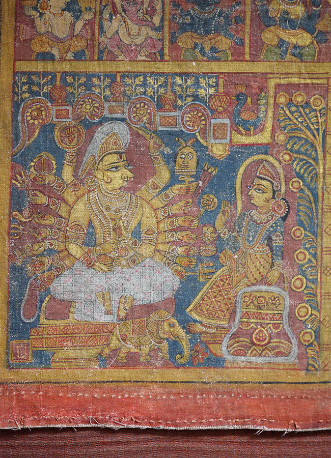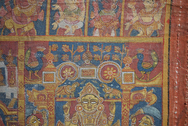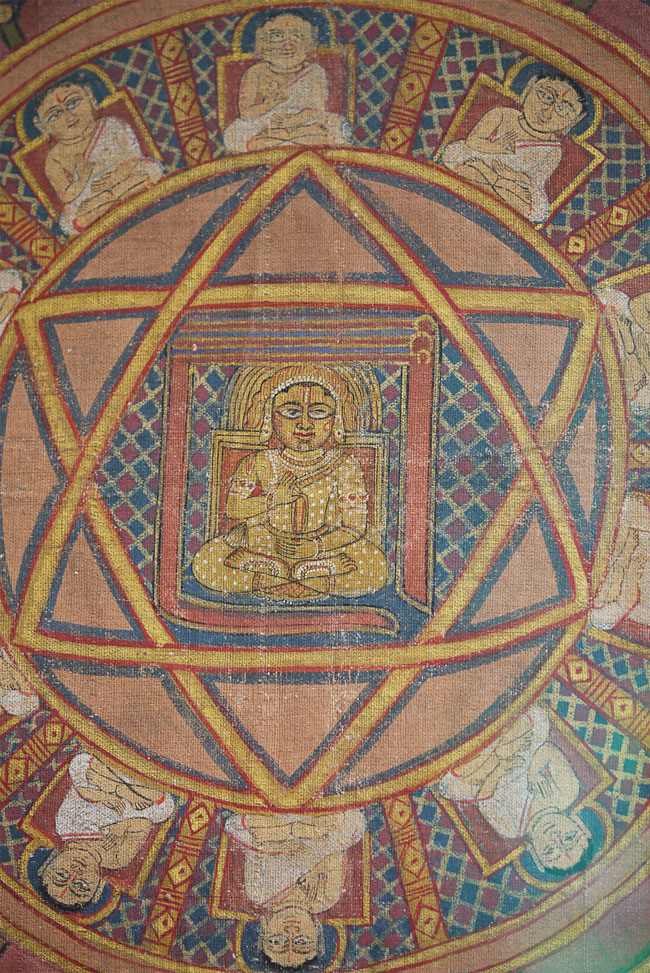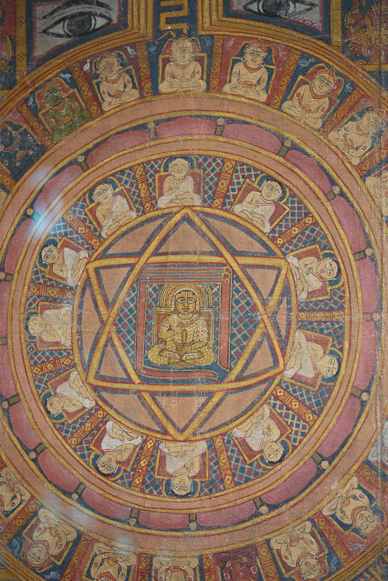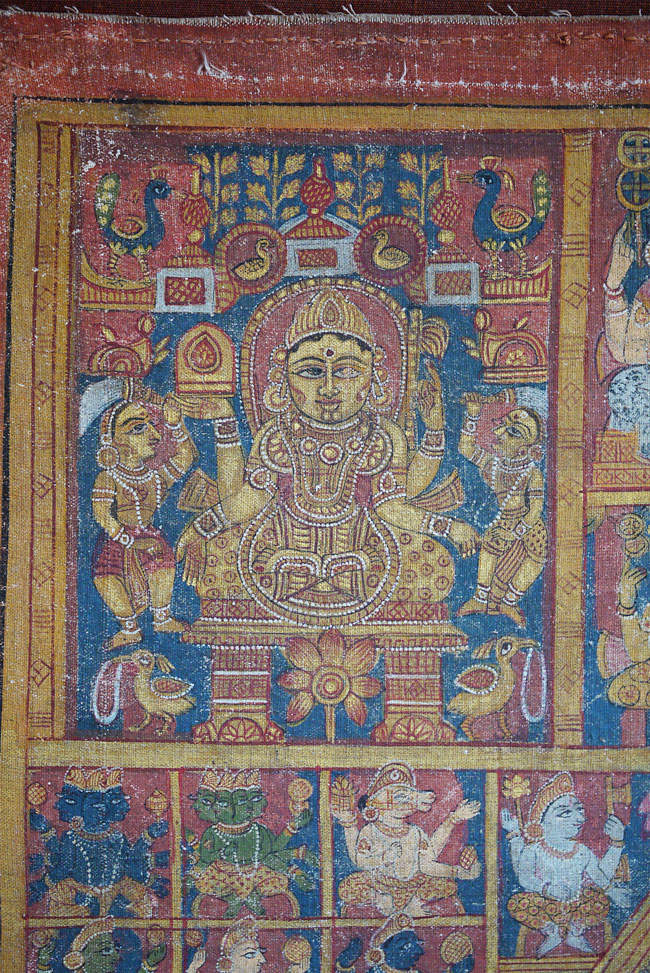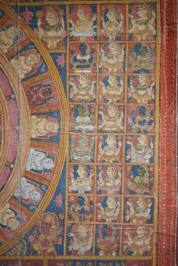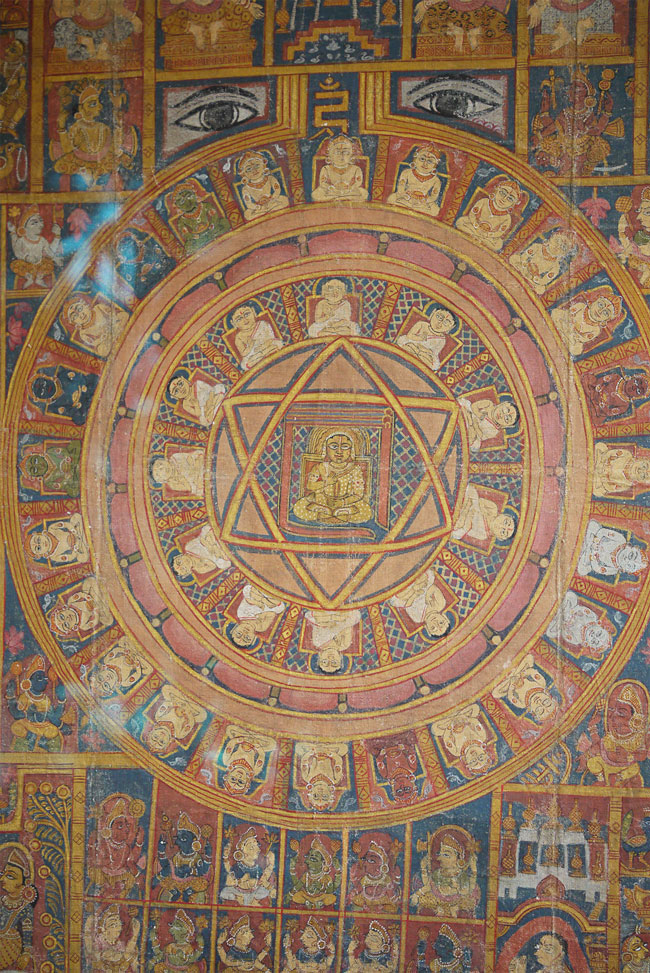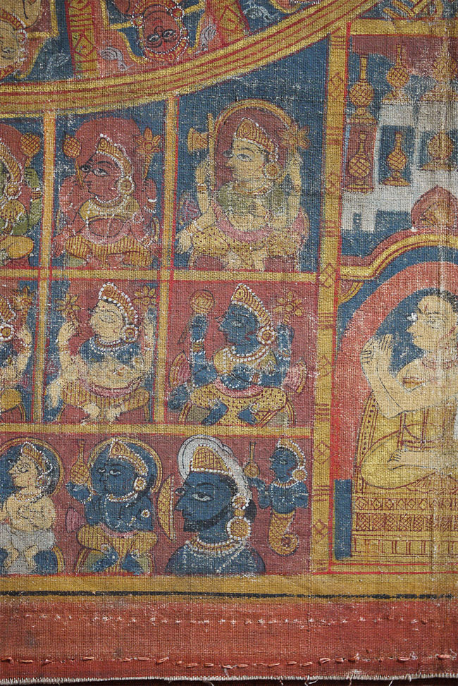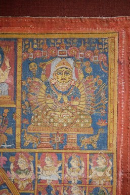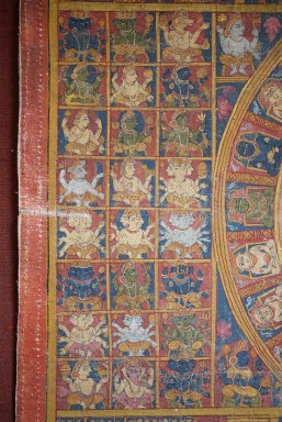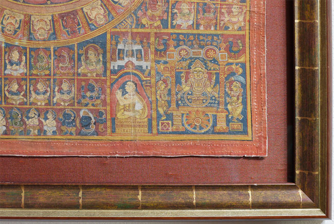 Near masterpiece- 16thC Jain Mandala. Large, well painted example in darkened by time condition, but otherwise exceptional overall preservation. Frame measures 33" x 32". Beautiful - photos can't do it justice. Expensively custom archivally framed for both protection and beauty. Very careful attention was used to make sure the colors worked perfectly and that the frame and background complemented the overall design completely. I took it to 5 different frame shops over a 3 month period until I found the perfect combination of red Thai hands spun nubby silk, wood framing with the multiple colors and lines in it that perfectly went with the patterns and colors in the piece, and a master framer who has respect and the focus to do the piece right.