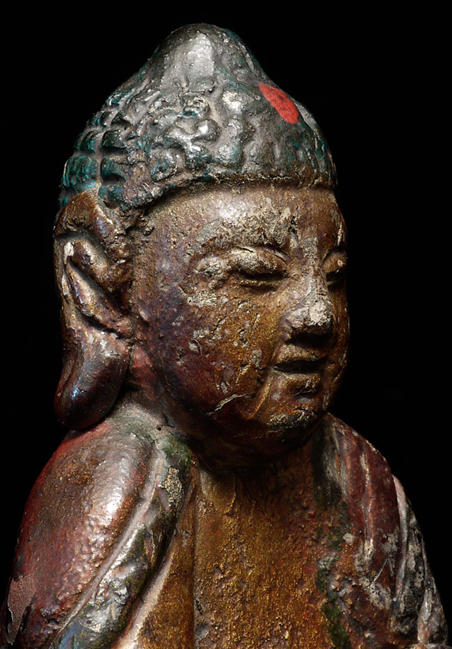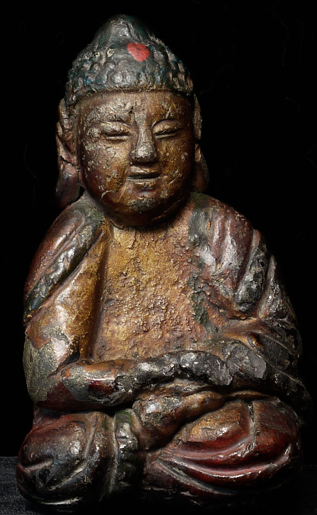Unusual old Chinese Buddha. Not sure if it is sandstone or a cast material. Sits leaning to one side. 5.25" tall