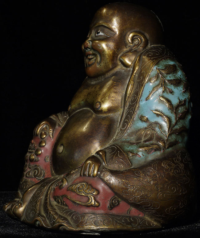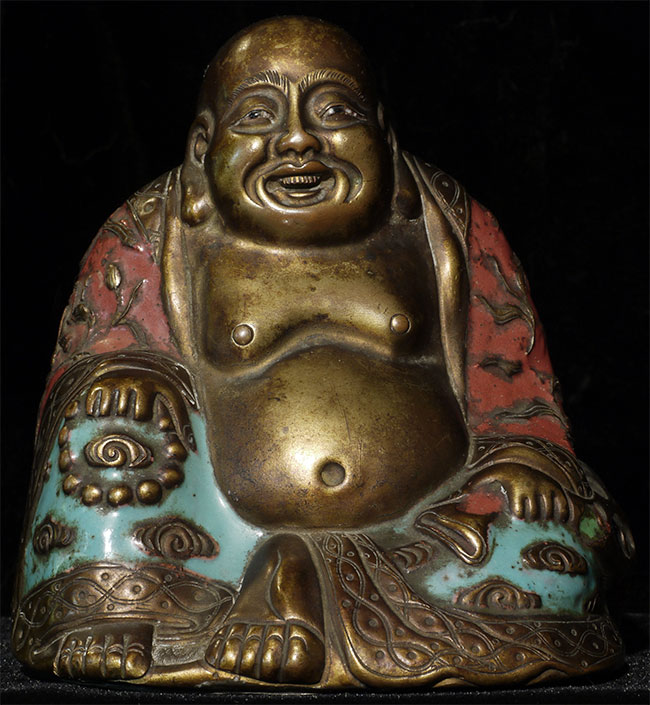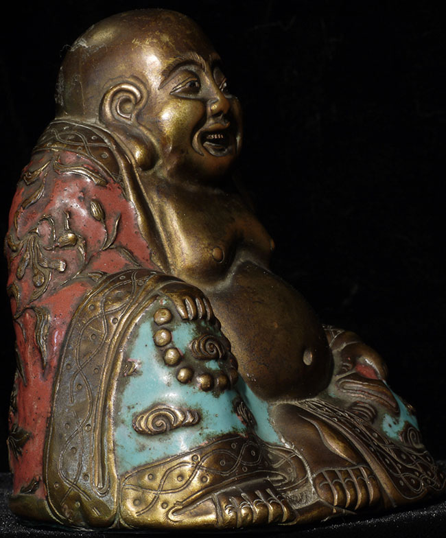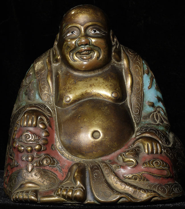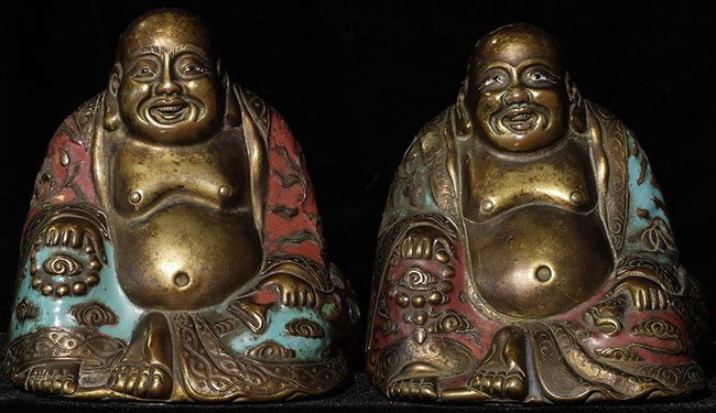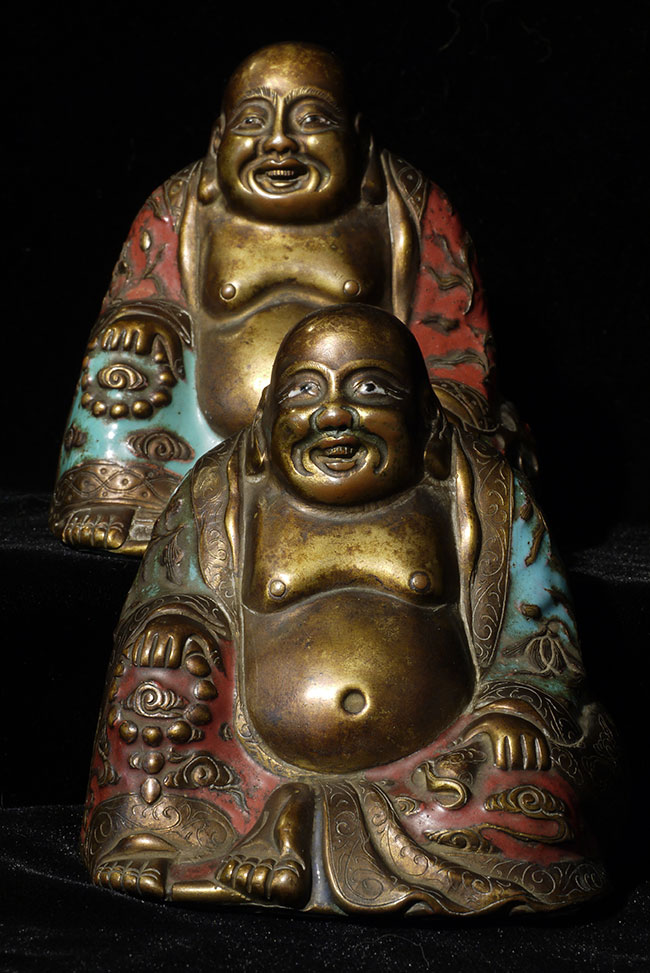 A pair rare pair of copper repousse Hotai with enamel decoration. Late 18thC from the Chien Lung period (late 18thC). Have an old price tag of 3,000 for the pair. Great personality- they almost seem alive. Each sits 4.25" tall. Bottom of one partially missing, otherwisw no damage or repair.
