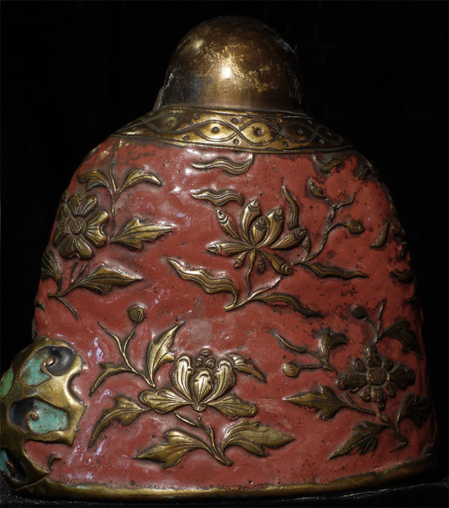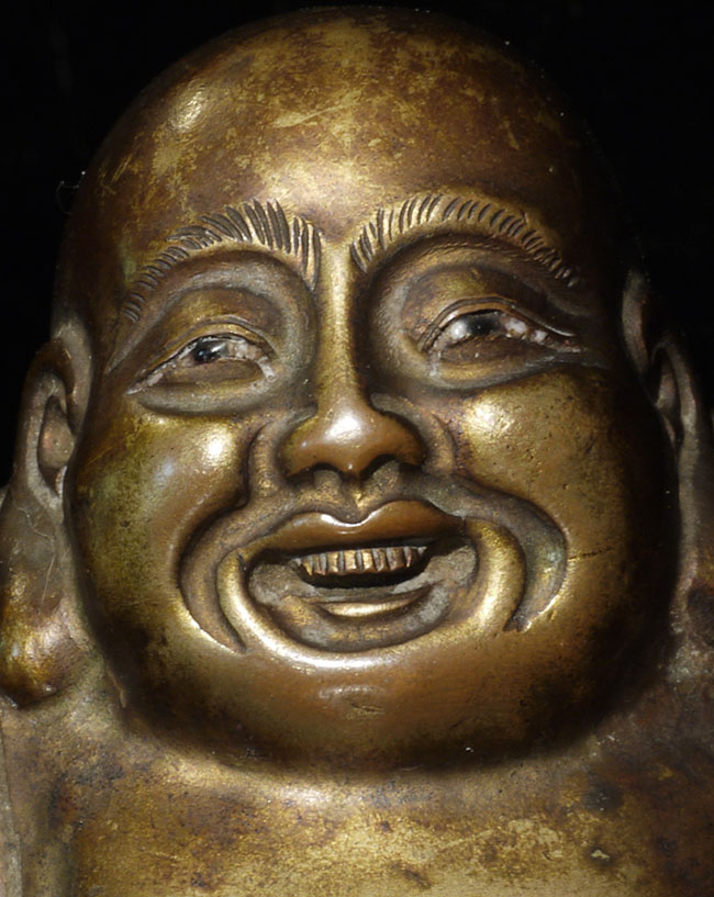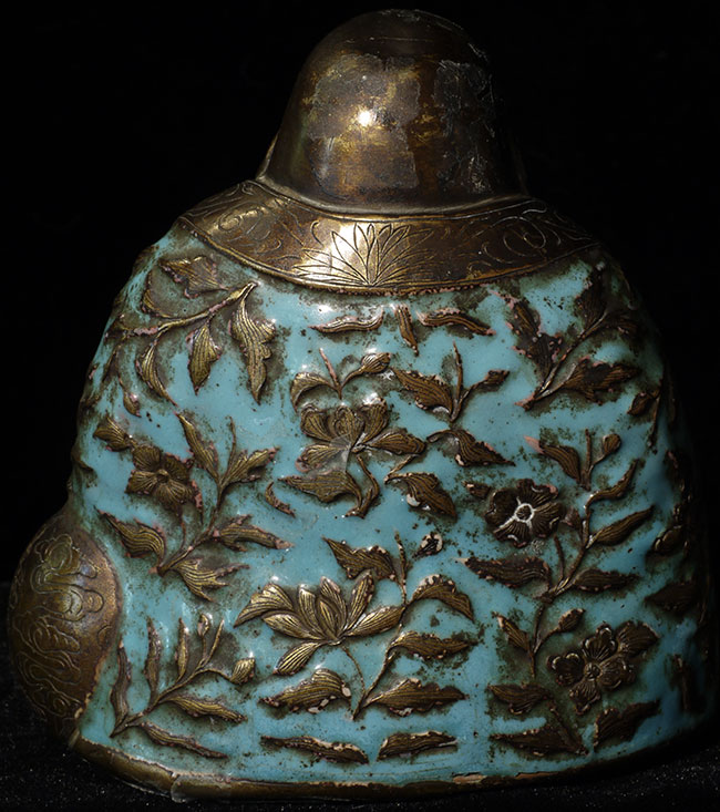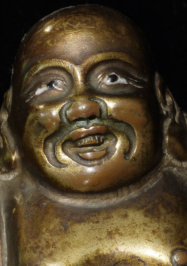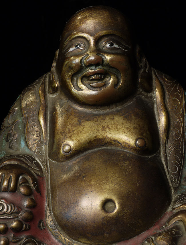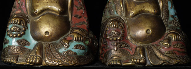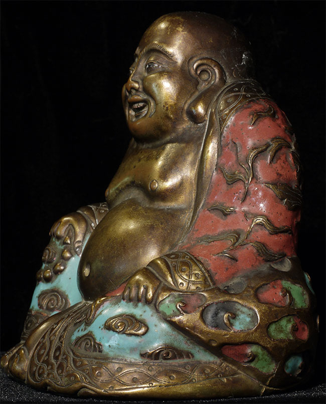 A pair rare pair of copper repousse Hotai with enamel decoration. Late 18thC from the Chien Lung period (late 18thC). Have an old price tag of 3,000 for the pair. Great personality- they almost seem alive. Each sits 4.25" tall. Bottom of one partially missing, otherwisw no damage or repair.