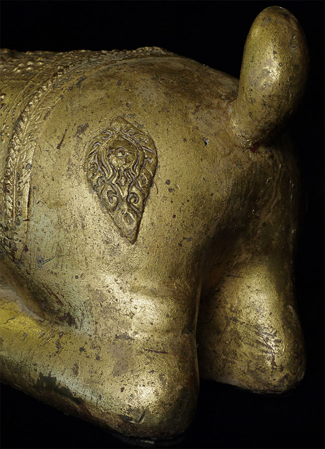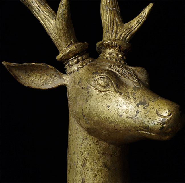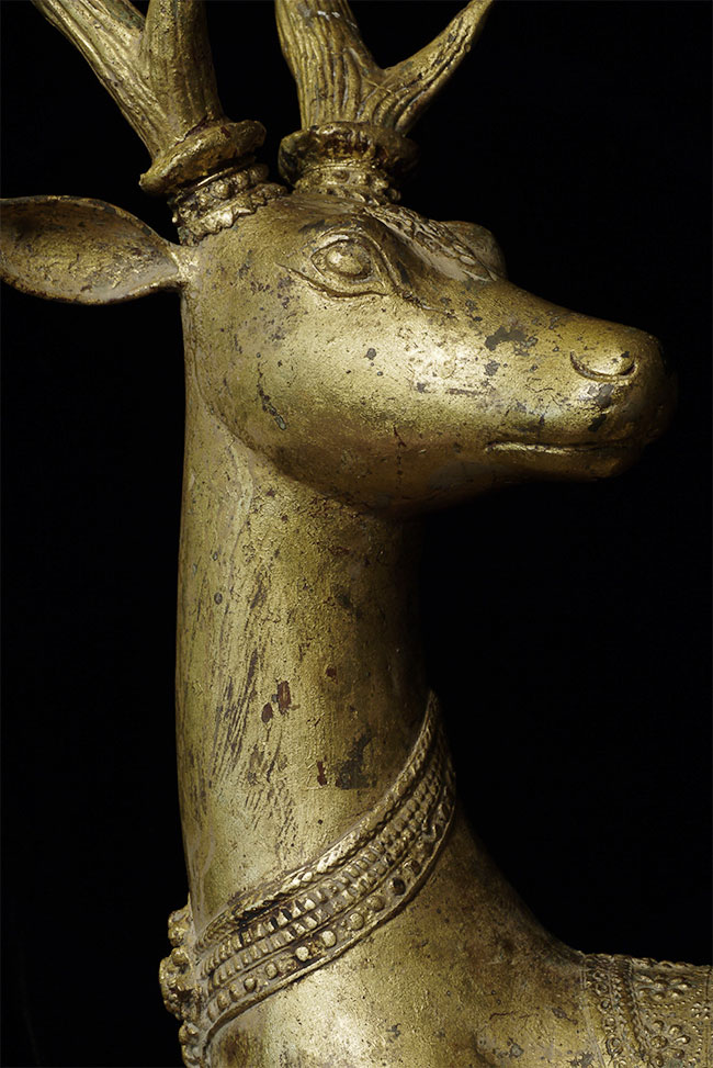 Large 19thC Thai bronze deer. Quite large at approximately 17" high, 19" long, and 5" wide. Has the traditional Rattanakosin style design on the top of its back. Probably originally a pair.